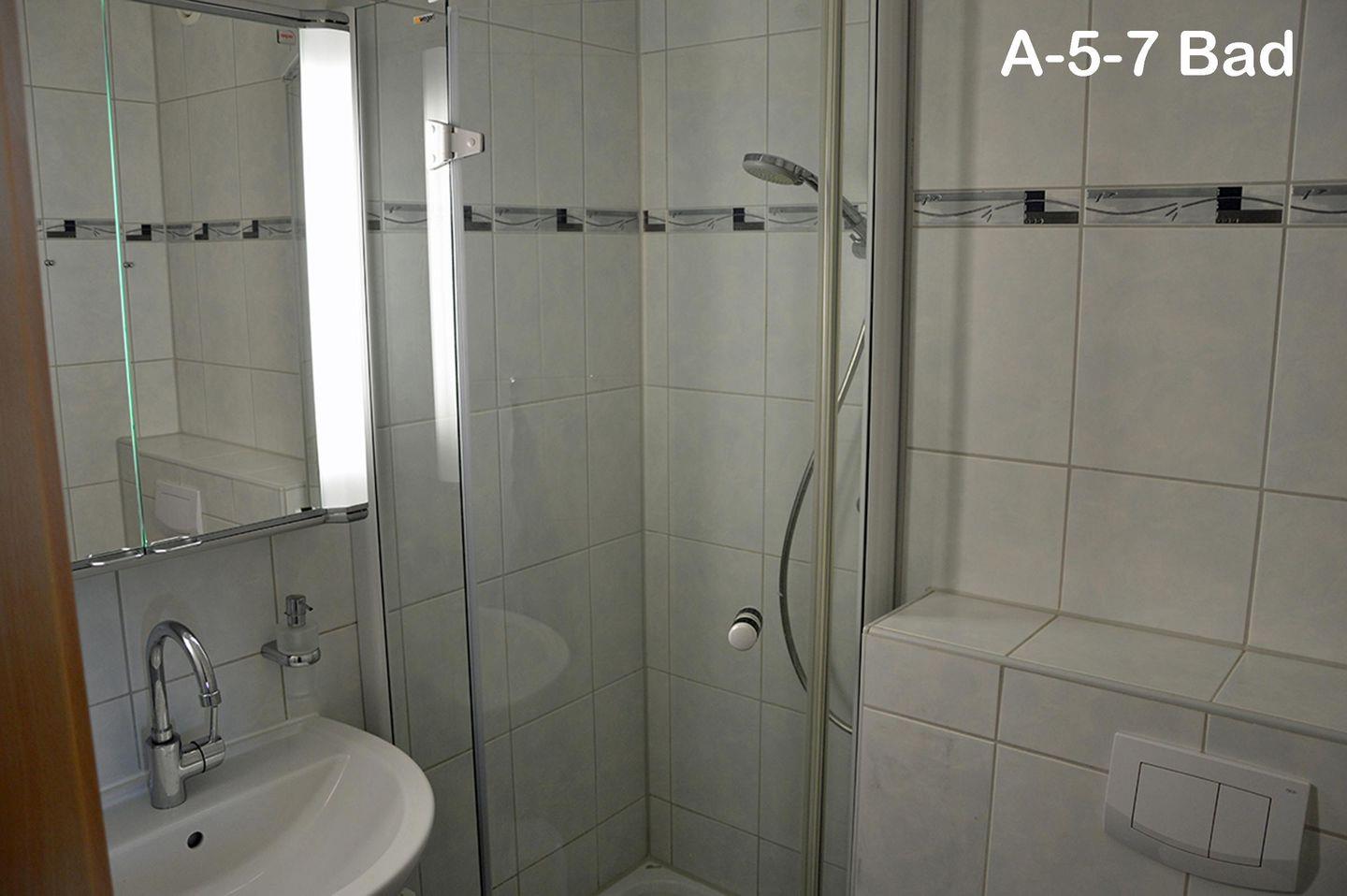 Das innenliegende Duschbad wurde 2015 saniert und mit Glasduschwand, Waschbeckenunterschrank sowie beleuchtetem Spiegelschrank ausgestattet.