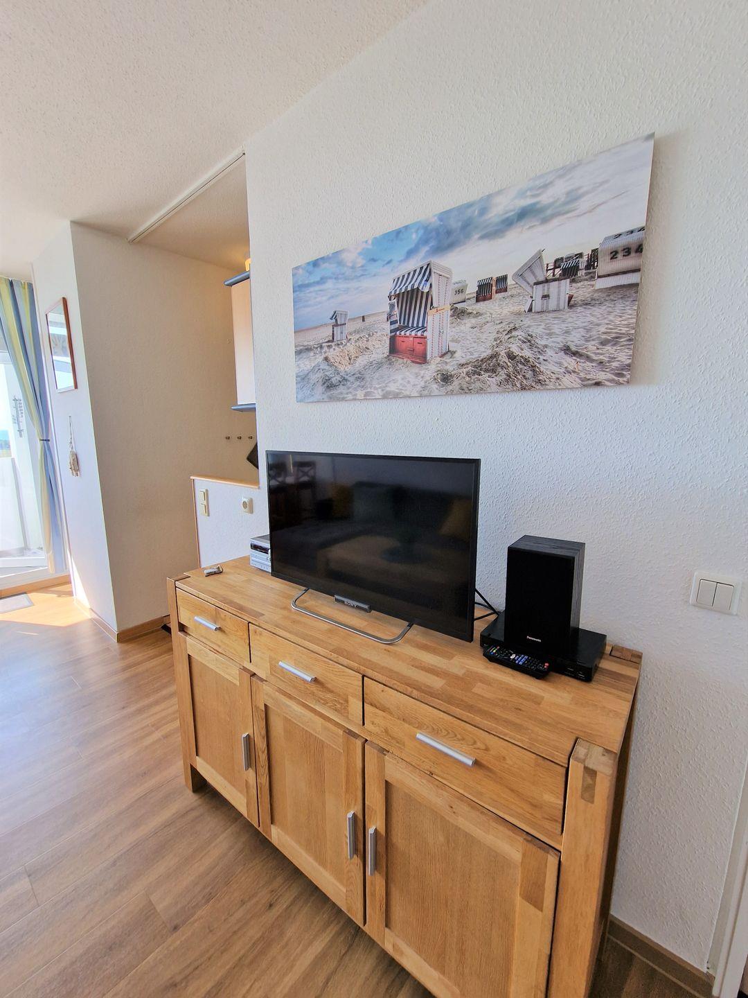 Helle und gemütliche Ferienwohnung mit kombiniertem Wohn- und Schlafbereich und gemütlichen Sitzgelegenheiten sowie Flachbild-TV.