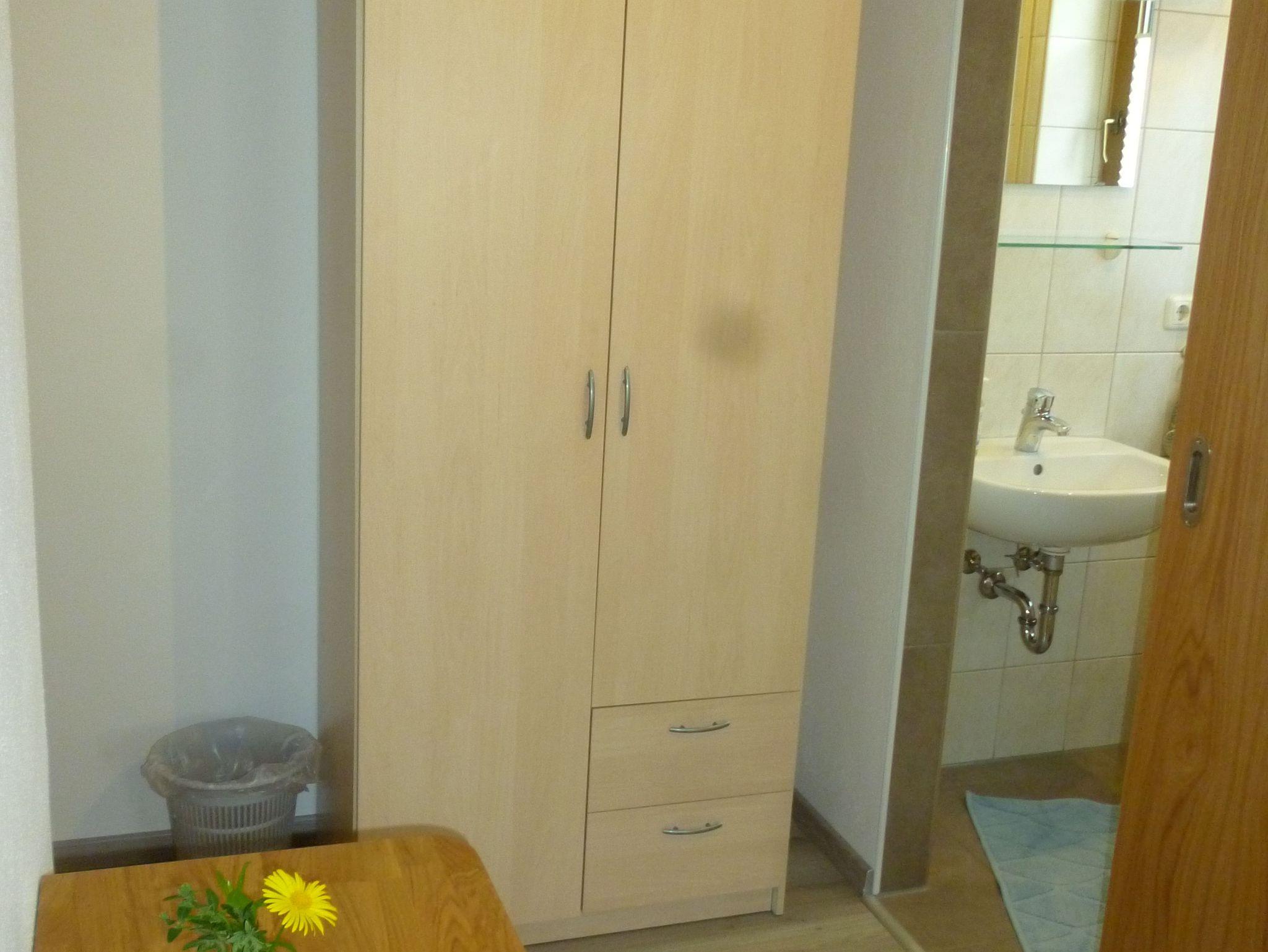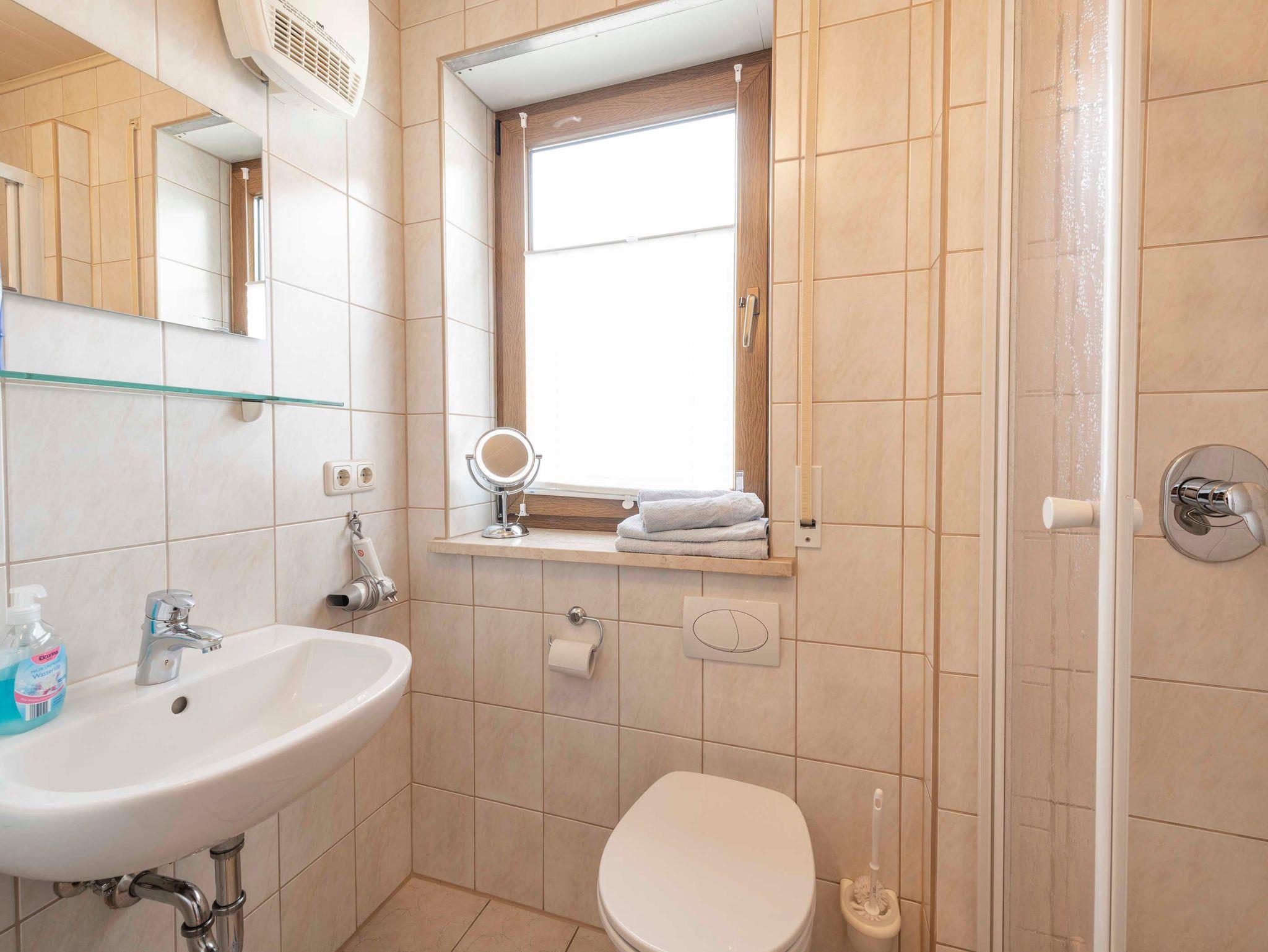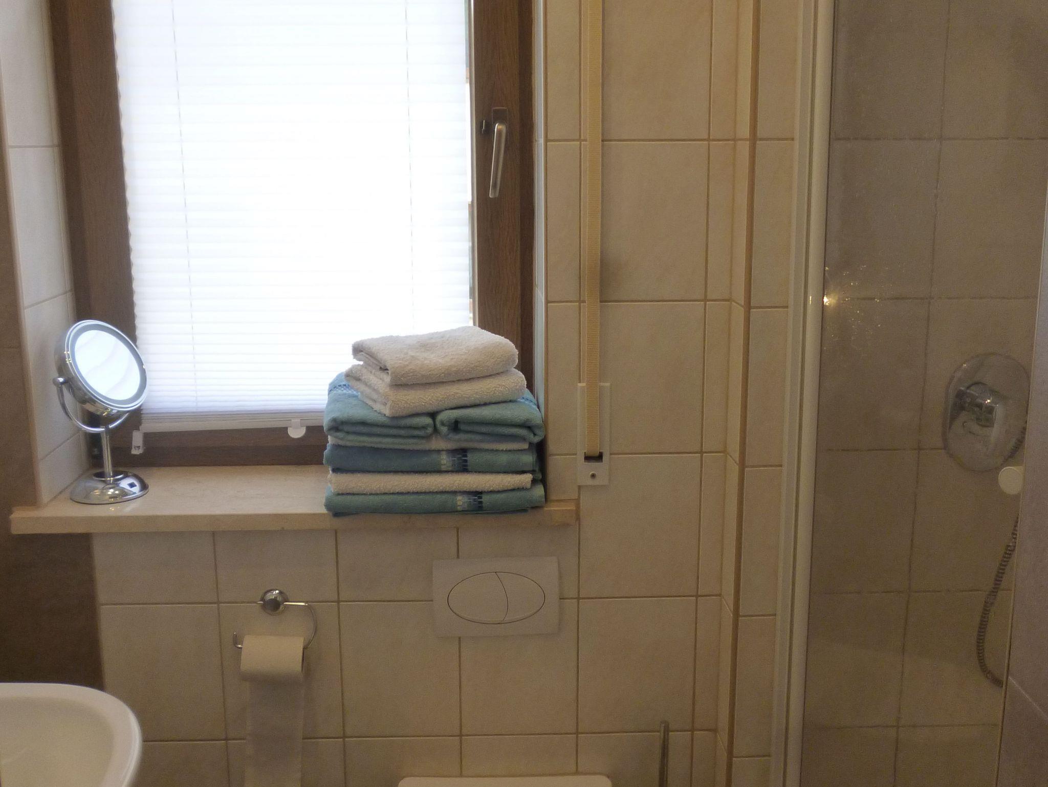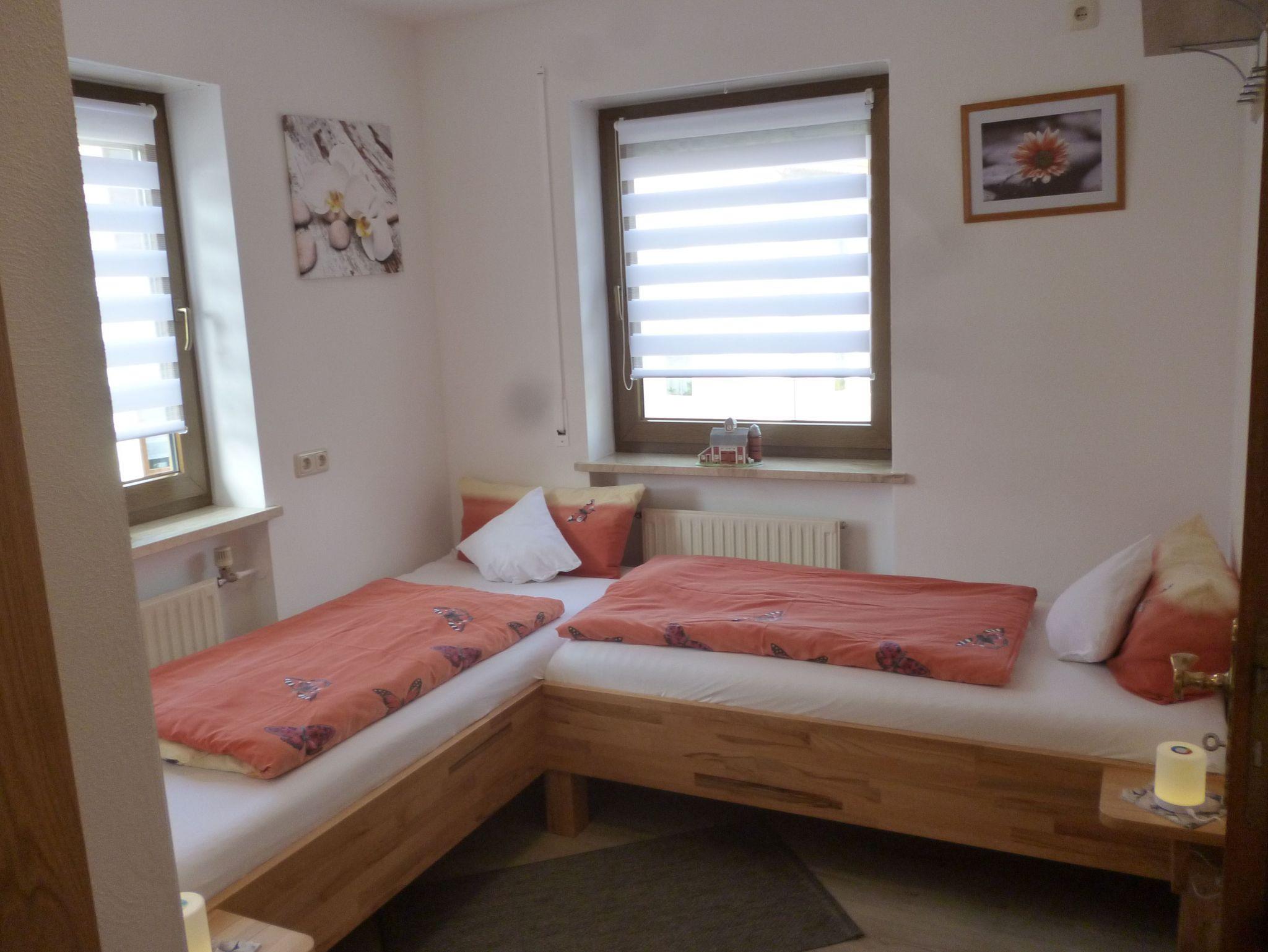 Mehrbettzimmer mit Frühstück im 2. Stockwerk (nur über Treppe erreichbar) mit 180x200er und 2x90x200 Bett, Laminat. Dazu gehört eine geflieste Dusche und WC. Reichhaltiges Frühstückbuffet inklusive. Parkplätze und E-Ladestation (Wallbox) am Haus vorhanden.