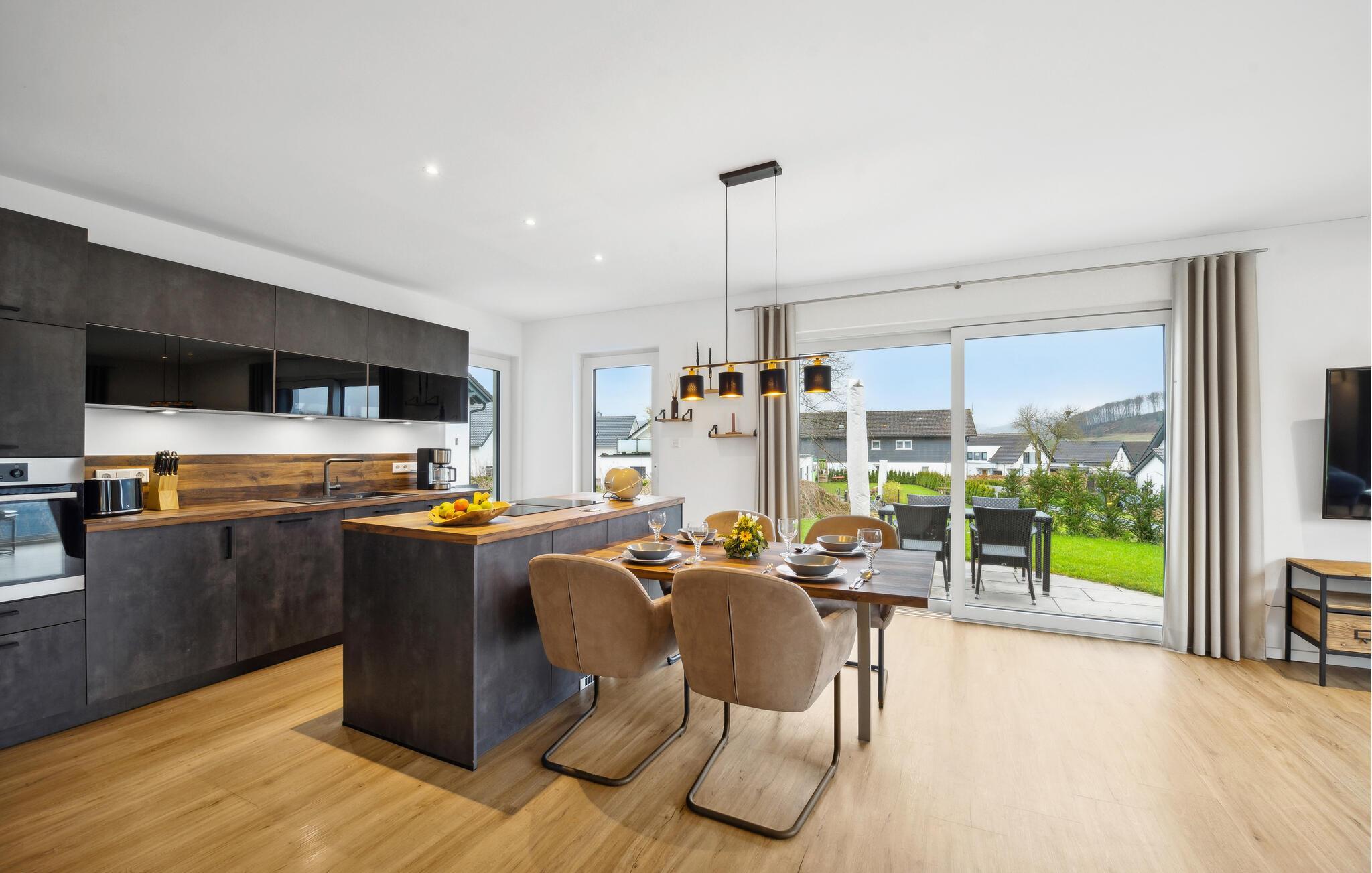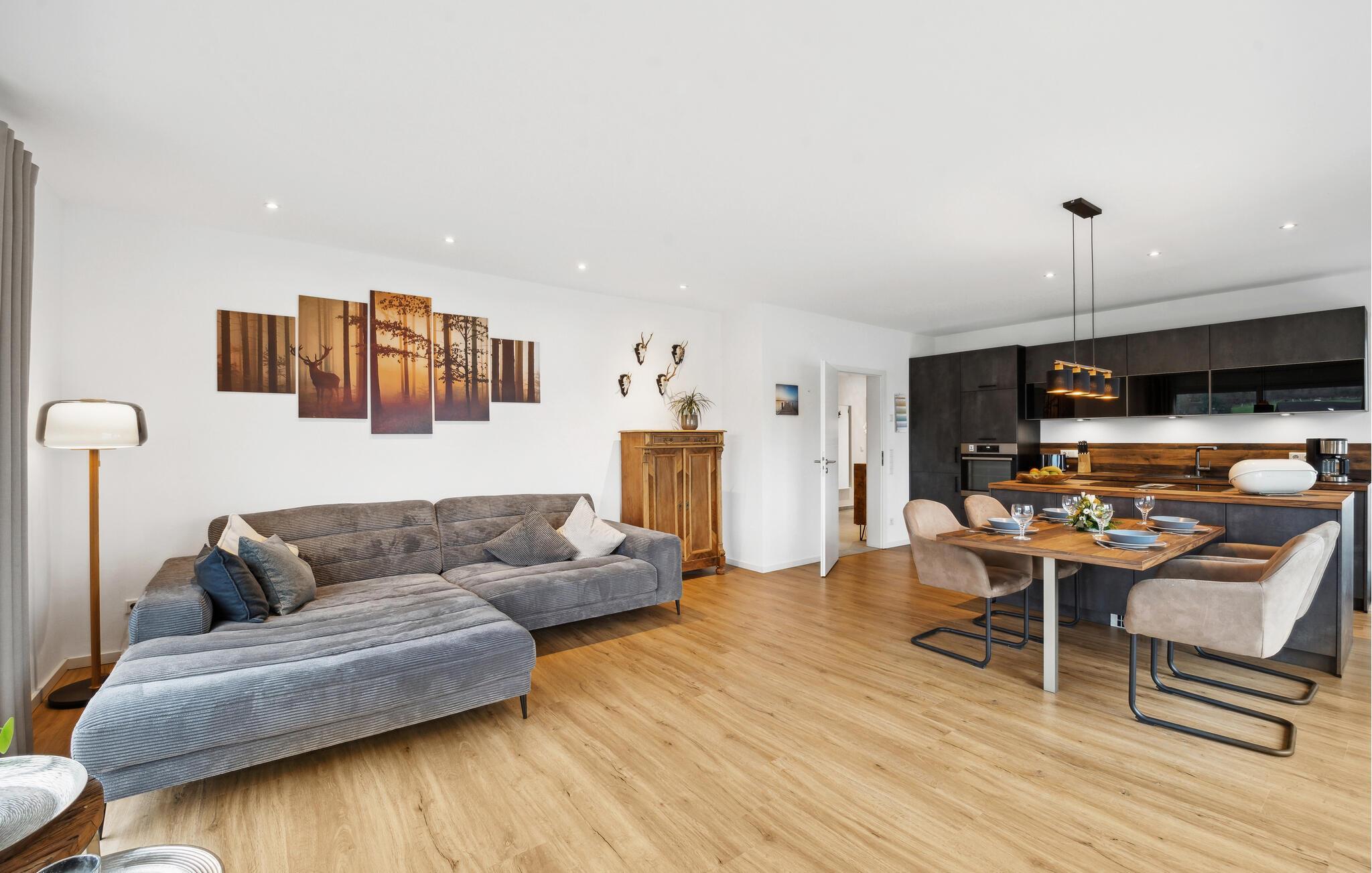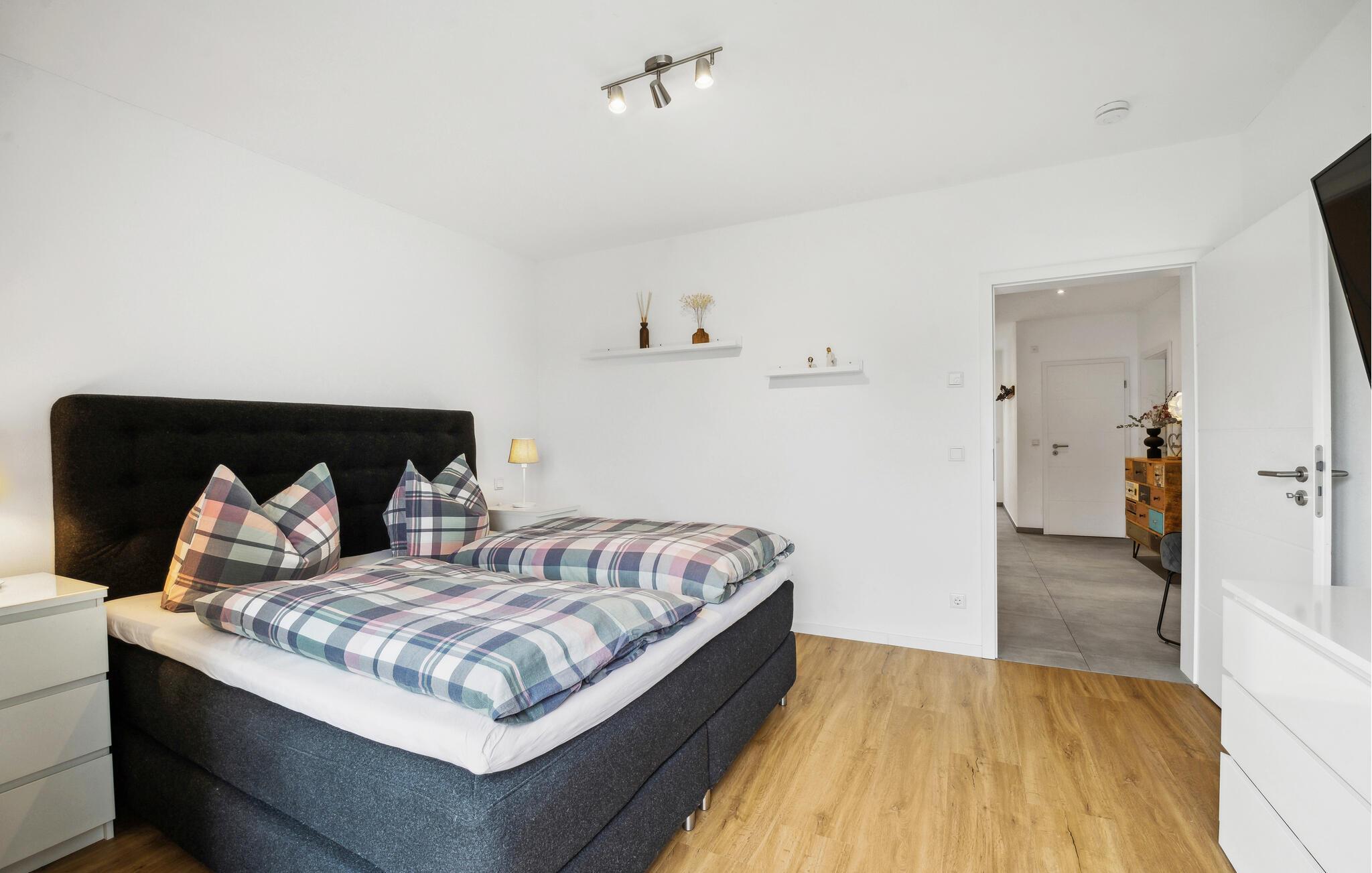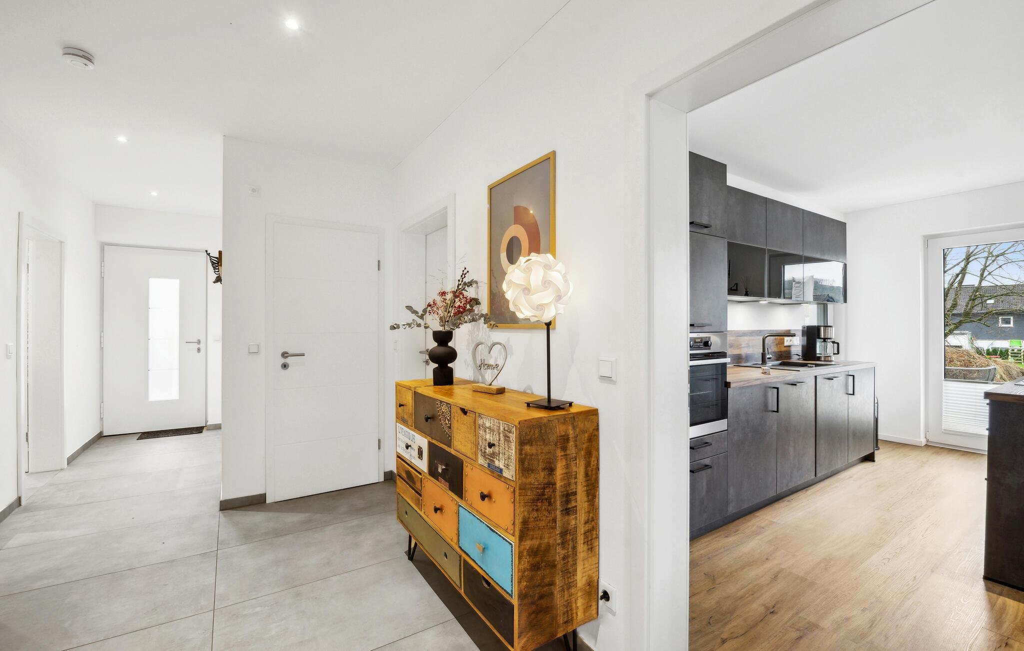 I denne indbydende bolig får I alt, I behøver til nogle dejlige uger i det vestlige Tyskland. Indretningen fremtræder lyst og venligt med flotte detaljer og gulv-til-loft-vinduer, der giver et lækkert lysindfald og udsigt til omgivelserne. I den åbne stue kan I tage jer god tid til tingene og gøre madlavningen til et hyggeligt fælles projekt, inden I runder aftenen af med brætspil eller en god film i sofaen.