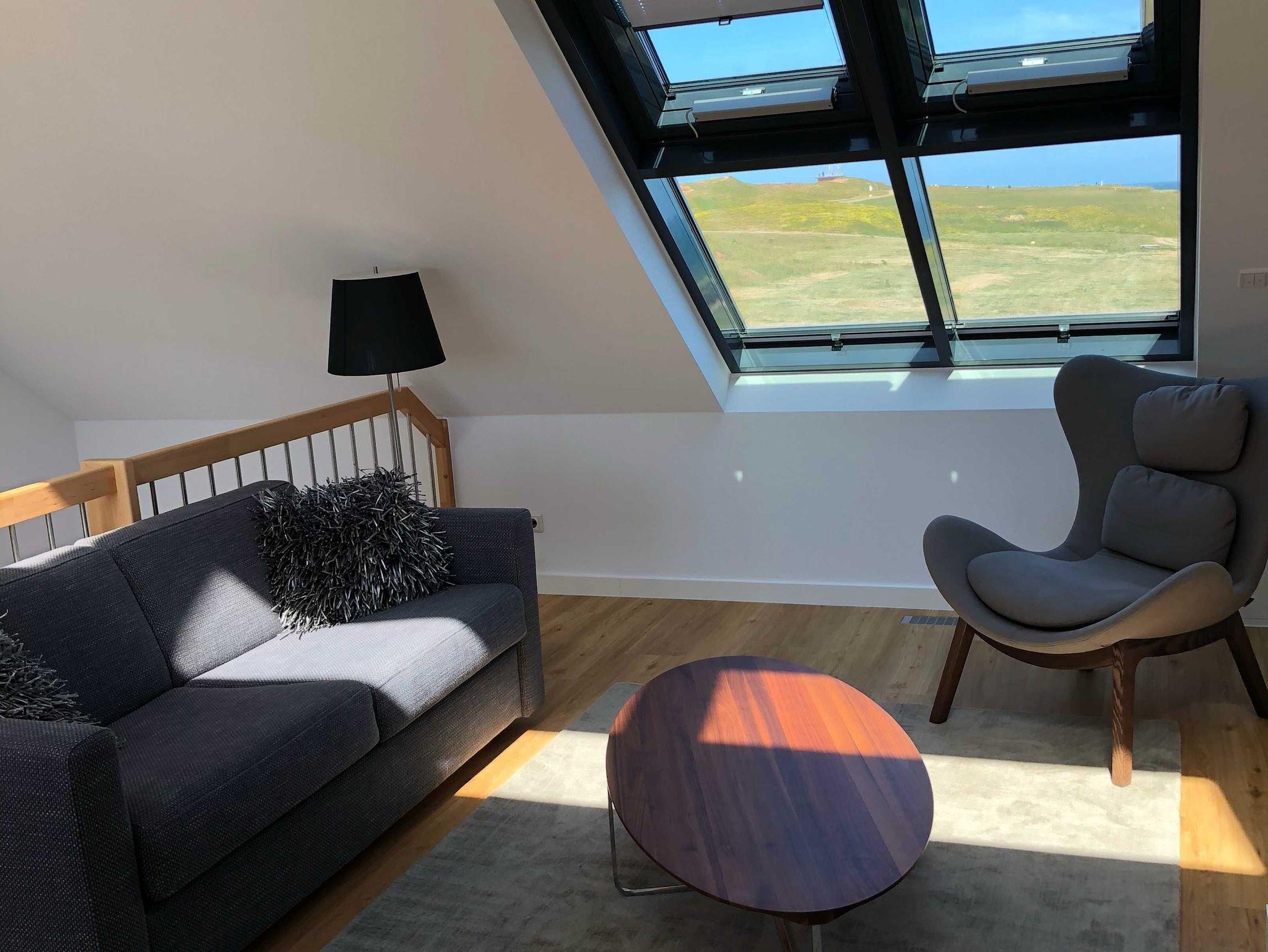 Blick auf die Nordsee durch das Panoramadachfenster und Zugang zur Dachterrasse mit Blick auf den Leuchtturm und die Düne.