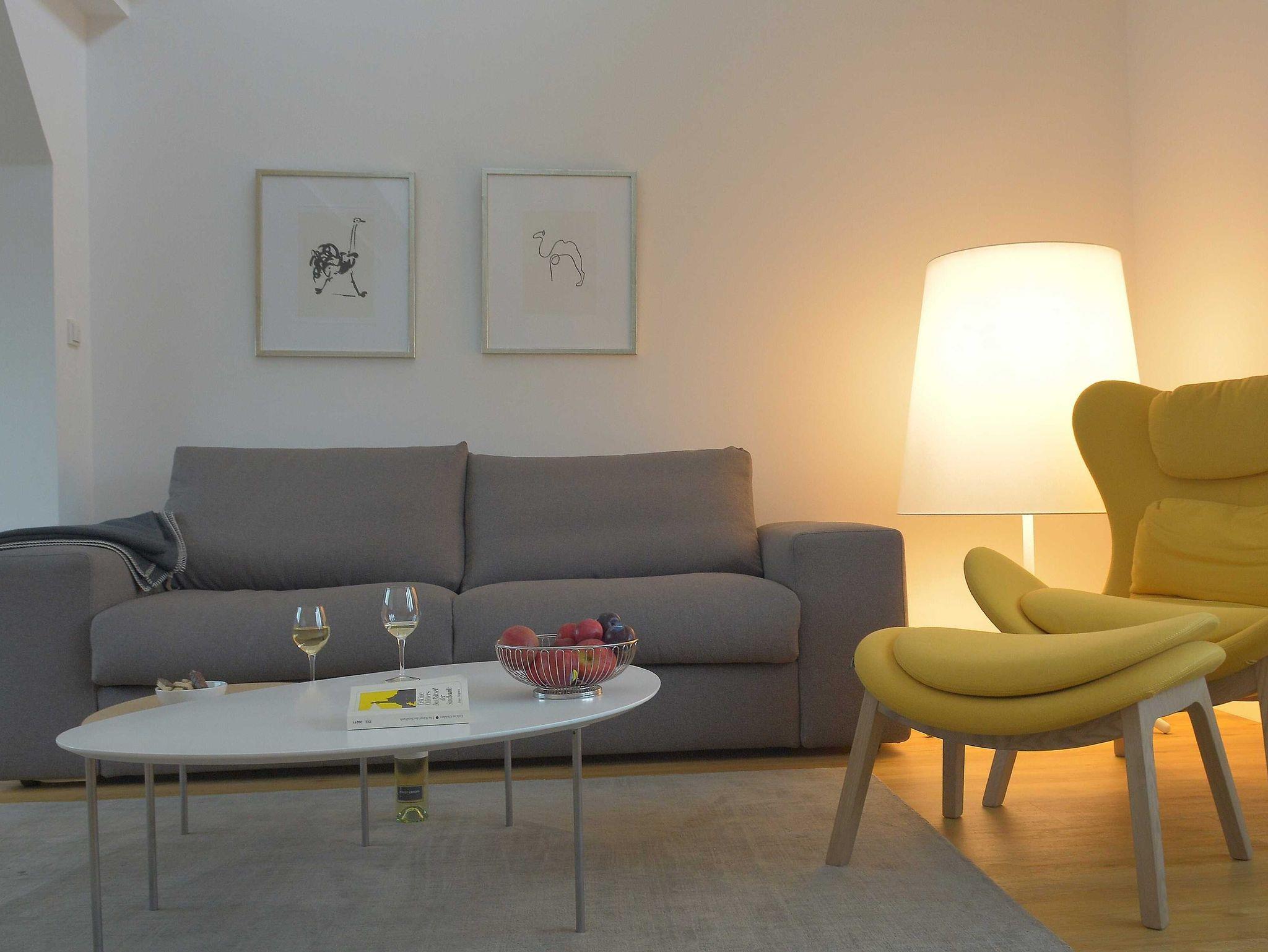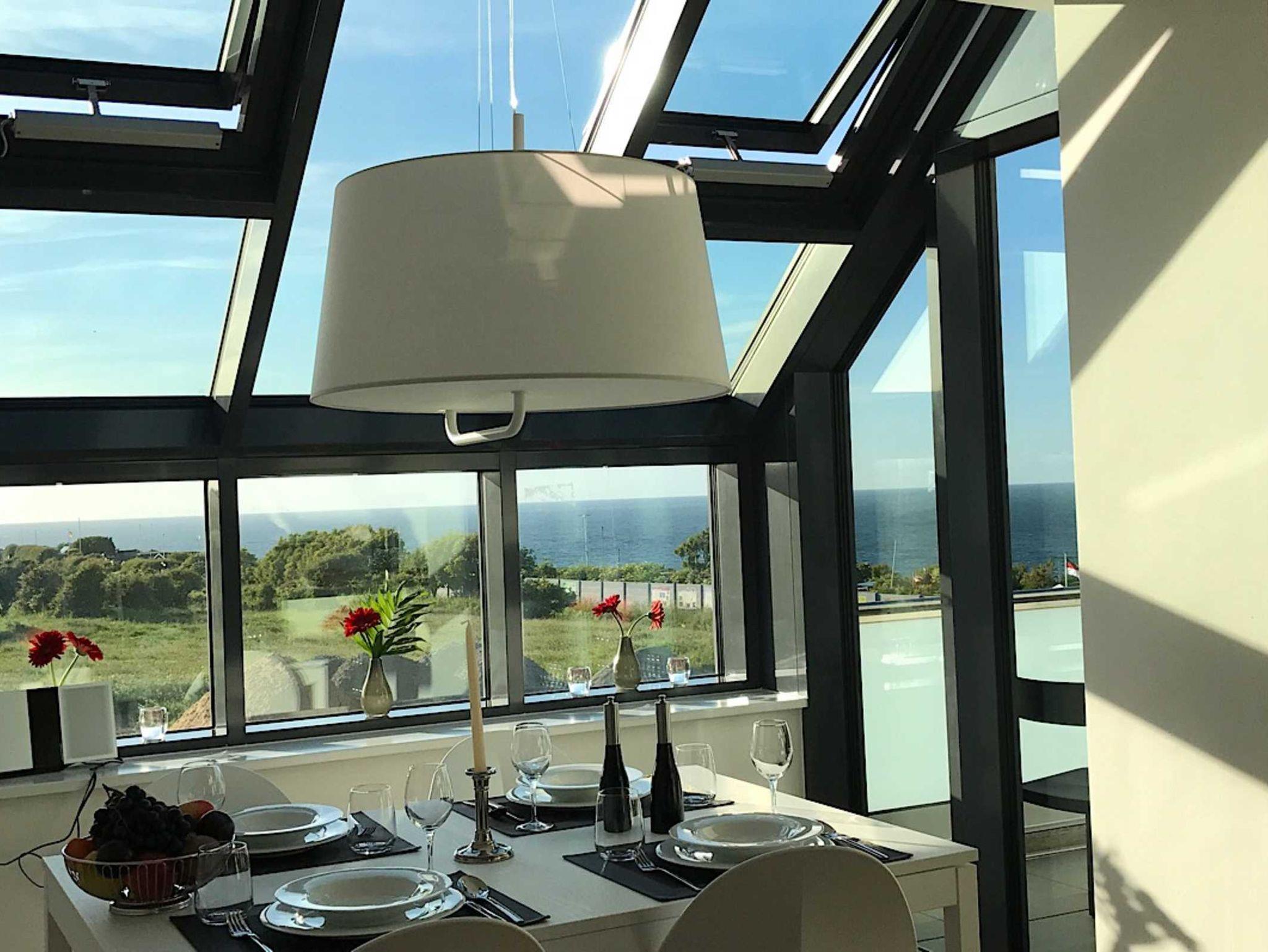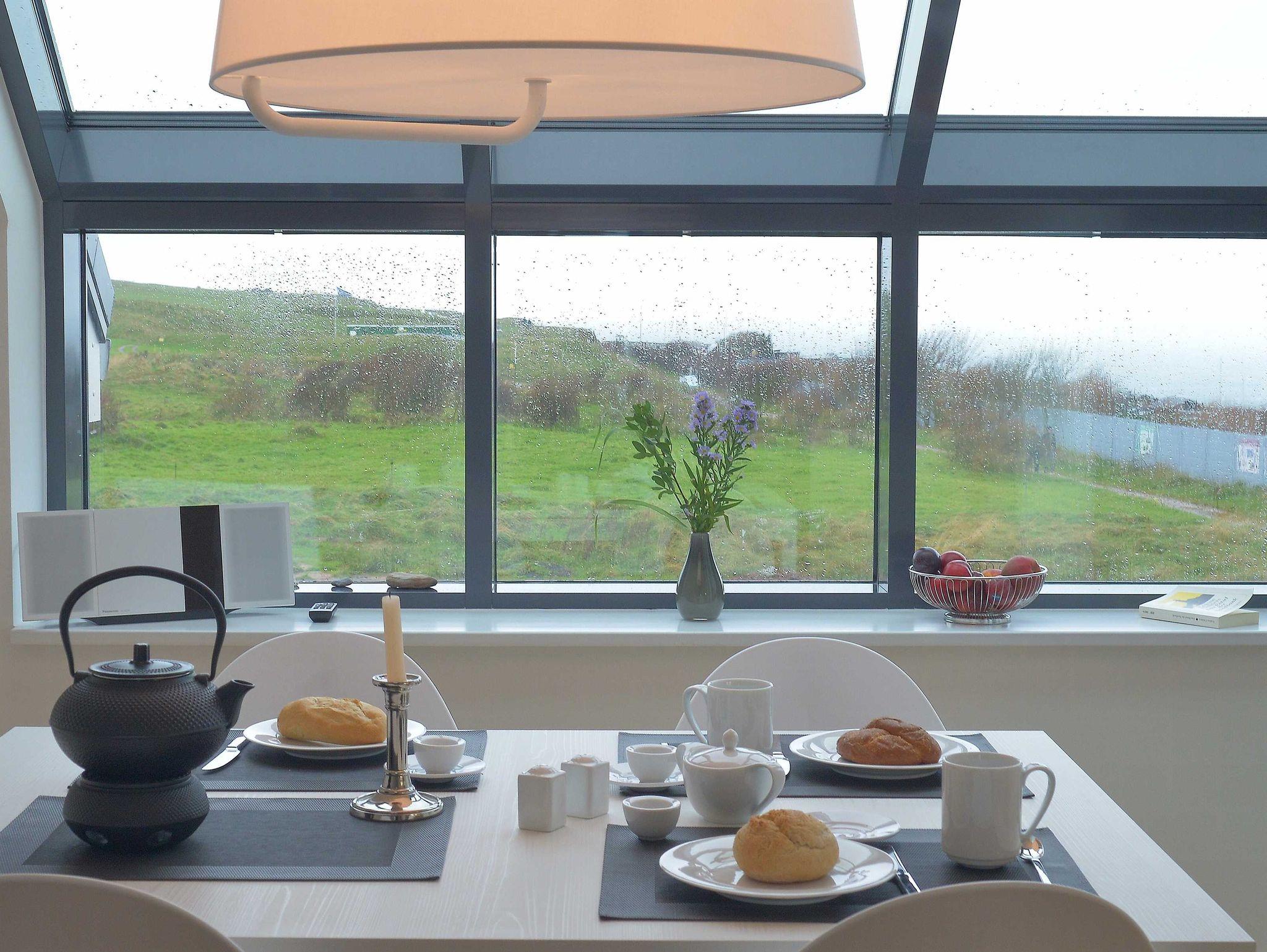 Die luxuriöse Wohnung hat ca. 70 qm Wohnfläche und verfügt in der unteren Etage über eine komplett ausgestattete Küche mit Geschirrspüler und Zugang zum Balkon, einen großzügigen Essbereich und Blick auf das Meer und ins Grüne. Bad mit Dusche und WC, Schlafzimmer mit einem komfortablen Doppelbett. Im Studio in der oberen Ebene befindet sich ein Wohn/Schlafbereich mit Blick auf die Nordsee durch das Panoramadachfenster und Zugang zur Dachterrasse mit Blick auf den Leuchtturm und die Düne. WLAN, TV und Radio/Dockingstation sehen zur Verfügung. Bettwäsche und Handtücher sind inklusive und werden bei längeren Aufenthalten gewechselt. Es stehen Waschmaschinen und Trockner gegen Gebühr (Münzgeräte) im Untergeschoss zur Verfügung