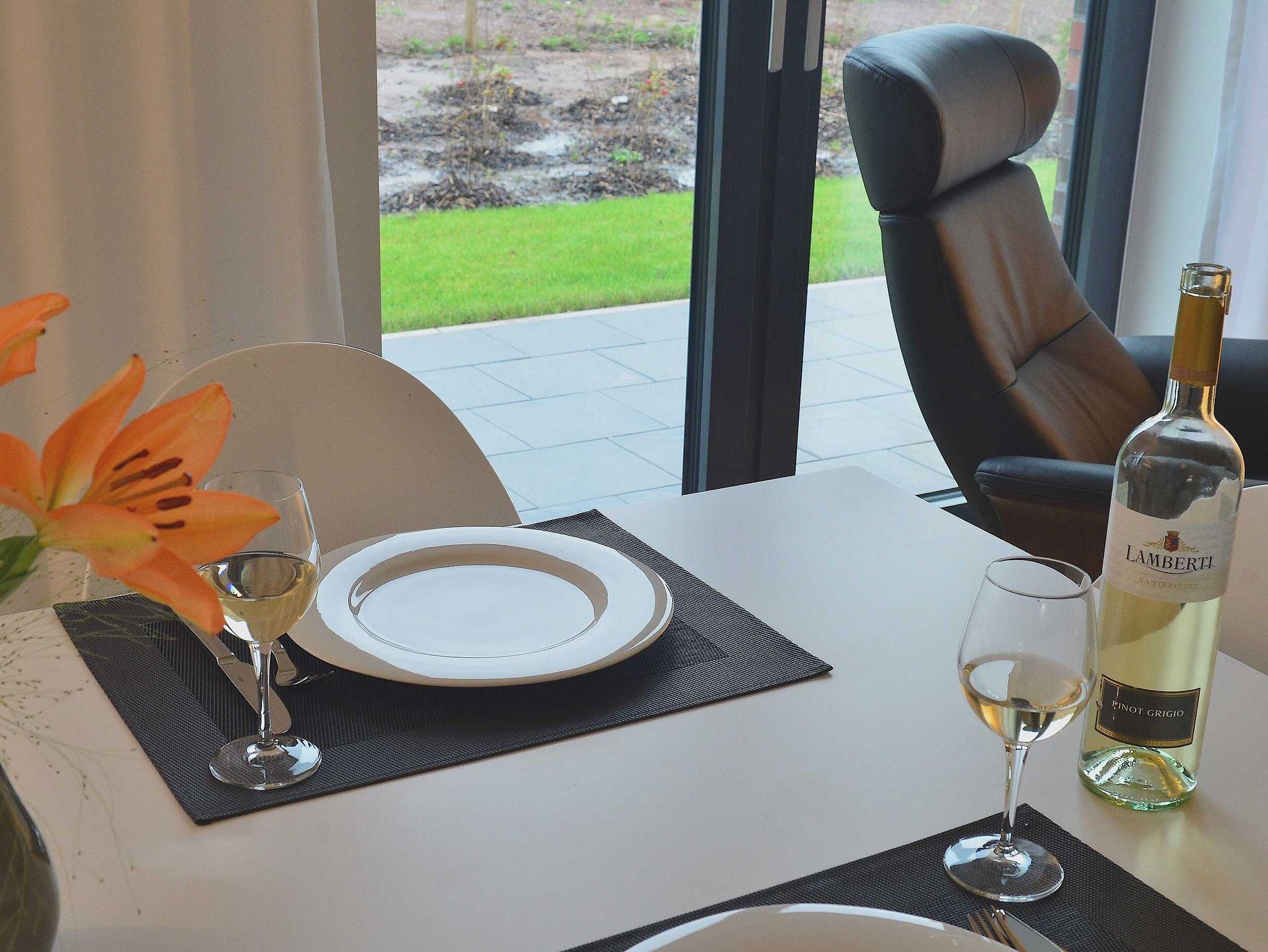 Die luxuriöse Wohnung hat ca. 55 qm Wohnfläche und befindet sich im Erdgeschoss. Der Wohnbereich mit offener, komplett ausgestatteter Küche und Essplatz hat einen Zugang zur Terrasse und einen unverbauten Blick auf die Nordsee und das grüne Oberland. Eine zweite Terrasse befindet sich auf der südlichen Sonnen-Seite der Wohnung.