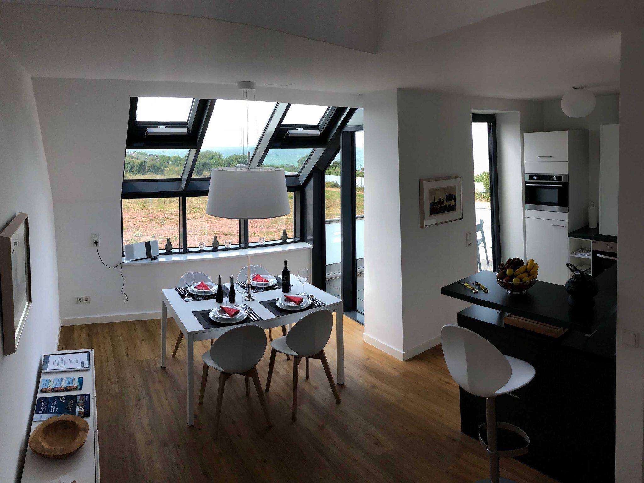 Die luxuriöse Wohnung hat ca. 70 qm Wohnfläche und verfügt in der unteren Etage über eine komplett ausgestattete Küche mit Geschirrspüler und Zugang zum Balkon, einen großzügigen Essbereich und Blick aus Meer und ins Grüne. Bad mit Dusche und WC, Schlafzimmer mit einem komfortablen Doppelbett. Im Studio in der oberen Ebene befindet sich ein Wohn/Schlafbereich mit Blick auf die Nordsee durch das Panoramadachfenster und Zugang zur Dachterrasse mit Blick auf den Leuchtturm und die Düne. WLAN, TV und Radio/Dockingstation sehen zur Verfügung. Bettwäsche und Handtücher sind inklusive und werden bei längeren Aufenthalten gewechselt.