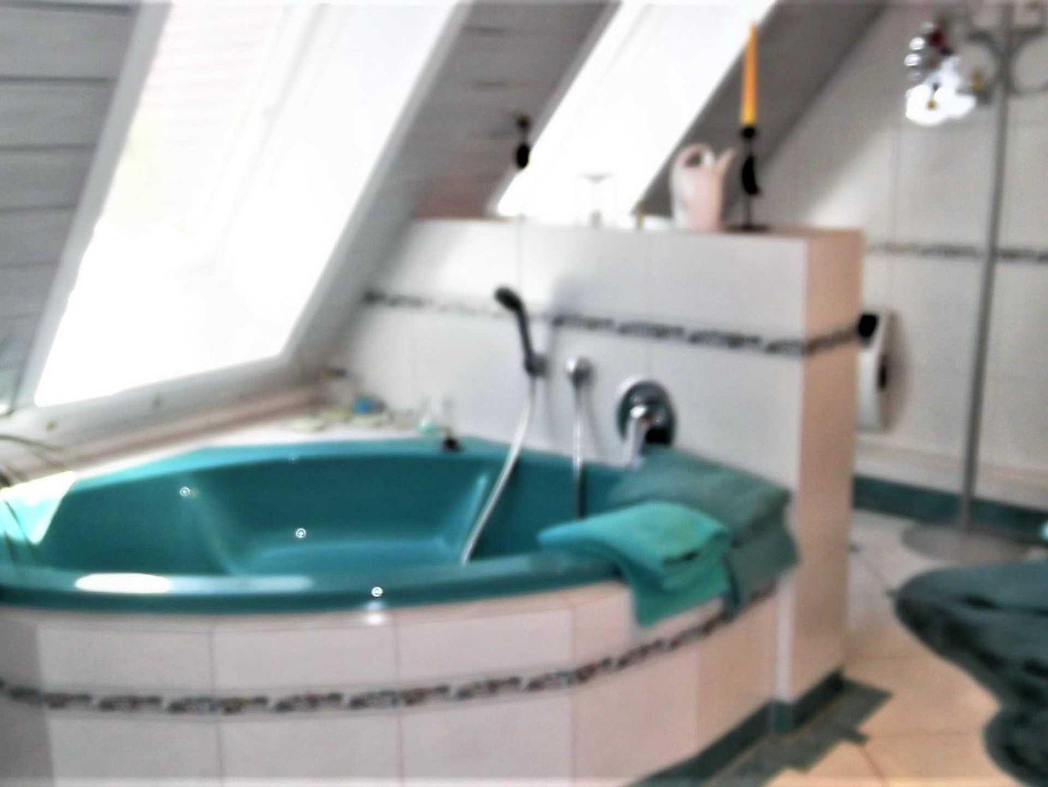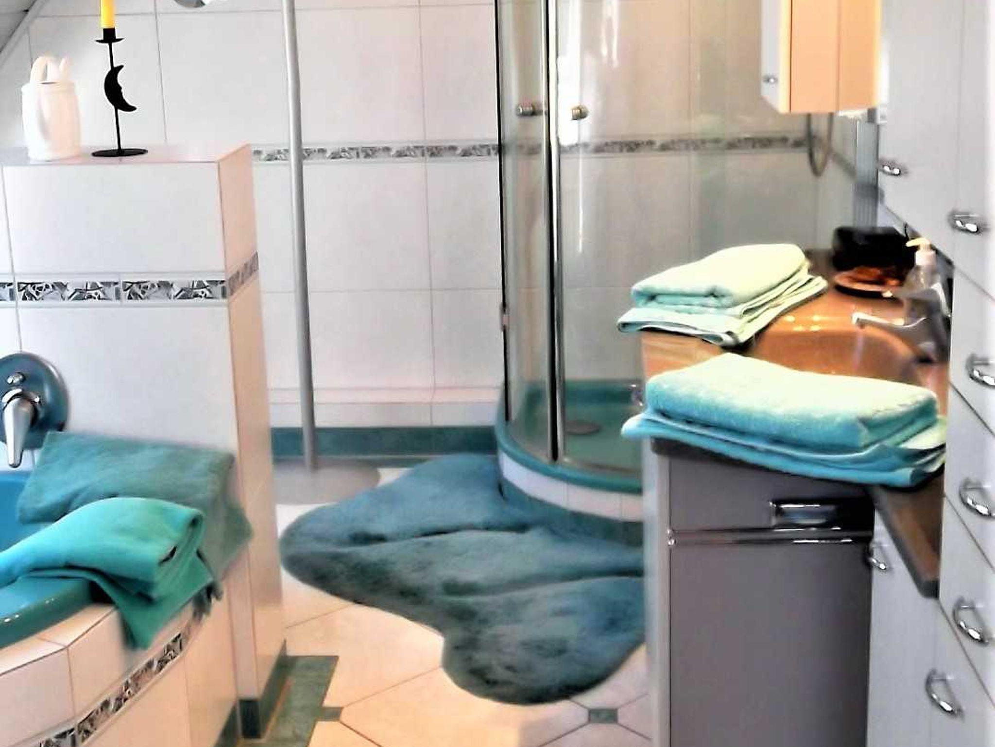 Modernes Wohnbad mit Eckbadewanne, großer Runddusche, Bidet. Der Wohnbereich ist mit kanadischem Wildahornparkett barfußfreundlich ausgelegt. Durch die durchgängig verglaste Westfassade ist der Wohnbereich lichtdurchflutet. Über zwei Glastüren ist der Westbalkon erreichbar, auf dem man abends die letzten Sonnenstrahlen genießen kann. Fußbodenheizung im Bad.