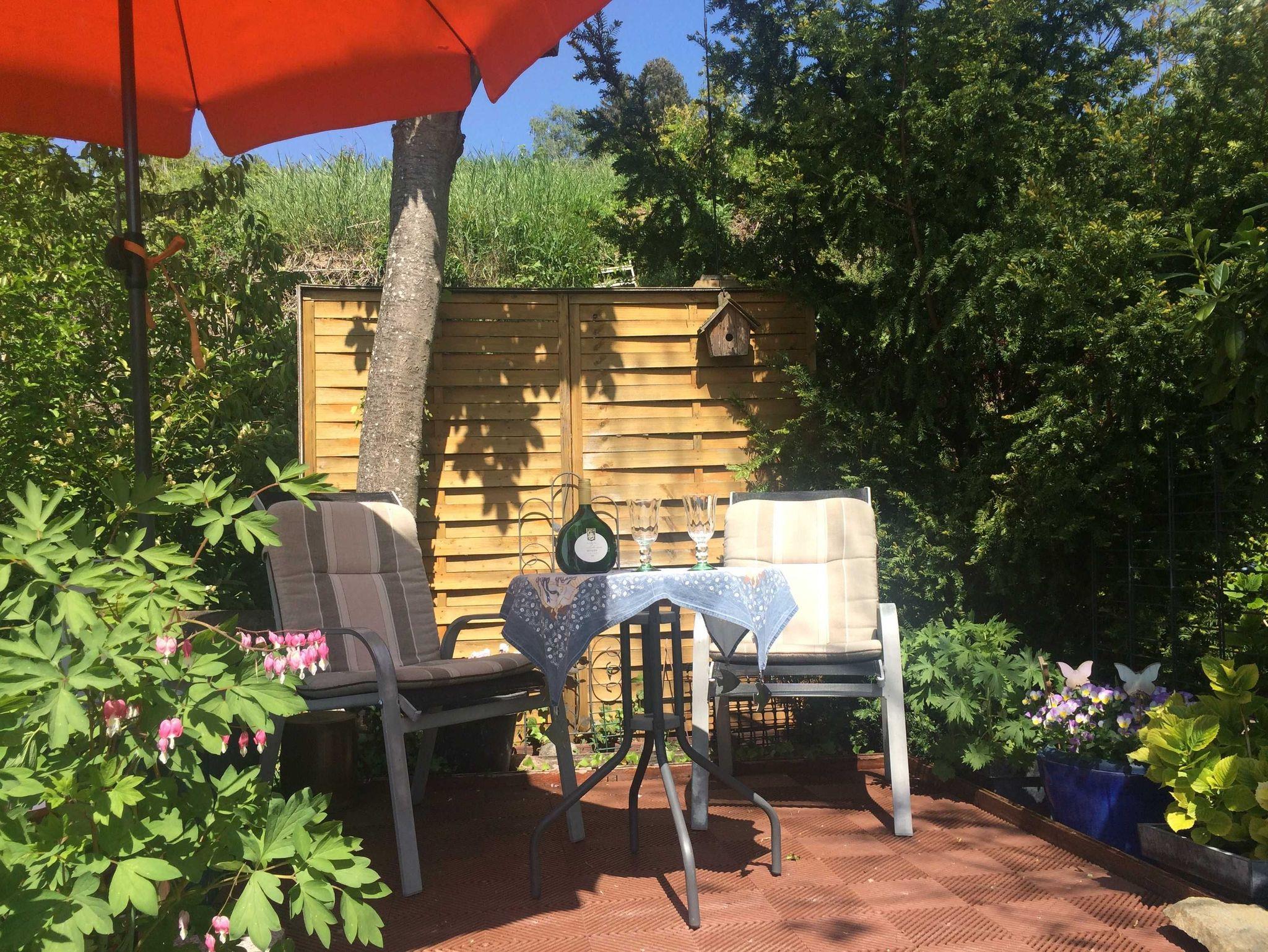 Sonnenschirme, Gartenmöbel, Grill und Feuerschale sind vorhanden.