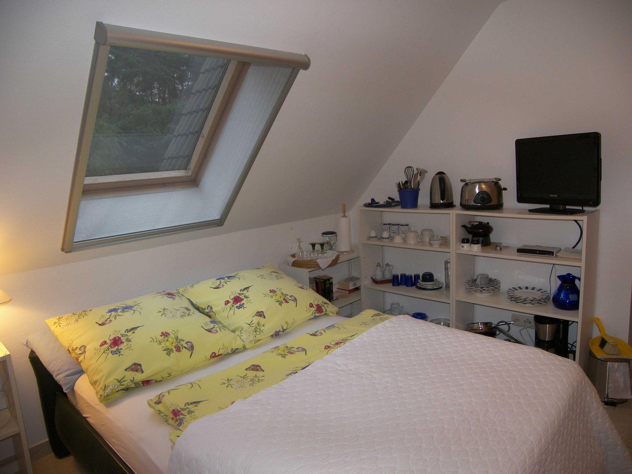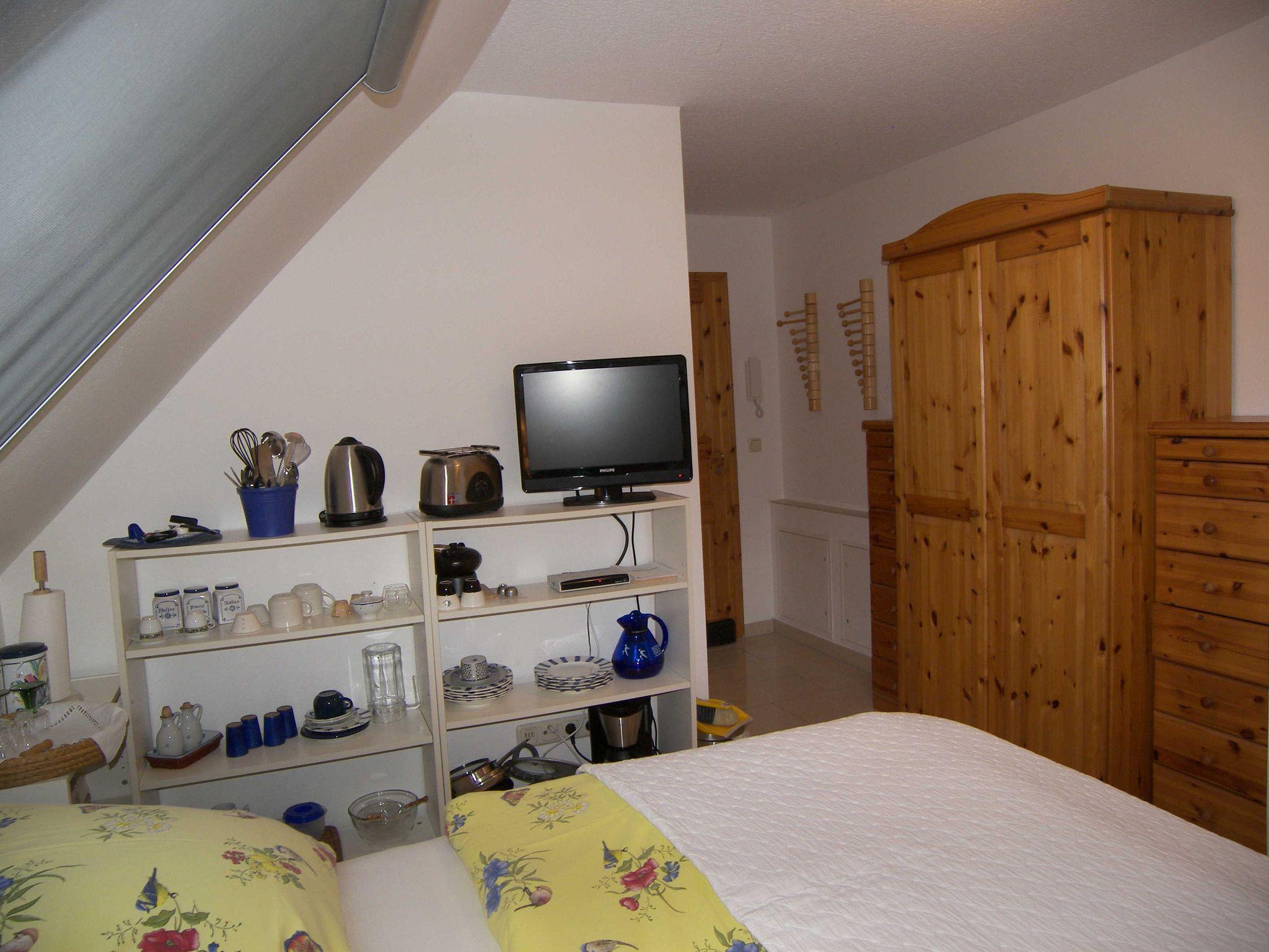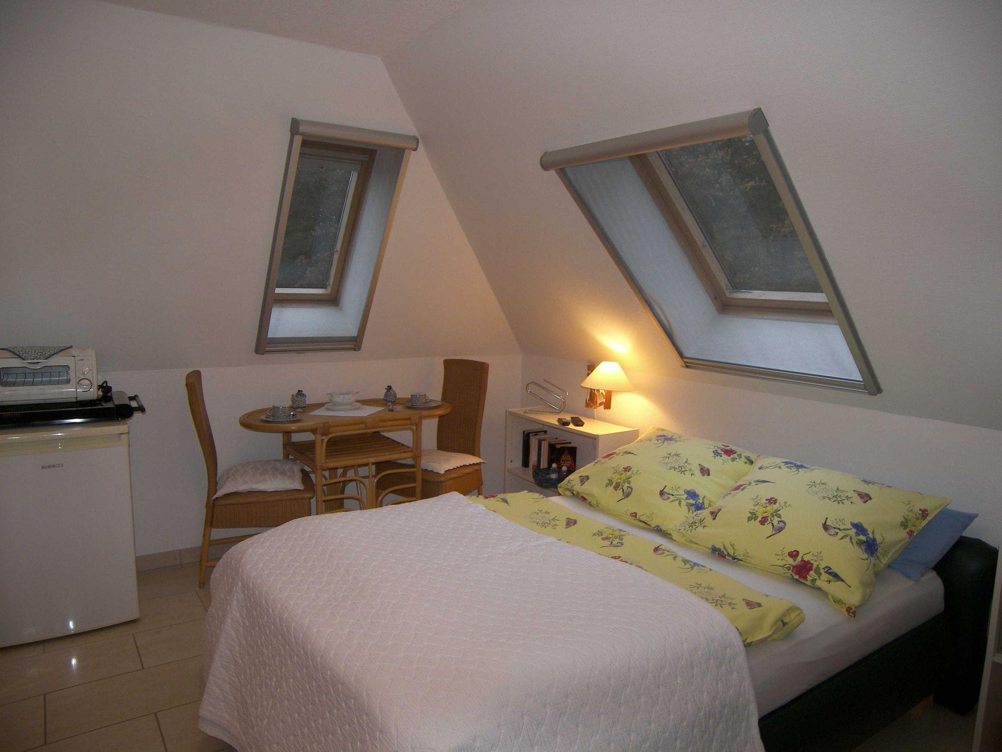 Das komfortabel eingerichtete Ferienzimmer befindet sich im 1. Obergeschoss und verfügt über ein französisches Bett (1,40m x 2,00m), einen Kleiderschrank, eine Sitzgelegenheit, Flachbild-TV, Radio & W-LAN. Das Bad ist mit Dusche/WC, einer Handtuchheizung sowie einem Haartrockner ausgestattet. Ebenso steht Ihnen ein Kühlschrank, ein mobiles Cerankochfeld, Wasserkocher, Toaster, Kaffeemaschine sowie Geschirr im Zimmer zur Verfügung. Bitte beachten Sie, dass kein Spülbecken vorhanden ist. Küchenrolle und ein Geschirrhandtuch werden ebenfalls bereitgestellt. Die Bettwäsche ist bereits inklusive.