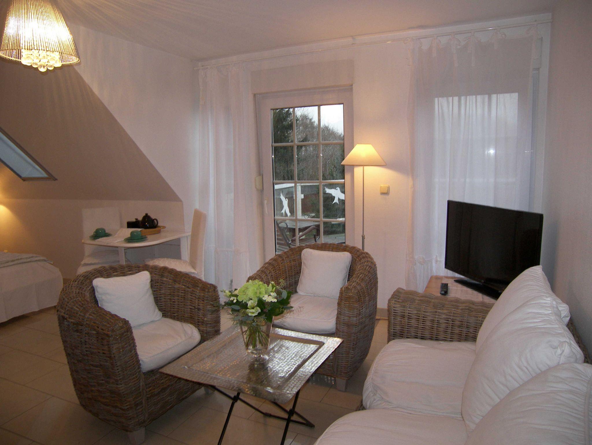 Die Maisonettewohnung befindet sich im 1. Obergeschoss und verfügt im unteren Bereich über einen kombinierten Wohn-/Schlafraum mit Doppelbett und gemütlicher Sitzecke, Flachbild-TV, Radio und W-LAN. Des Weiteren befindet sich auf gleicher Ebene die offene kleine Pantryküche mit 2-Kochfeld-Ceranplatte, Spülbecken, Kaffeemaschine, Toaster, Wasserkocher und Kühlschrank, sowie über einen kleinen Esstisch. Küchenrolle und ein Geschirrhandtuch werden bereitgestellt. Das Bad ist mit Dusche/WC, Handtuchheizung und Haartrockner ausgestattet. Über eine Treppe erreichen Sie den oberen Schlafbereich mit 2 Einzelbetten, einem großen Kleiderschrank.