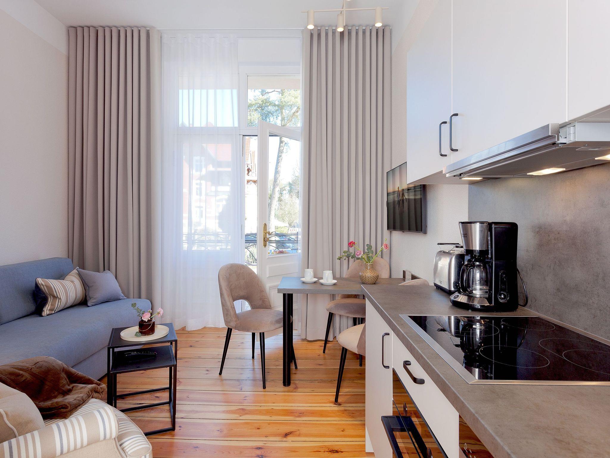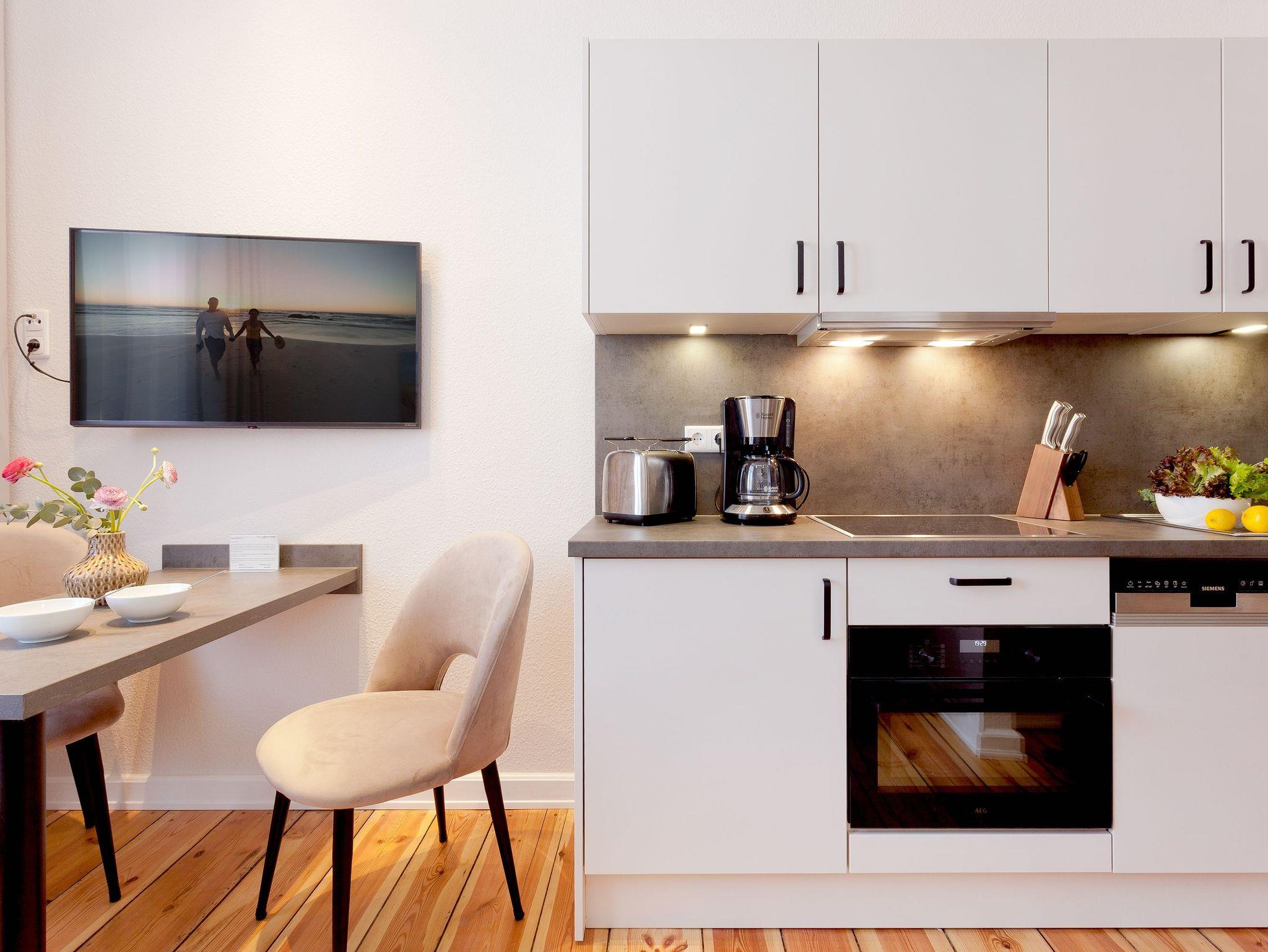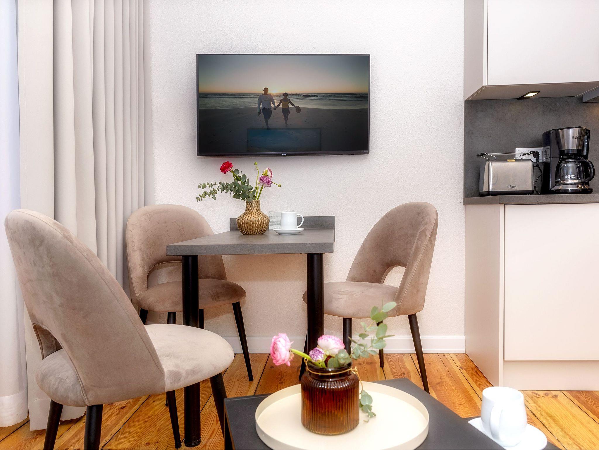 Unser Appartement 6 im 1. Obergeschoss wurde im Winter 2024 - 25 renoviert und erstrahlt nun in neuem Glanz. Mit ca. 34 qm bietet das Appartement alles, was es für einen erholsamen Aufenthalt mit bis zu 3 Personen benötigt. Die neue, moderne Single-Küchenzeile ist vollausgestattet mit einem Cerankochfeld, Kühlschrank mit Gefrierfach, Backofen mit integrierter Mikrowelle, Spülmaschine sowie Kaffeemaschine, Wasserkocher und Toaster.