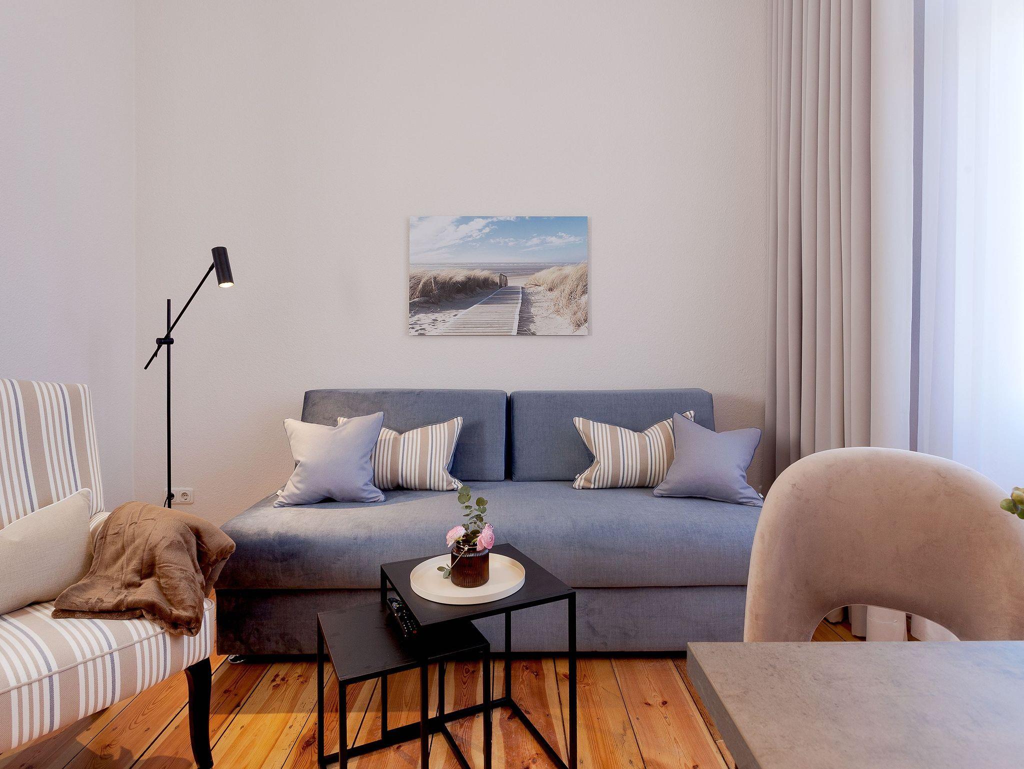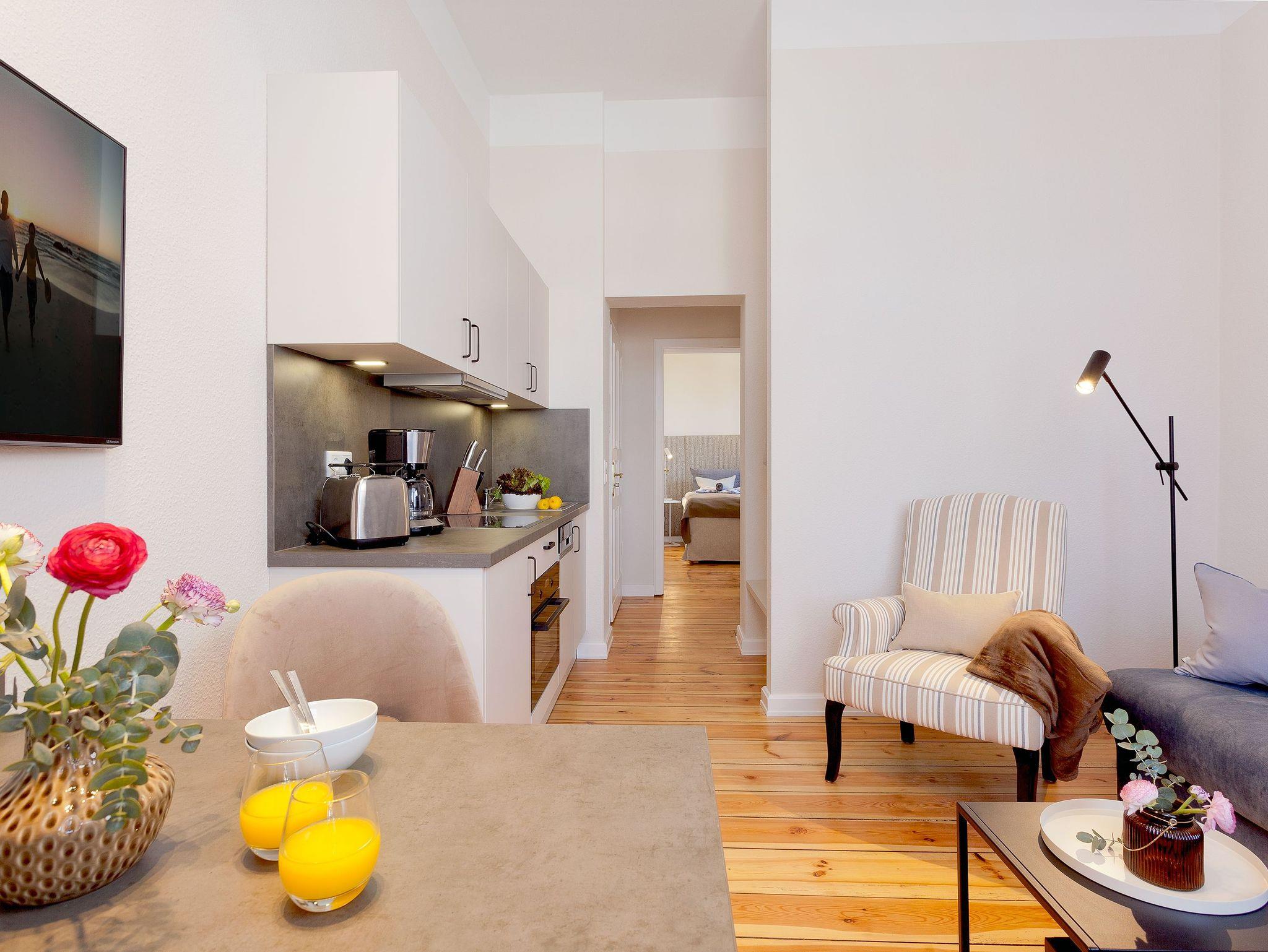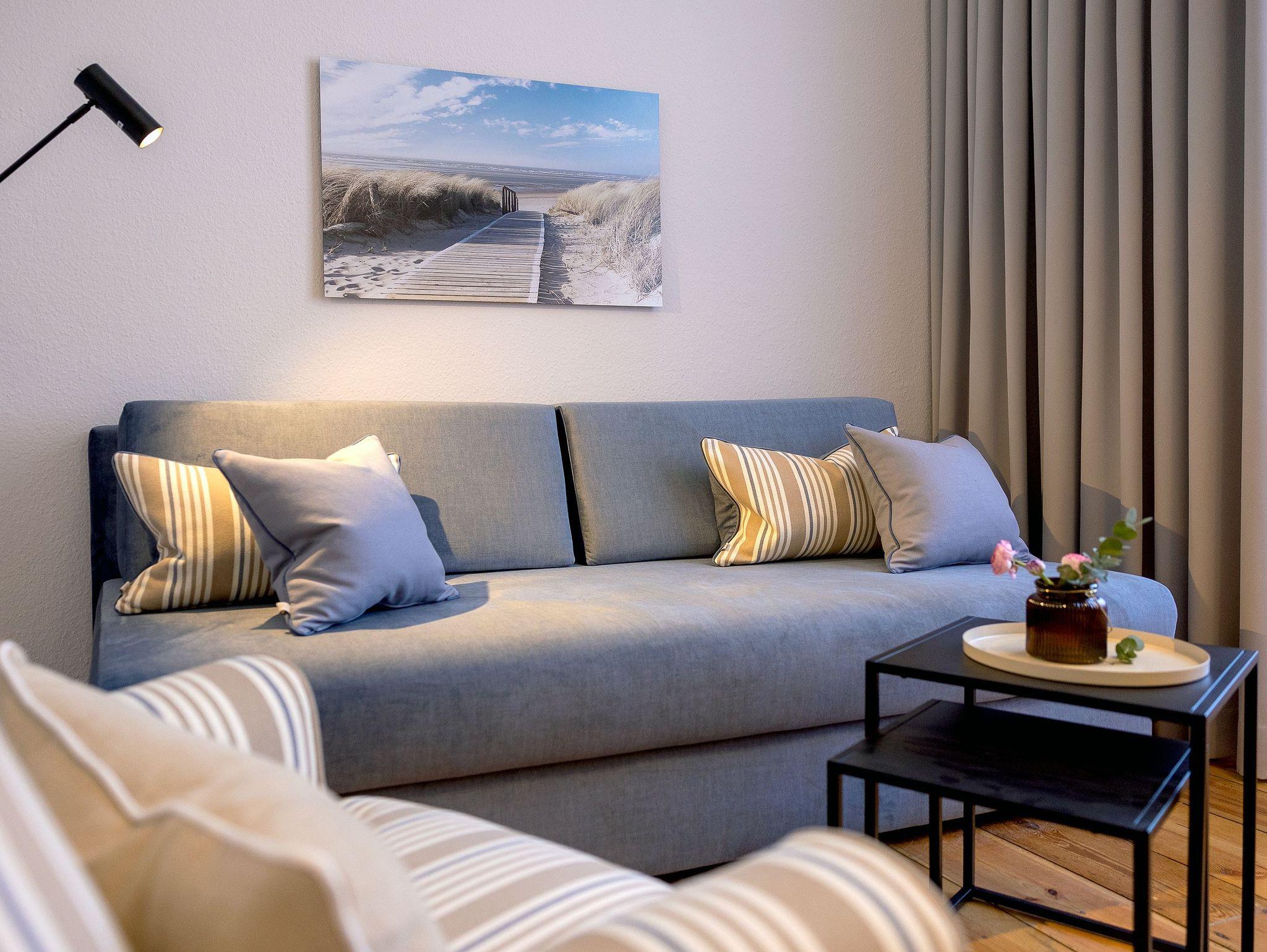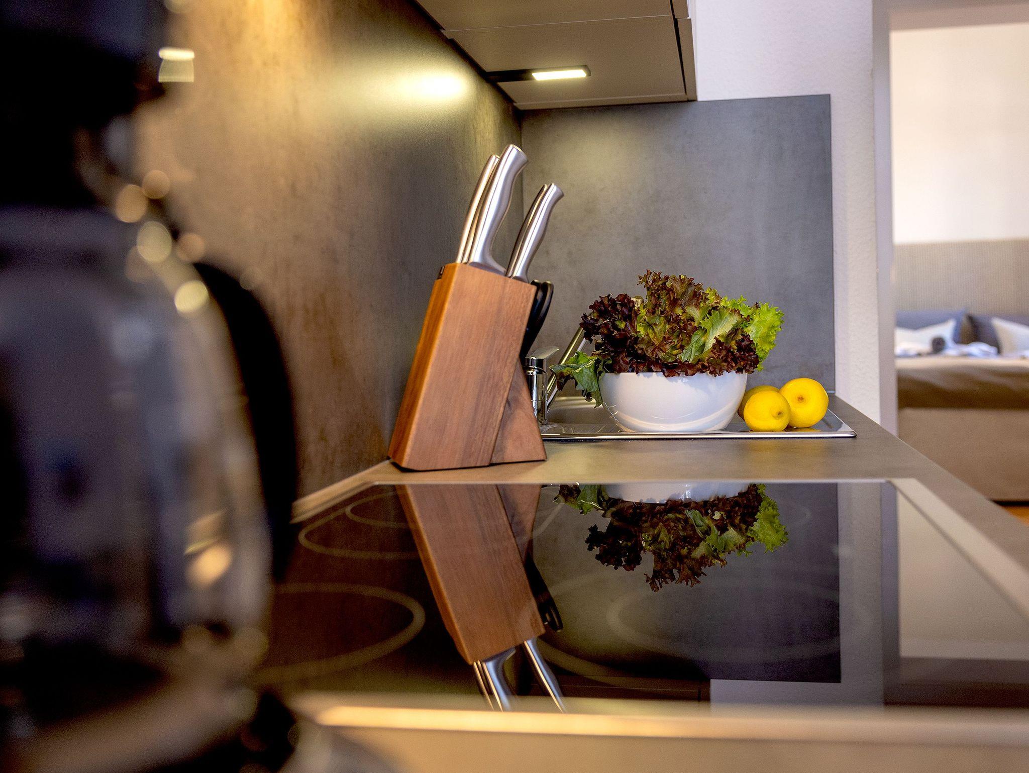 Unser Appartement 6 im 1. Obergeschoss wurde im Winter 2024 - 25 renoviert und erstrahlt nun in neuem Glanz. Mit ca. 34 qm bietet das Appartement alles, was es für einen erholsamen Aufenthalt mit bis zu 3 Personen benötigt. Die neue, moderne Single-Küchenzeile ist vollausgestattet mit einem Cerankochfeld, Kühlschrank mit Gefrierfach, Backofen mit integrierter Mikrowelle, Spülmaschine sowie Kaffeemaschine, Wasserkocher und Toaster.
