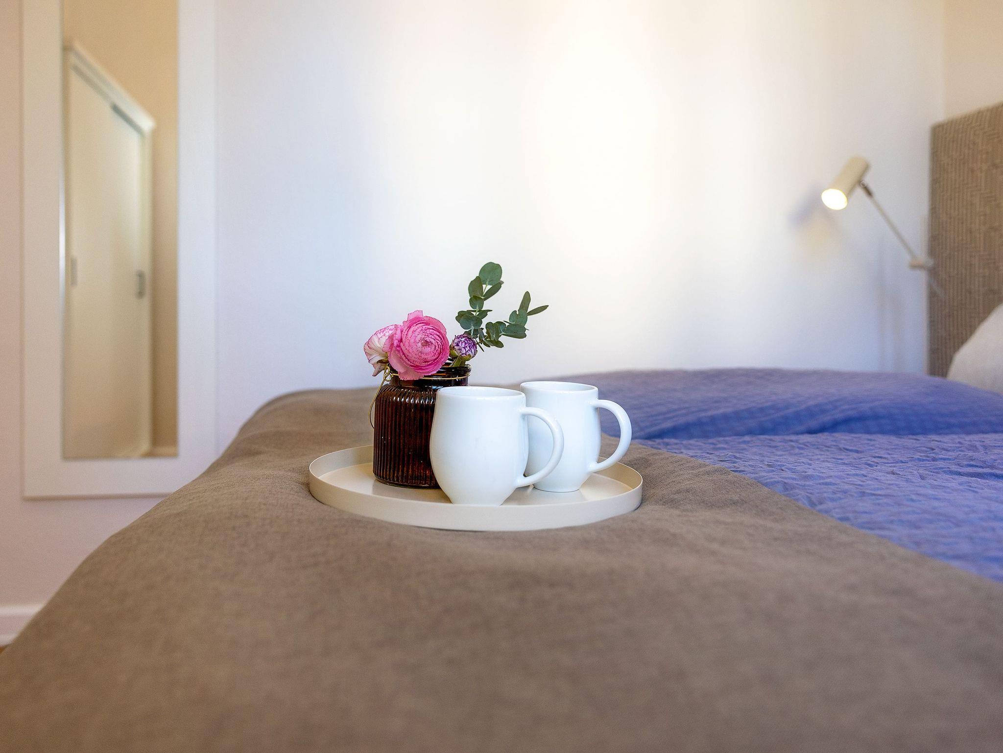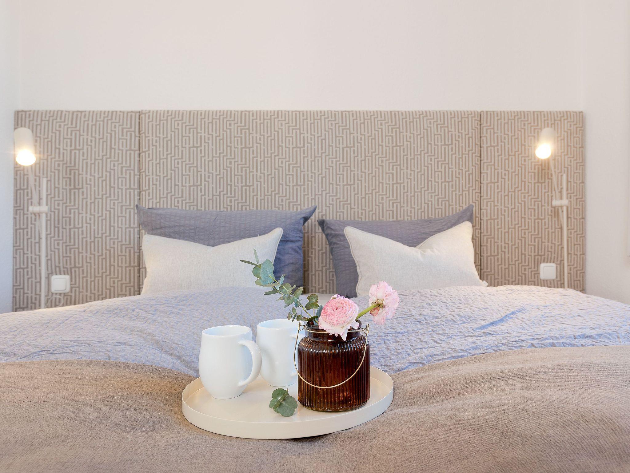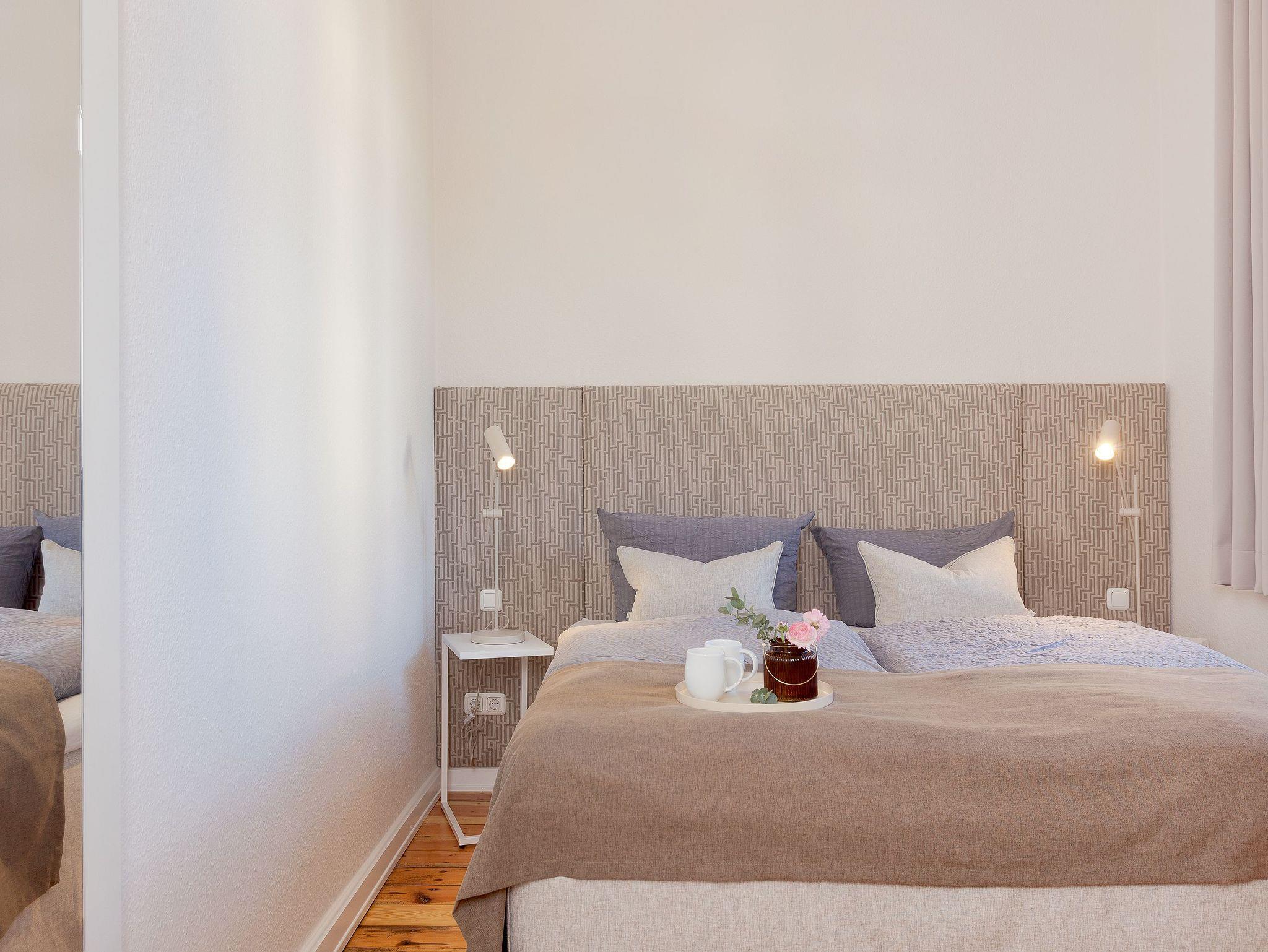 Das Schlafzimmer verfügt über ein komfortables Boxspringbett (160 x 200 cm) für eine erholsame Nacht und bietet durch den Kleiderschrank genügend Stauraum für Ihre Garderobe.