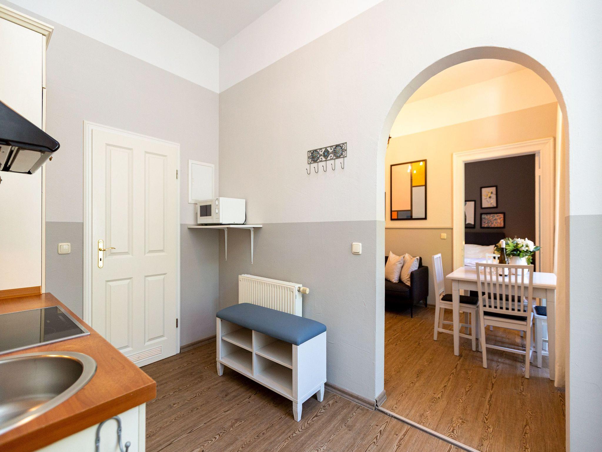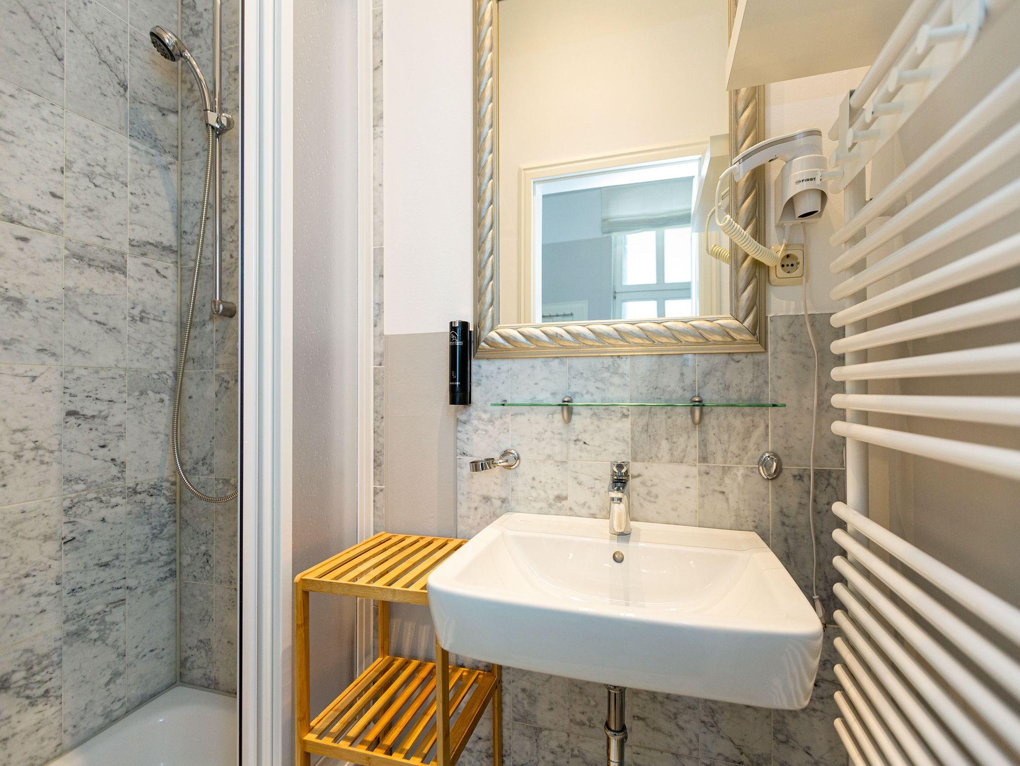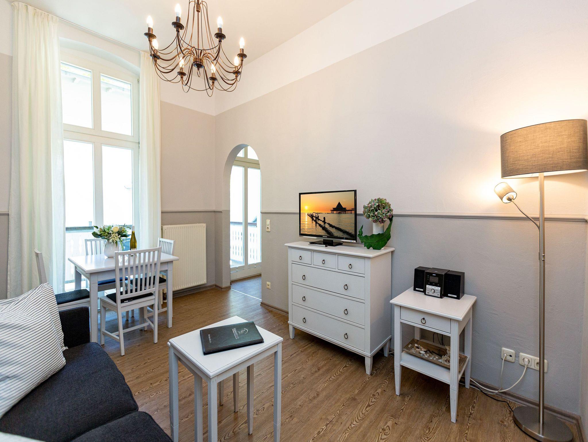 Den Zauber der alten Kaiserzeit spüren, das können Sie in diesem stilvollen Ferienappartement Nummer 4 im Hochparterre der Villa Amelia. Sommerfrische hieß zu dieser schillernden Zeit der Urlaub an der Ostsee. Und sommerlich frisch empfangen Sie die drei lichtdurchfluteten Zimmer. Bis zu drei Erwachsene und ein Kind bis 15 Jahre haben hier ausreichend Platz für eine ganz besondere Sommerfrische unweit des weißen Sandstrandes. Das geräumige Wohnzimmer ist mit einer großen Vintage-Couch, eleganten weißen Möbeln und einem Flat-TV eingerichtet. Ein schöner Essplatz lädt zum Wohlfühlen und Schlemmen ein. Die Wohnung hat einen sonnigen Süd-Balkon mit Gartenmöbeln. In der separaten doch offenen Küche sind alle zum Kochen benötigte Geräte vorhanden. Auch erlesenes Geschirr finden Sie in den Schränken. Die Wohnung verfügt über zwei Schlafzimmer. Eines enthält ein großes und komfortables Boxspringdoppelbett. Im zweiten warten zwei einzelne Boxspringbetten ? eines in einem kuscheligen Alkoven ? darauf, Ihnen erholsame Träume zu schenken. Ein Hauch Kaiserzeit-Flair durchzieht die Wohnung bis ins Badezimmer mit Dusche. Marmorfliesen, Vintage-Spiegel ? mondän und elegant bis ins Detail. Die Toilette befindet sich in einem separaten, ein paar Stufen tiefer gelegenen Raum. Urlaub heißt ausspannen und die Sorgen des Alltags einmal komplett vergessen. Für eine solch sorgenfreie Ostsee-Auszeit haben wir die Betten Ihres Domizils bereits bezogen und Handtücher bereit gelegt. Das WLAN Netz im Haus kann kostenfrei genutzt werden. Einen Pkw-Stellplatz finden Sie neben dem Haus.