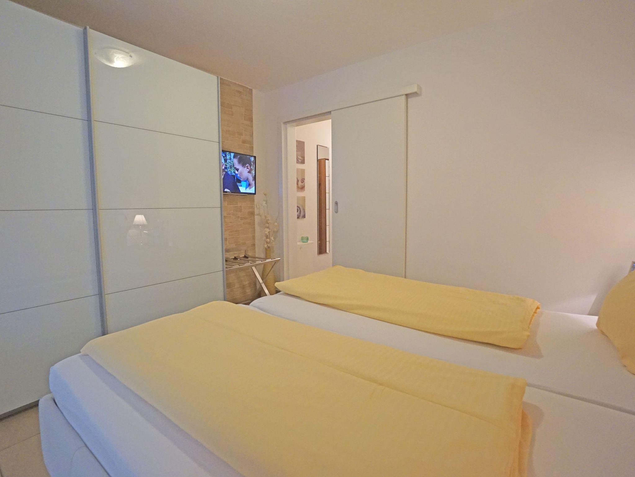 Ein Schlafzimmer mit weißem Lederdoppelbett (180 x 200), Übergardienen zum verdunkeln, Kleiderschrank und Flat-TV, von hier aus gelangt man auf den kleinen dritten Balkon.