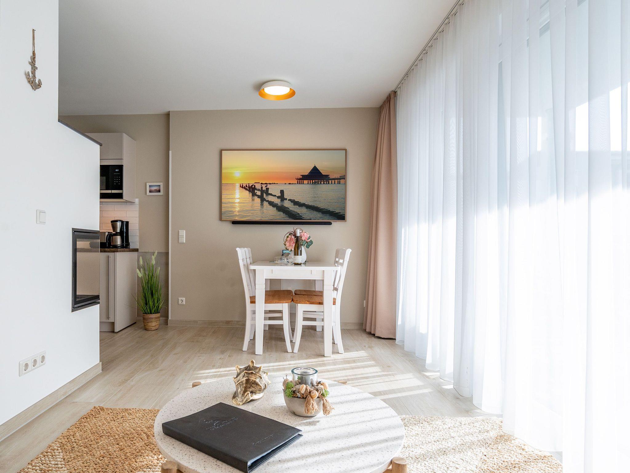 Sie reisen zu zweit oder als kleine Familie ans Meer? Dann verbringen Sie Ihren Urlaub im neuen Quartier am Strand in Seebad Heringsdorf. Das im Juni 2023 fertiggestellte 51 Quadratmeter große 2-Raum-Appartement bietet alles, was Sie für einen erholsamen Urlaub für zwei Erwachsene und ein Kind (bis 15 Jahre) benötigen. Ideal gelegen zwischen Ostsee (100m entfernt) und Ortskern (1.000m) können Sie tagsüber zwischen Sonnenbad und Stadtbummel entscheiden. Auf der 15 Quadratmeter großen Südwest-Terrasse lässt es sich tagsüber auf der Sonnenliege oder am Tisch mit drei Stühlen aushalten. Am Abend warten im Wohnbereich eine Sitzgruppe, die auch als Aufbettungsmöglichkeit für eine dritte Person dient, sowie ein 65-Zoll Flat-TV und ein Kamin darauf, es Ihnen gemütlich zu machen. Der offene Koch-und Essbereich ist umfangreich ausgestattet (Backofen, Induktionskochfeld, Mikrowelle, Spülmaschine, Kühlschrank mit Gefrierfach und Kleinküchengeräte) und bietet jeglichen Komfort beim Zubereiten Ihrer Speisen. Gemeinsame Mahlzeiten lassen sich am Esstisch für vier Personen einnehmen. Verzichten Sie auch im Urlaub nicht auf Ihren erholsamen Schlaf und machen Sie es sich im bequemen Boxspringbett (1,80m x 2,00m) gemütlich. Ein Flat-TV und Stauraum für Ihre Urlaubsgarderobe runden den innenliegenden Schlafbereich ab. Das Highlight bildet die Finnische Sauna, die in das Duschbad mit Waschtisch und WC integriert ist und auch an kühleren Tagen für wohlige Wärme sorgt. Für Ihren PKW steht ein Stellplatz in der hauseigenen Tiefgarage bereit. Bei Ihrer Anreise sind außerdem die Betten bereits bezogen und Handtücher liegen für Sie parat. Kostenfreies W-Lan sowie ein wohnungseigener Abstellraum direkt hinter Ihrem PKW-Stellplatz erleichtern das Abstellen Ihrer Fahrräder. Für den Tag am Strand steht Ihnen in der Zeit von Mitte Mai bis September (je nach Witterung) ein Strandkorb zur Verfügung.