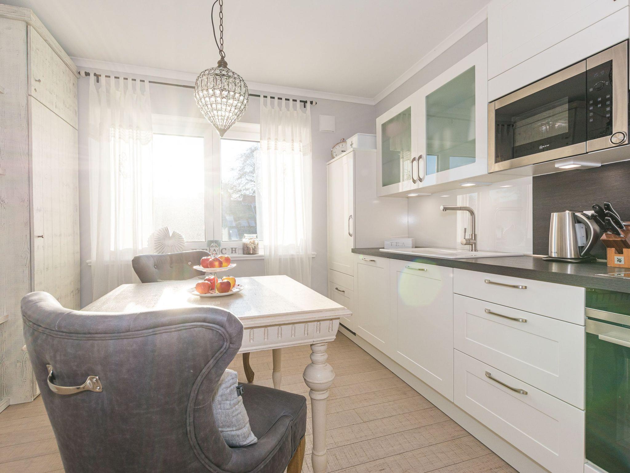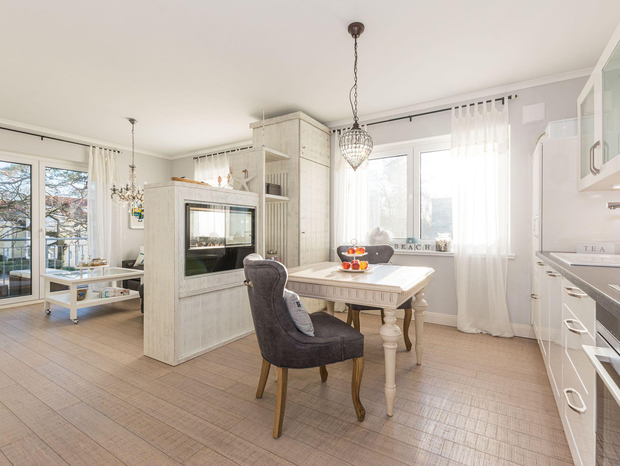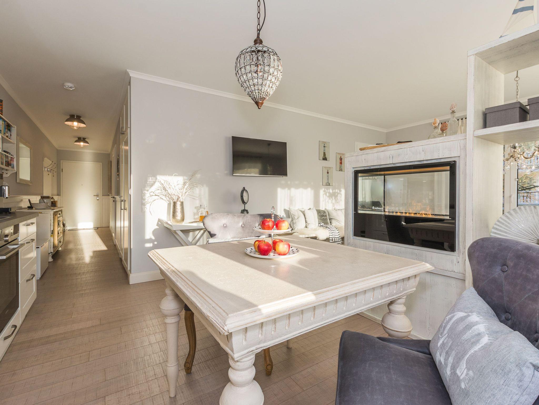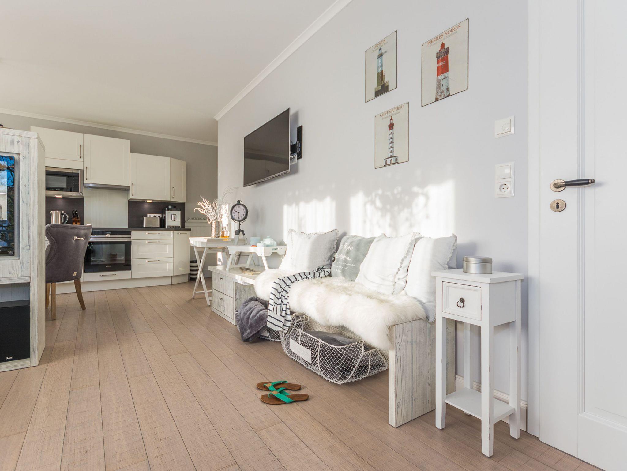 Appartement 11 ?Perlmutt? ? Exklusiver Ostseeurlaub für Zwei. Tauchen Sie ein in stilvolle Entspannung: Das 68 m² große Appartement ?Perlmutt? in der Dünenresidenz Heringsdorf verbindet moderne Eleganz mit liebevollen Details ? perfekt für 2 Erwachsene und ein Kleinkind (im Reisebett bis 2 Jahre). Im 1. Obergeschoss gelegen, erwartet Sie ein offener, lichtdurchfluteter Wohnbereich, in dem Design auf Gemütlichkeit trifft. Die voll ausgestattete Küchenzeile mit Induktionsfeld, Spülmaschine, Kühlschrank mit Gefrierfach, Mikrowelle und Kaffeevollautomat lässt keine Wünsche offen ? der perfekte Ort für den ersten Kaffee mit Meeresgefühl. Am Essplatz lässt es sich wunderbar tafeln, während die Sitzgruppe mit Flat-TV, Blu-Ray-Player, Radio, Bluetooth-Box und ein Elektrokamin mit Fernbedienung für stimmungsvolle Abende sorgt. Vom Wohnbereich aus gelangen Sie auf den 8 m² großen Ostbalkon ? mit bequemen Gartenmöbeln und einem Hauch Seeluft. Das geräumige Schlafzimmer mit Doppelbett (2,00 x 2,00 m), Flat-TV und Kleiderschrank verspricht erholsamen Schlaf. Ein echtes Highlight ist das hochwertige Wellnessbad: Regendusche, Infrarotkabine, Whirlpool und stilvoller Waschtisch ? Entspannung pur, ganz privat. Für den Sommer: Ihr eigener Strandkorb am Strand steht kostenlos bereit ? ein Logenplatz an der Ostsee. Ein Tiefgaragenstellplatz (Nr. 11, Einfahrtshöhe 2,05 m) rundet das Angebot ab. Appartement ?Perlmutt? ? Ihr persönlicher Wohlfühlort zwischen Ostseewellen, Dünenrauschen und Wellnesskomfort.