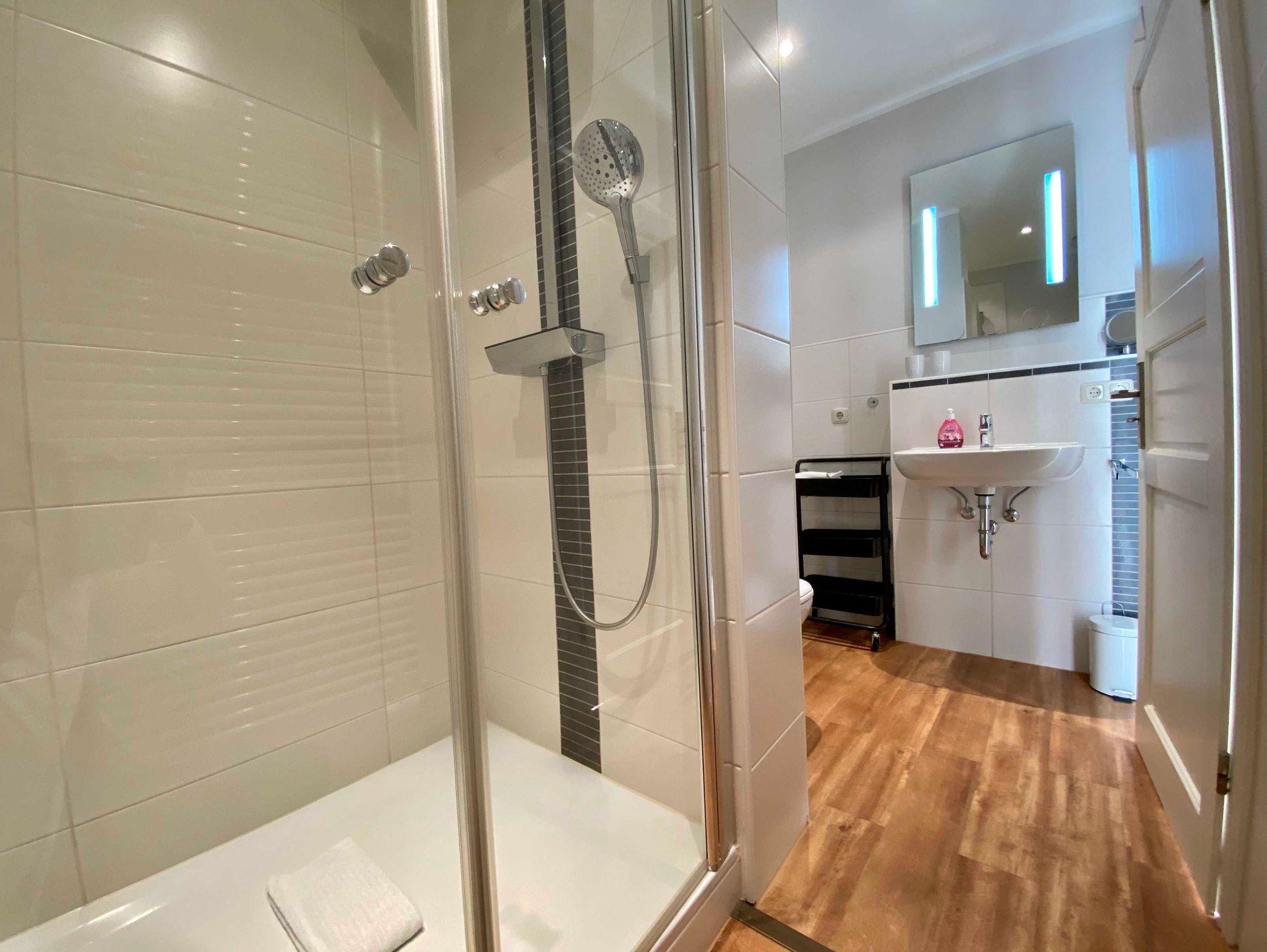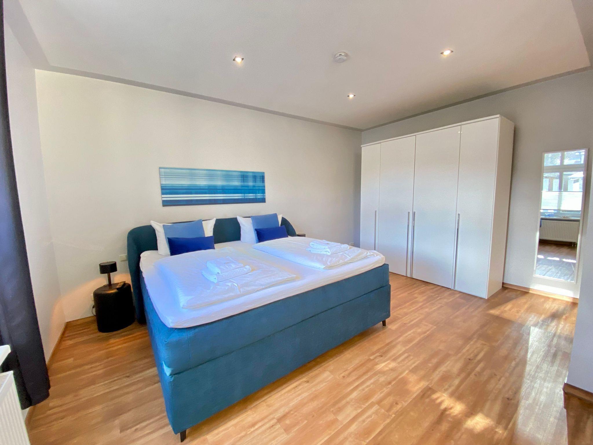 Die Kleine Anna hat ein sehr großzügiges Schlafzimmer, in dem neben dem modernen Boxspringbett und dem großen Kleiderschrank noch genügend Bewegungsspielraum bleibt. Es ist mit einem Flachbild-TV versehen. Im Badezimmer mit Dusche wurden hochwertige Materialien verwendet.