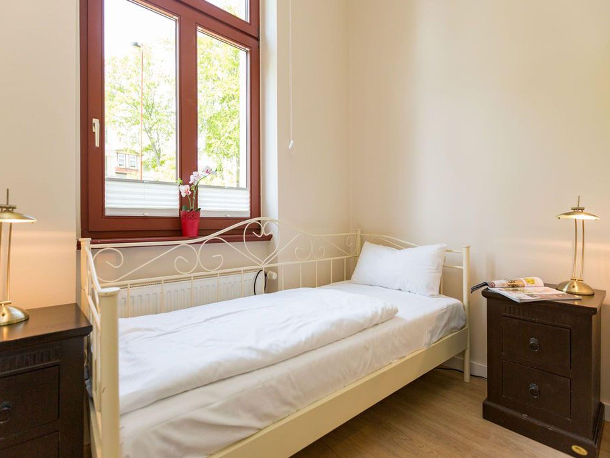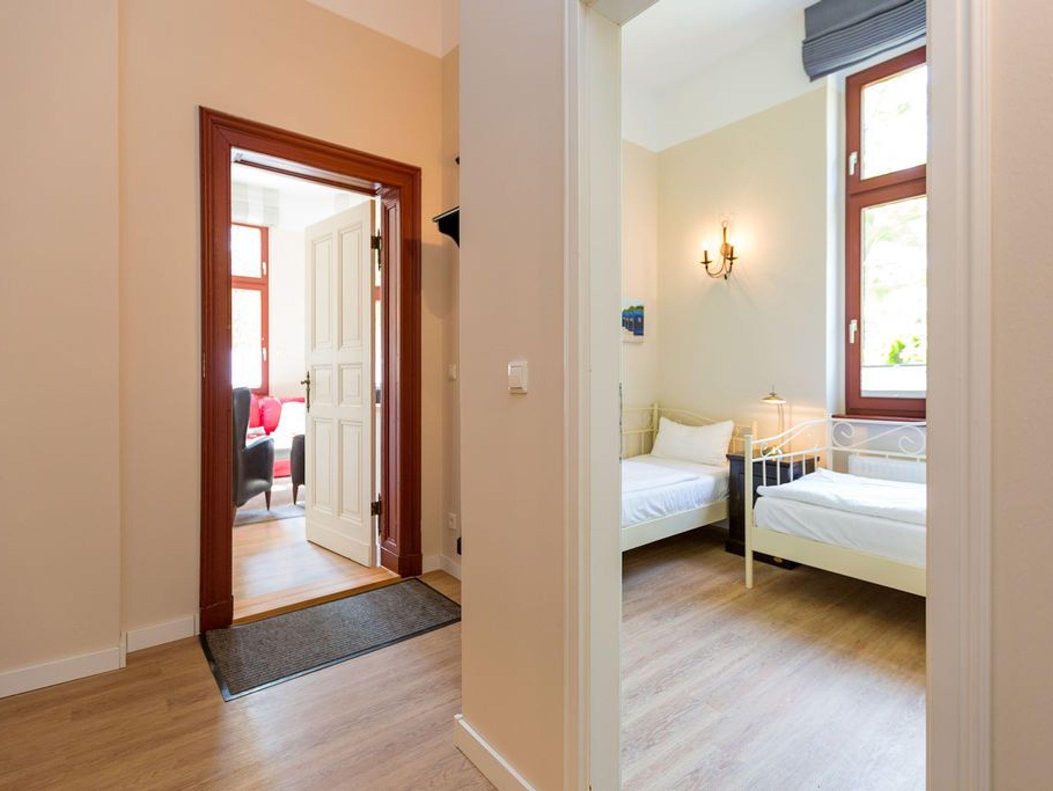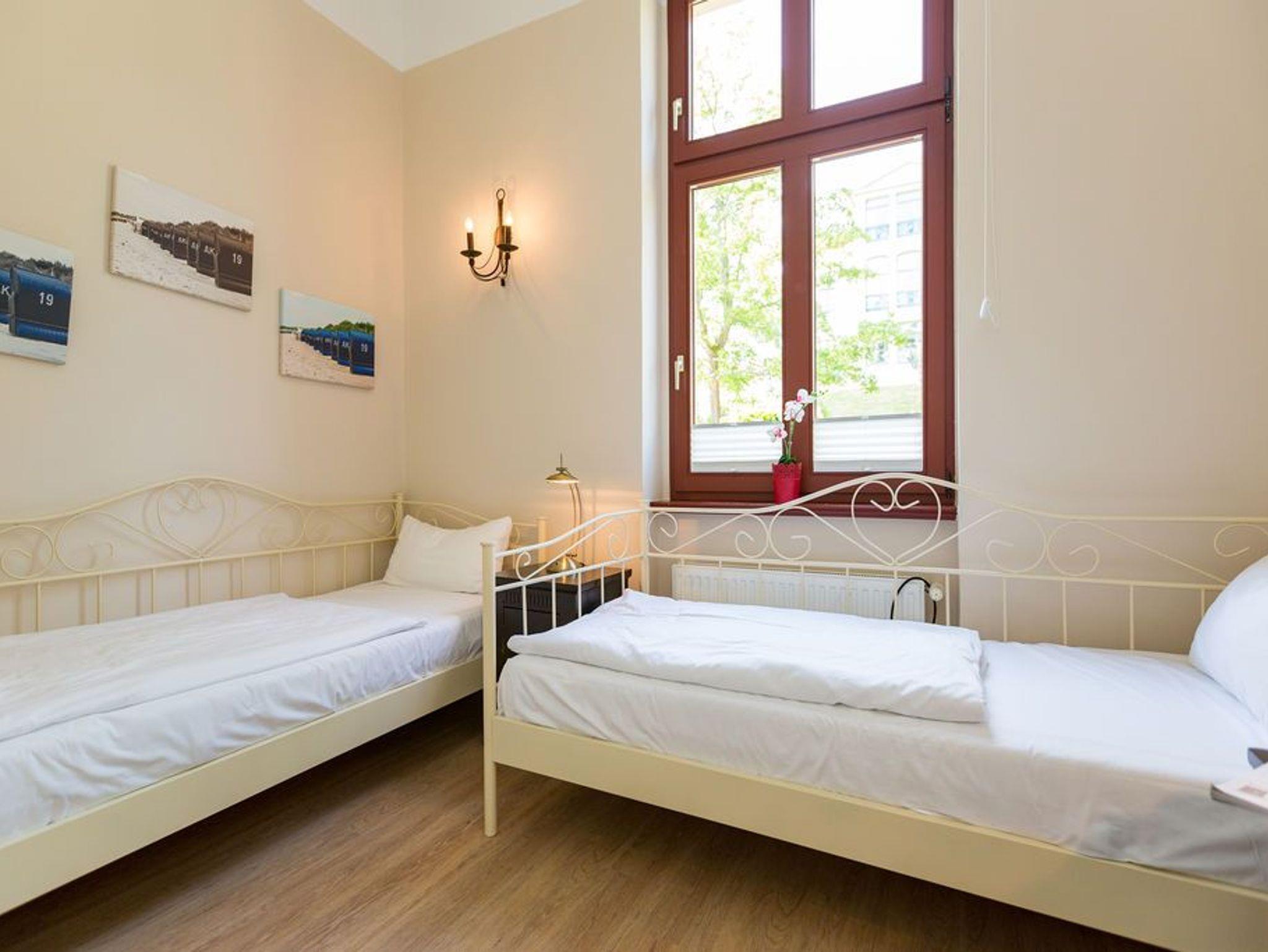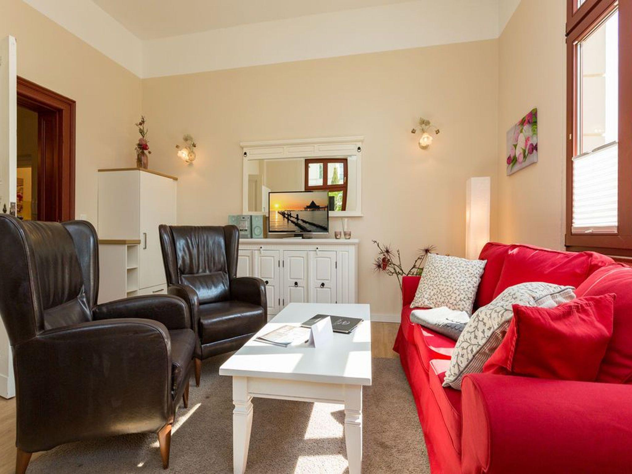 Diese traumhafte 3-Raum-Ferienwohnung begrüßt Sie Hochparterre im Kaiserbad Heringsdorf! Mit einer großzügigen Fläche von 60 qm bietet sie ausreichend Platz für bis zu 4 Personen und lädt zu einem unvergesslichen Urlaub ein. Das Wohnzimmer ist der perfekte Ort, um gemütliche Abende zu verbringen. Hier finden Sie eine bequeme Sitzgruppe und einen Fernseher, der zum Entspannen und Ausruhen einlädt. Die angrenzende Küchenzeile ist mit allem ausgestattet, was Sie zum Kochen und Zubereiten köstlicher Mahlzeiten benötigen. Ein Essplatz rundet das Wohnzimmer ab und schafft einen gemütlichen Raum für gemeinsame Mahlzeiten. Die Ferienwohnung verfügt über zwei Schlafzimmer, die Ihnen einen erholsamen Schlaf garantieren. Neben einem komfortablen Doppelbett im ersten Schlafzimmer, erwarten Sie im zweiten Schlafzimmer zwei Einzelbetten (0,90m x 2,00m). Egal ob Sie als Paar reisen oder mit Freunden, hier finden Sie den perfekten Rückzugsort. Das Badezimmer ist mit einer Dusche und einem WC ausgestattet. Darüber hinaus verfügt die Wohnung über eine kleine Terrasse, auf der Sie entspannte Momente im Freien verbringen können. Für Ihren Komfort sind die Betten bei Ihrer Anreise bereits bezogen und Handtücher liegen für Sie bereit (Erstausstattung). Darüber hinaus steht Ihnen unser kostenfreies WLAN-Netzwerk im gesamten Haus zur Verfügung. Ein weiteres Highlight ist der PKW-Stellplatz direkt am Haus.