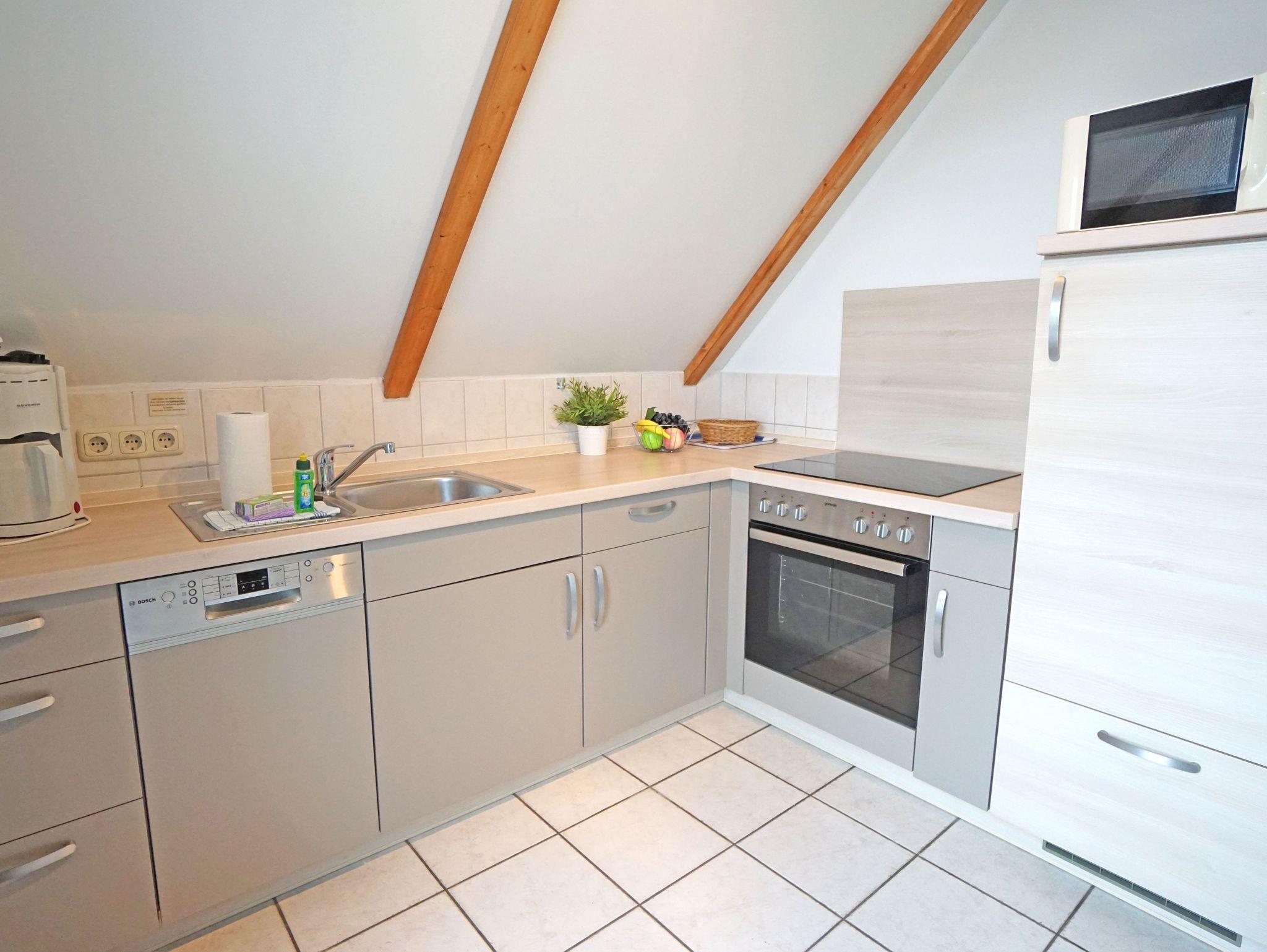 Die Wohnungen im Dachgeschoss bieten Platz für 2 Personen und sind ca. 45 m ² groß. Sie sind aufgeteilt in ein Schlafzimmer, einen Wohnraum mit Einliegerküche, ein komfortables Bad und ein Balkon.