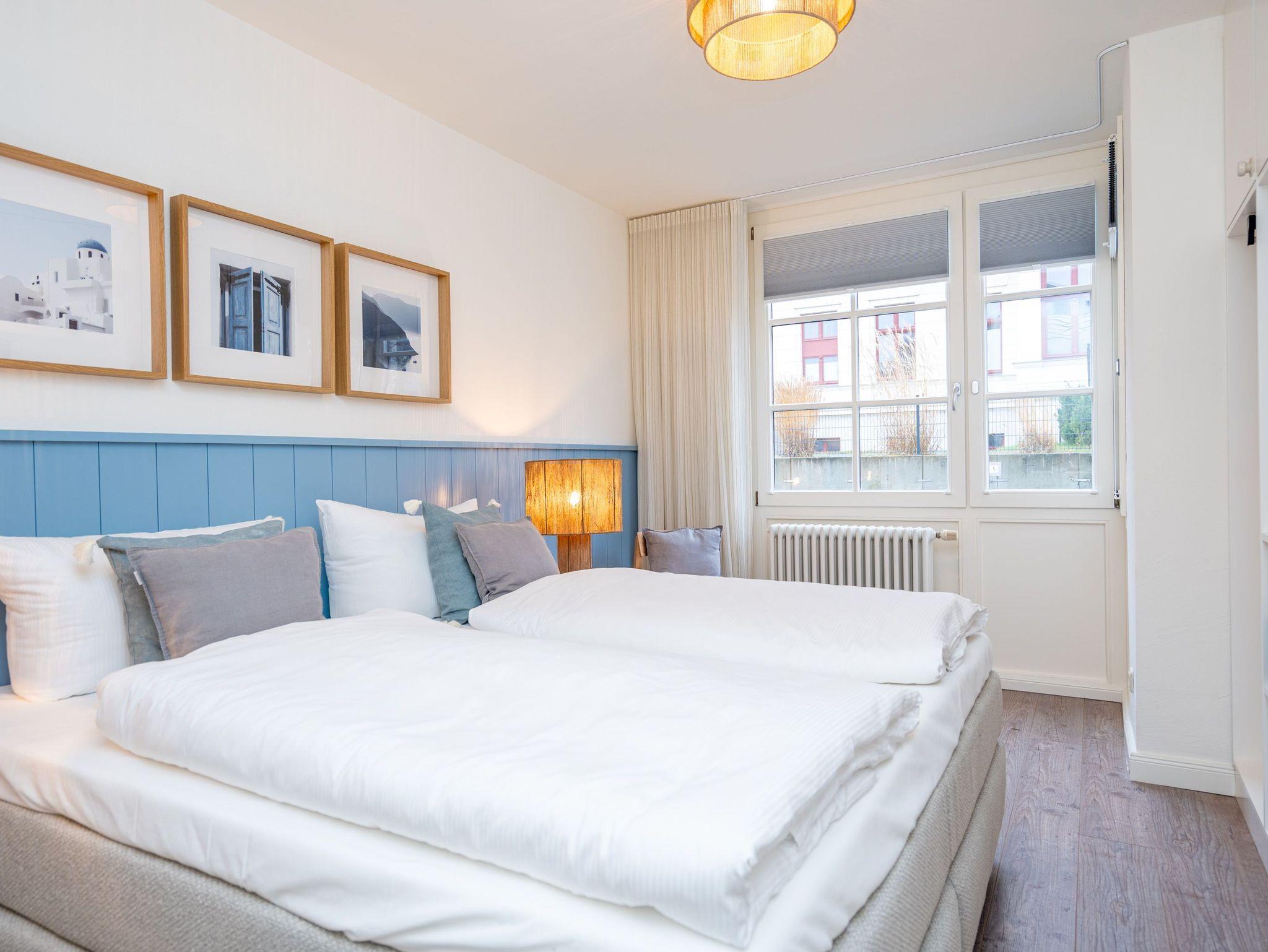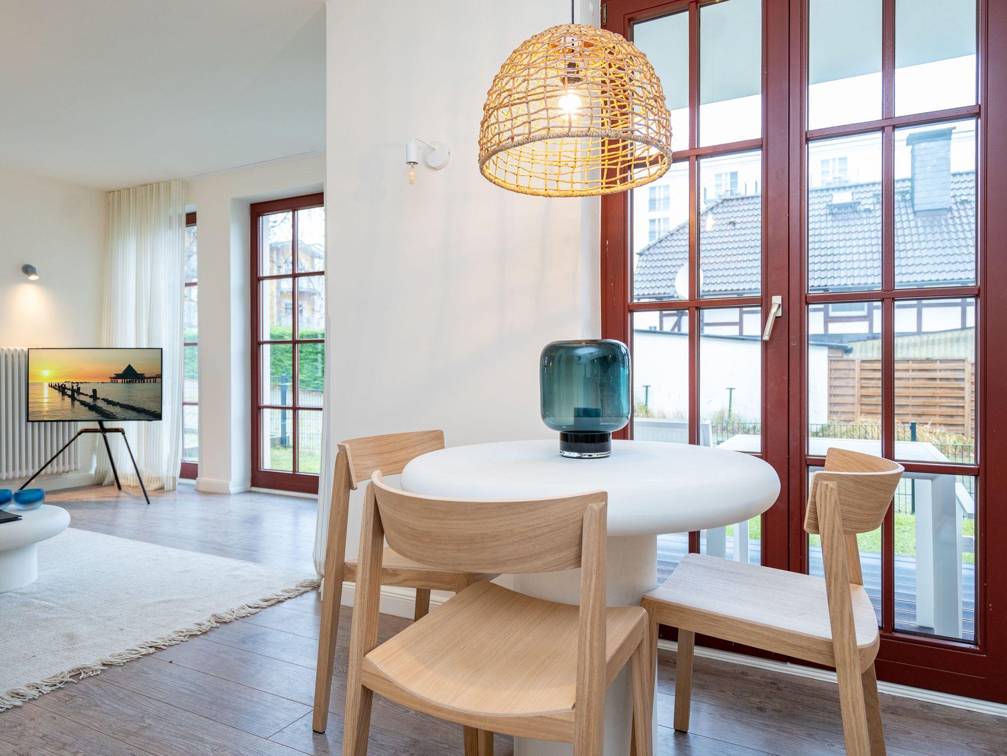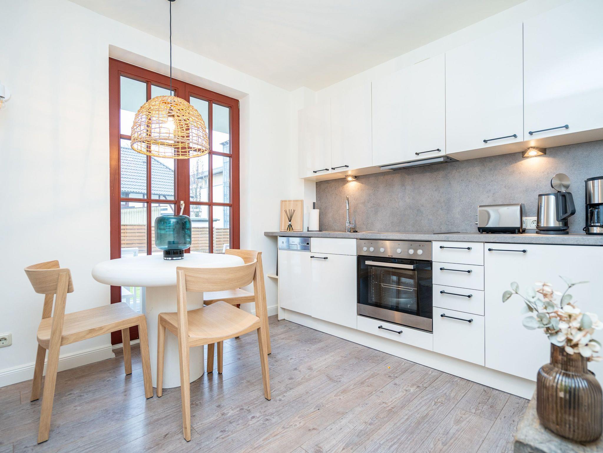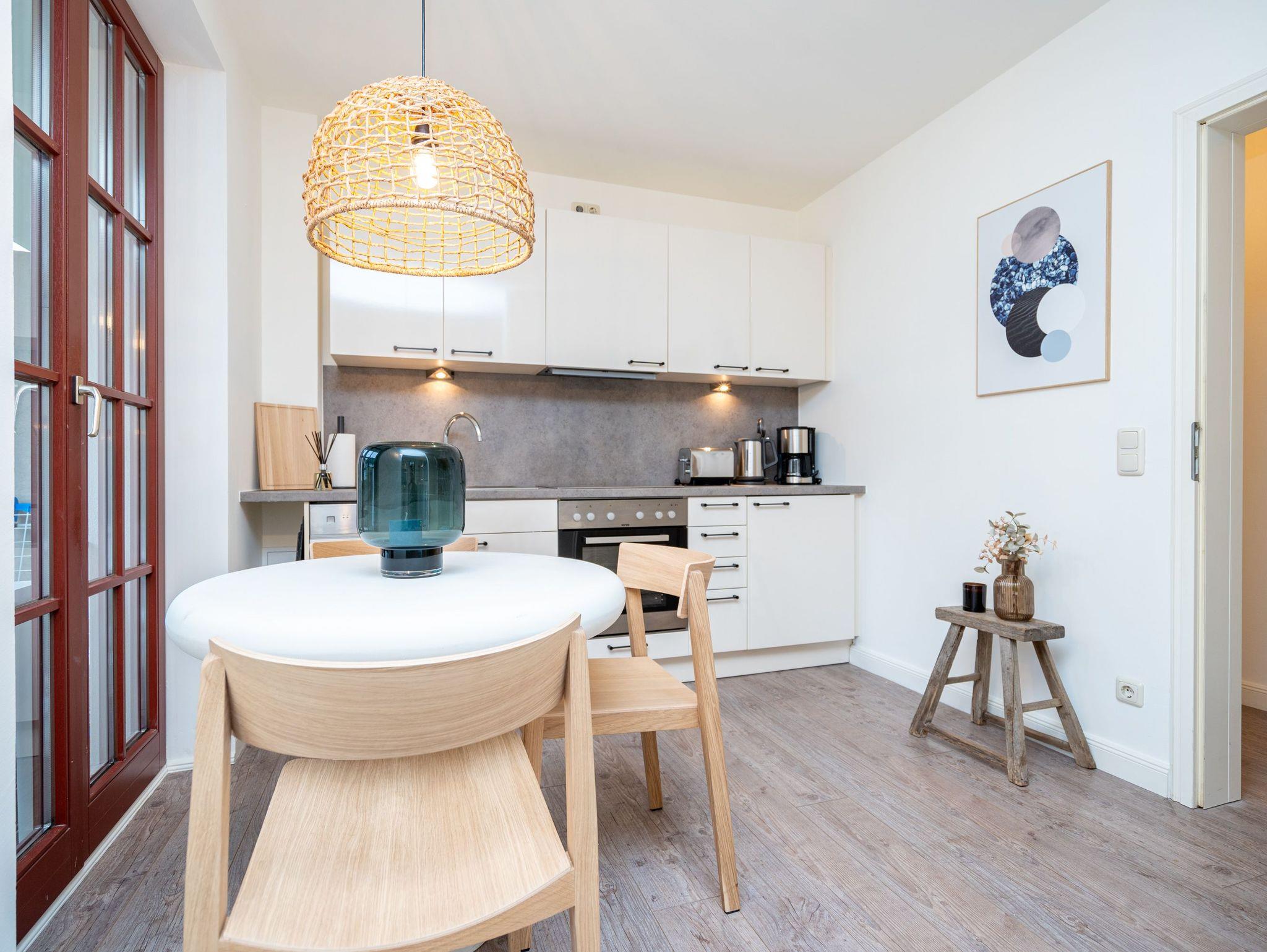 Willkommen in der neu gestalteten 2-Raum-Ferienwohnung (46 m²), Nummer 03, die ab Winter 2024 in frischem Glanz erstrahlt! Die Wohnung befindet sich im Erdgeschoss der charmanten Villa Damaris und bietet Platz für 2 Erwachsene und 1 Kleinkind bis 3 Jahre (im Kinderreisebett). Freuen Sie sich auf eine moderne Ausstattung und stilvolle Dekorationen, die für eine angenehme Urlaubsatmosphäre sorgen. Der lichtdurchflutete Wohnbereich ist mit einer gemütlichen Sitzgruppe und einem Flat-TV ausgestattet. Angrenzend befindet sich eine offene, vollständig eingerichtete Küchenzeile mit Essbereich, die keine Wünsche offenlässt. Das separate Schlafzimmer verfügt über ein komfortables Boxspringdoppelbett, einen Kleiderschrank und einen weiteren Flat-TV. Das moderne Badezimmer bietet eine Dusche, einen Waschtisch und ein WC. Zusätzlich lädt die Terrasse mit einem Tisch und zwei Gartenstühlen zum Verweilen im Freien ein. Für unsere kleinen Gäste stellen wir auf Anfrage gerne ein Kinderreisebett (ohne zusätzliche Matratze und Bettzeug) sowie einen Kinderhochstuhl bereit (gegen Aufpreis). Ihr Fahrzeug parken Sie bequem auf dem zur Wohnung gehörenden Stellplatz Nr. 3 direkt am Haus. Zudem steht Ihnen während Ihres Aufenthalts kostenfreies WLAN zur Verfügung.