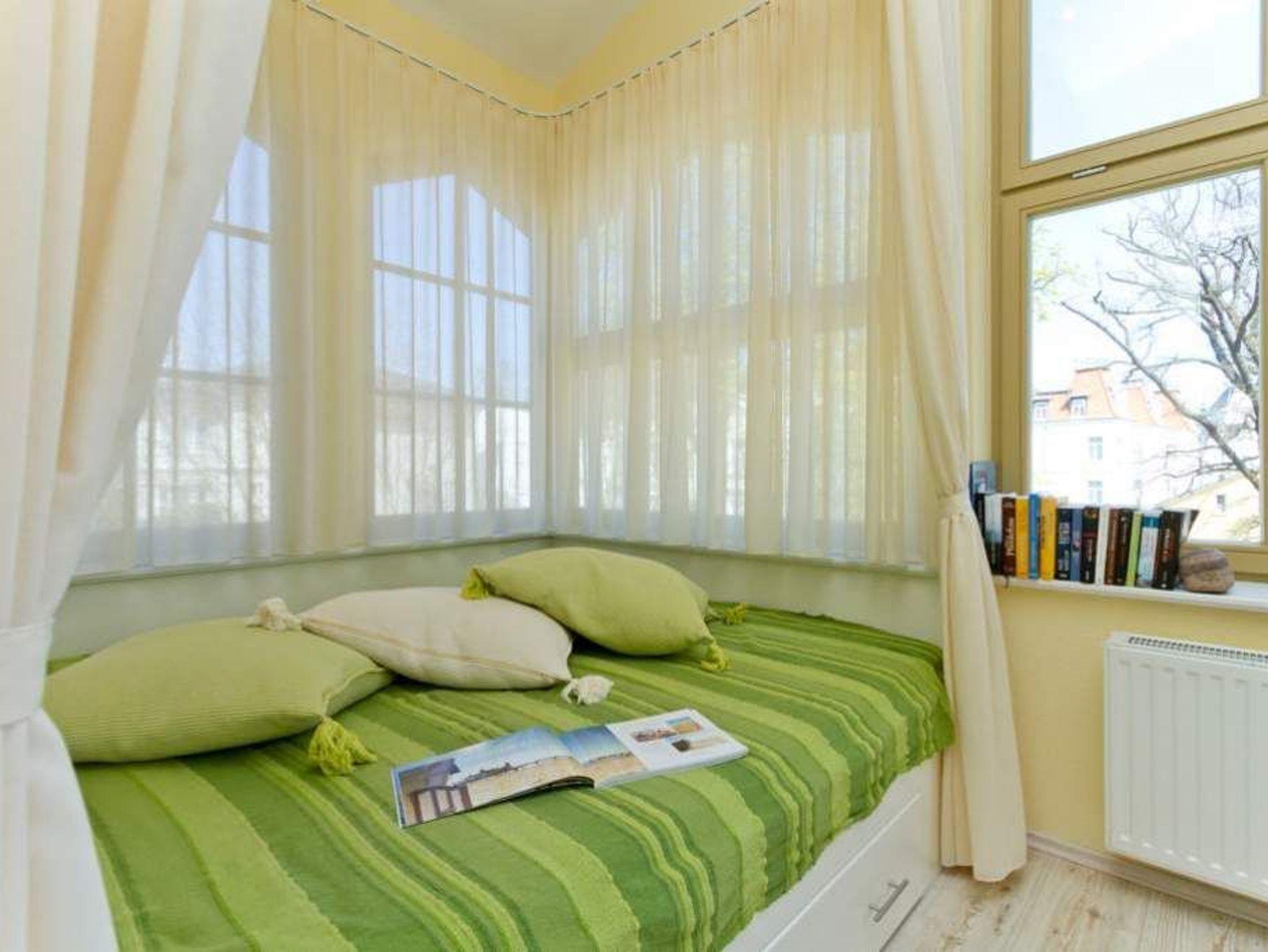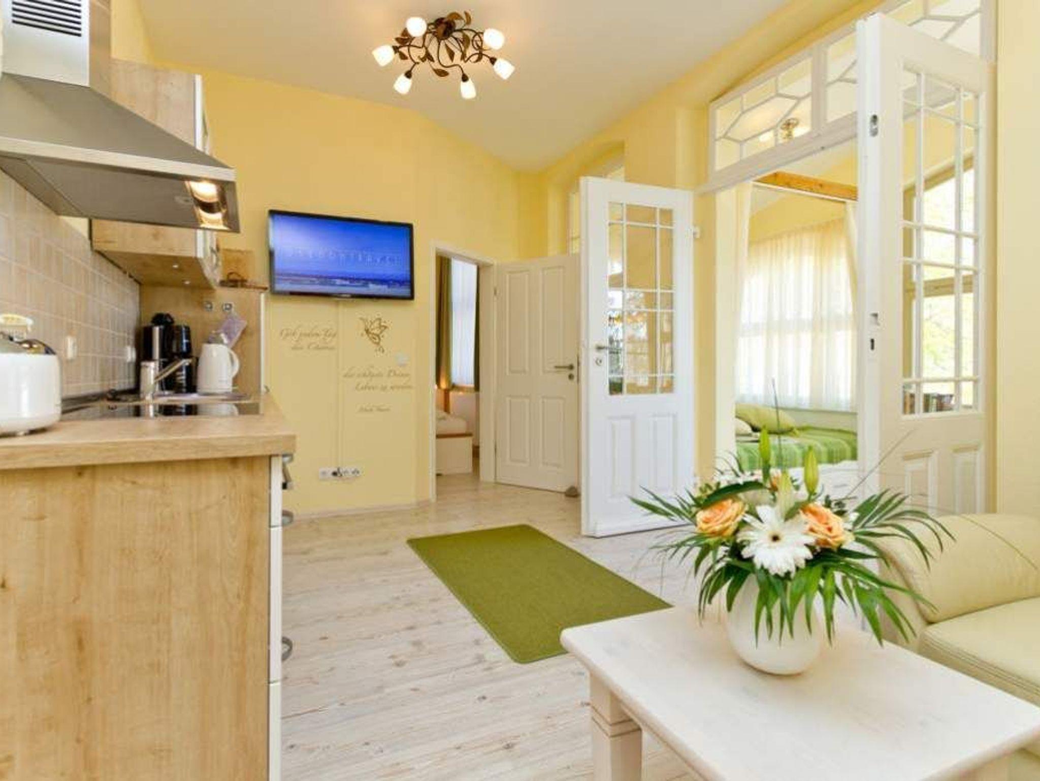 Im 1. Geschoss der Villa empfängt Sie eine wunderschön gestaltete 2-Raum-Ferienwohnung (57qm für maximal 4 Personen). Die moderne, helle Einrichtung im gemütlichen Landhausstil wurde mit den passenden Farben , Stoffen und Dekorationen kombiniert und ergibt so ein schönes Urlaubsdomizil für einen erholsamen Urlaub. Der Wohnbereich ist mit einer Ledersitzgruppe und Flat-TV ausgestattet und wird durch die offene, komplett ausgestattete Küche ergänzt. Ein besonderes Highlight ist die schöne, lichtdurchflutete Loggia. Neben einem Essplatz befindet sich hier eine wunderschöne Liegelandschaft mit freiem Blick in das alte Heringsdorfer Ortszentrum, die, umgeben von altem Baumbestand, ein toller Rückzugsort zum Entspannen ist und gleichzeitig eine vollwertige 3. und 4. Schlafmöglichkeit (einteilige Matratze 1,80 m x 2,00 m) bietet. Das Schlafzimmer mit Doppelbett 1,80 m x 2,00 m und mit zusätzlichem Flat-TV und ein Bad mit Dusche und WC komplettieren das Appartement. Für Ihren Komfort sind die Betten bei der Anreise bezogen und Handtücher liegen bereit (Erstausstattung). Das WLAN-Netz im Haus steht kostenfrei zur Verfügung.