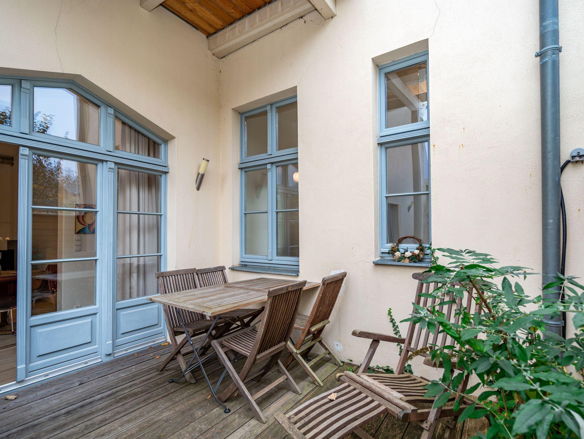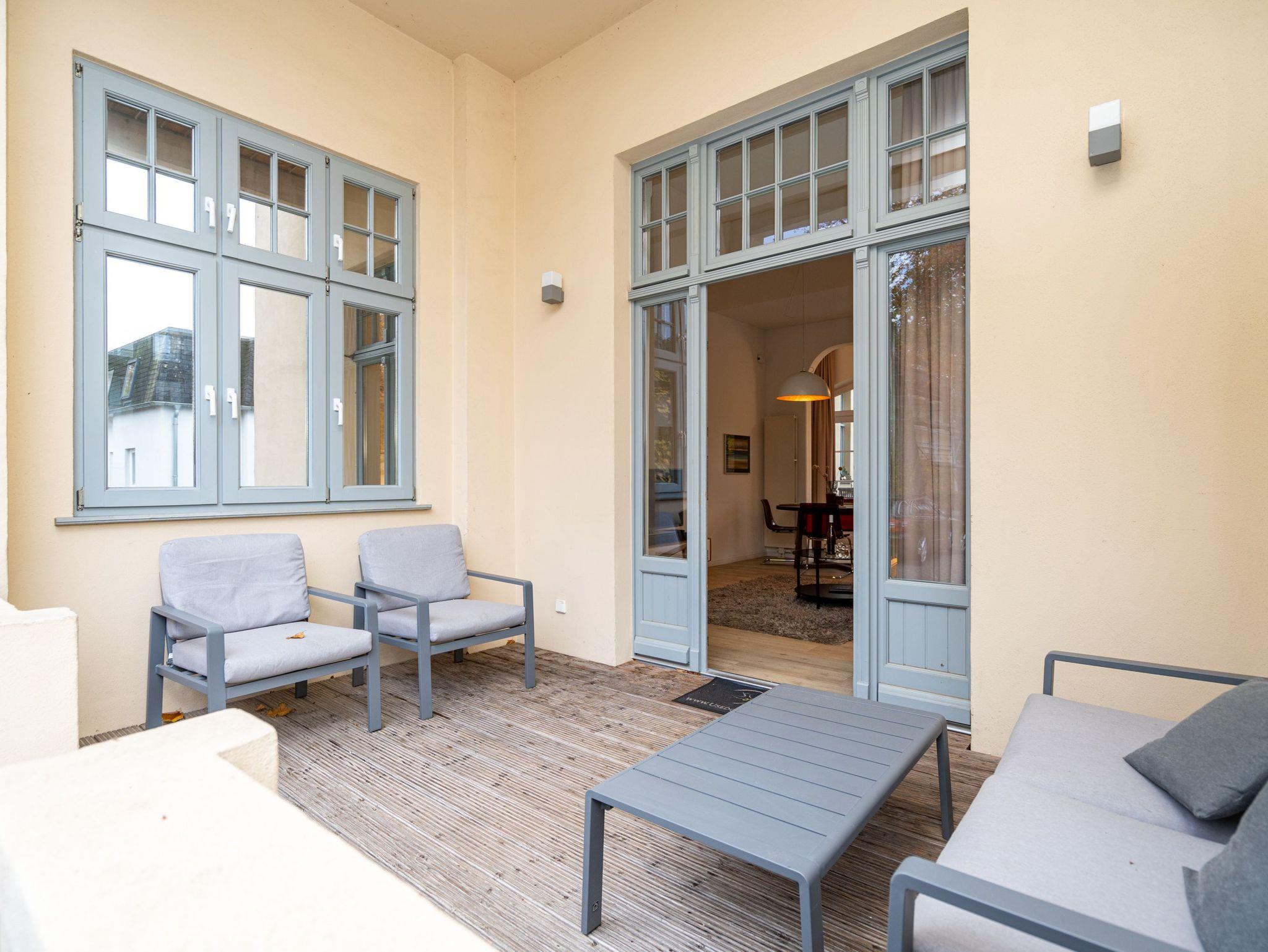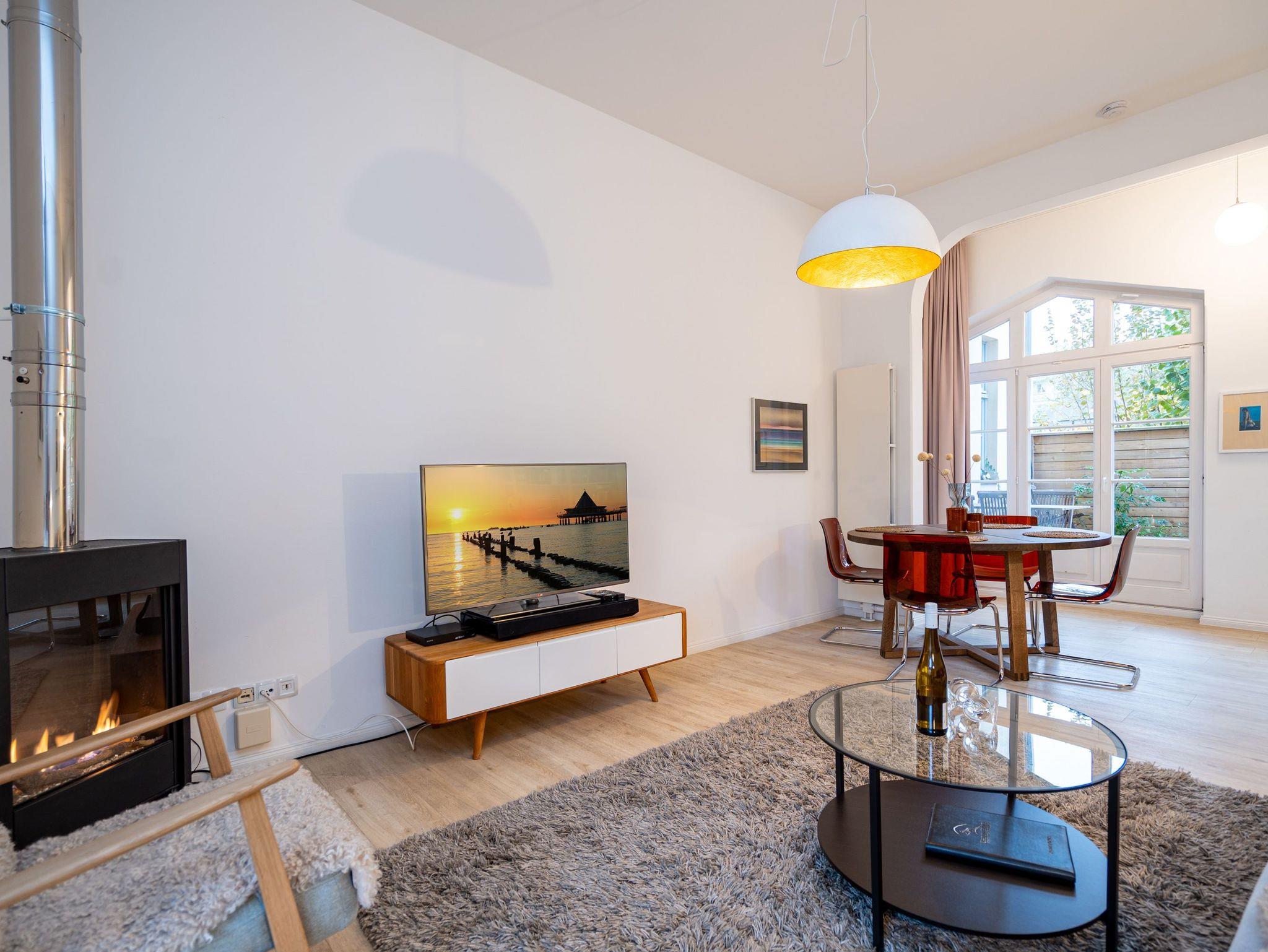 Kaiserzeitliches Villenflair kombiniert mit nordischem Design und modernem Komfort erwartet Sie im Appartement 1 im Erdgeschoss der Heringsdorfer Villa Diehl. Genießen Sie die frische Ostseeluft und das sanfte Rauschen des Meeres auf der wunderschönen, offenen Loggia. Sie ist ein echtes Highlight und entführt Sie in eine andere Zeit ? eine Zeit, in der es keine Hektik, keinen Stress und keinen Arbeitsalltag gibt. Hier können Sie ausspannen und entspannen mit Stil. Im Inneren des 98 Quadratmeter großen Drei-Zimmer-Appartements empfängt Sie viel Bewegungsfreiheit in hellen, lichtdurchfluteten Räumen. Dieses Nichtraucher-Urlaubsdomizil bietet Platz für 4 Personen. Der Gas-Kamin im Wohnzimmer ist ein Hingucker und sorgt für kuschelige Gemütlichkeit. Genauso wie die bequeme Couch. Am großen Flat-TV ist ein Blue-Ray-Player angeschlossen. Die sich dem Wohnbereich unmittelbar anschließende, offene Küche mit schönem Essplatz ist komplett mit hochwertigen Geräten und Geschirr ausgestattet. In jedem der beiden Schlafzimmer sorgt ein Doppelboxspringbett für erholsame Träume. In einem Schlafzimmer befindet sich ebenfalls ein Flat-TV. Ideal für kühle Tage ist die kleine Infrarot-Sauna im Badezimmer. Zur Bad-Ausstattung gehört neben dem Waschtisch und dem WC eine geräumige Echtglas-Dusche. Zudem verfügt das Appartement über ein separates Gäste-WC. Für Ihren uneingeschränkten Komfort sind die Betten bezogen und Handtücher liegen für Sie bereit. Der WLAN-Zugang ist kostenfrei nutzbar. Zu Ihrem Urlaubsparadies gehört ein Pkw-Stellplatz auf dem Hof.