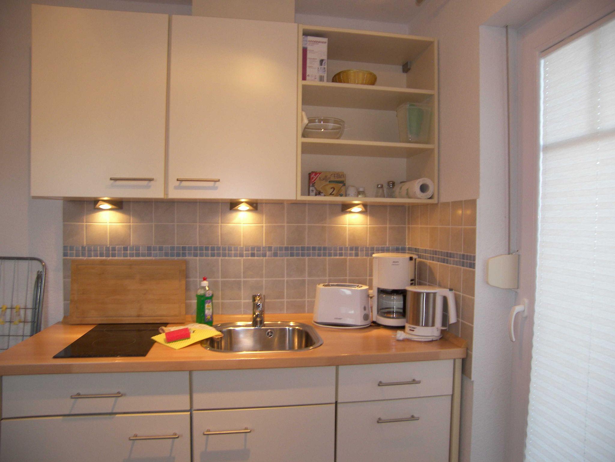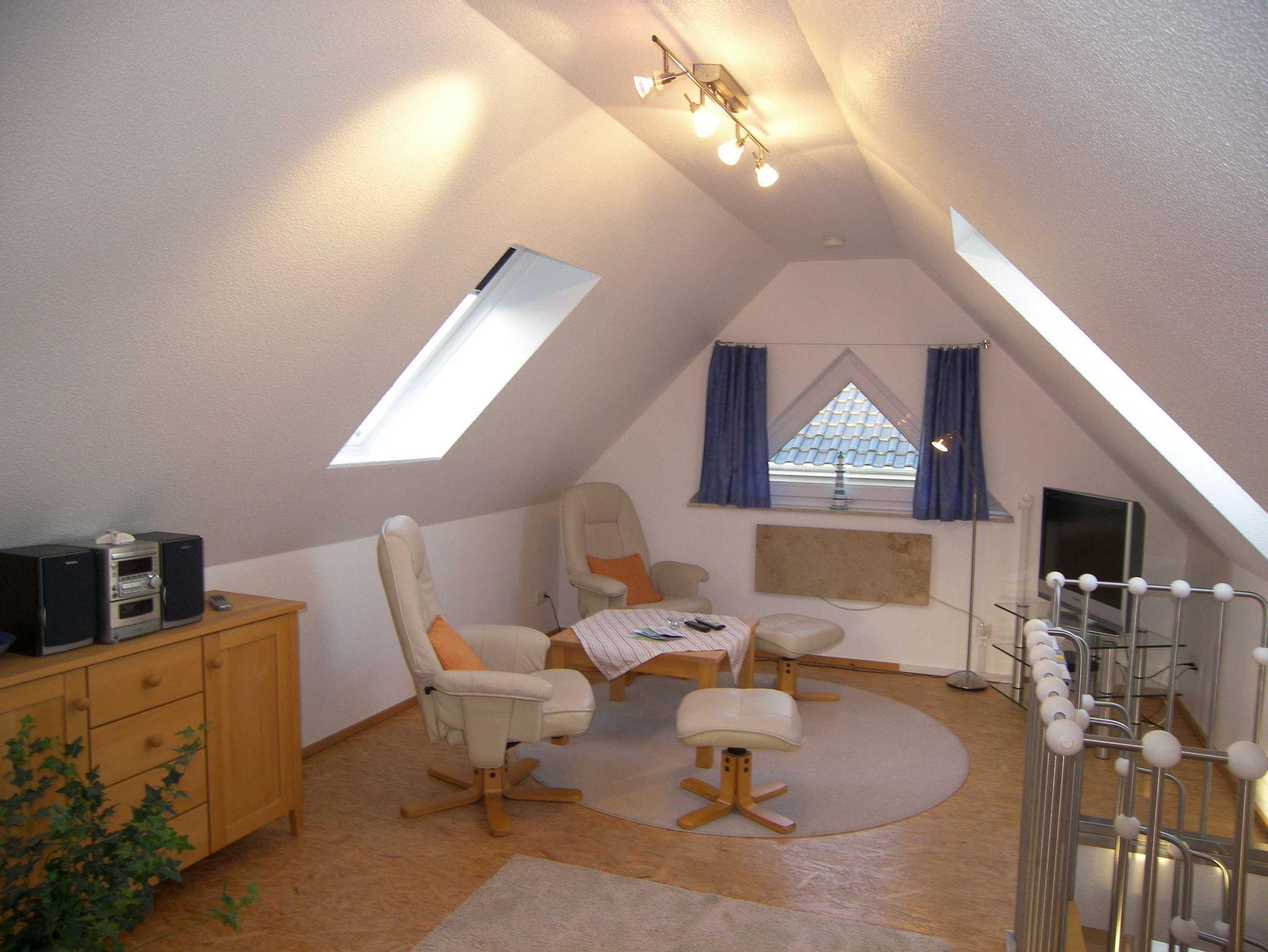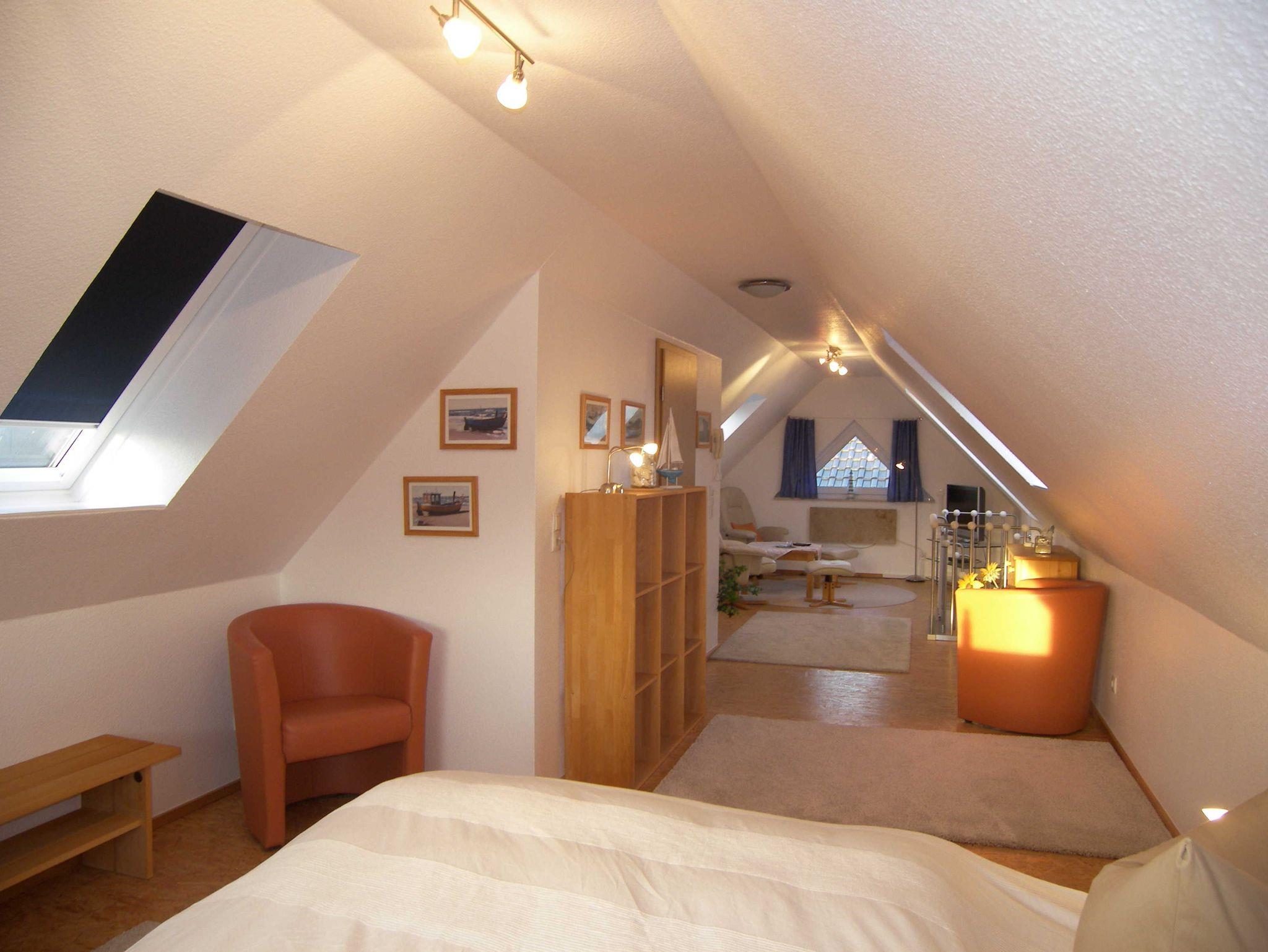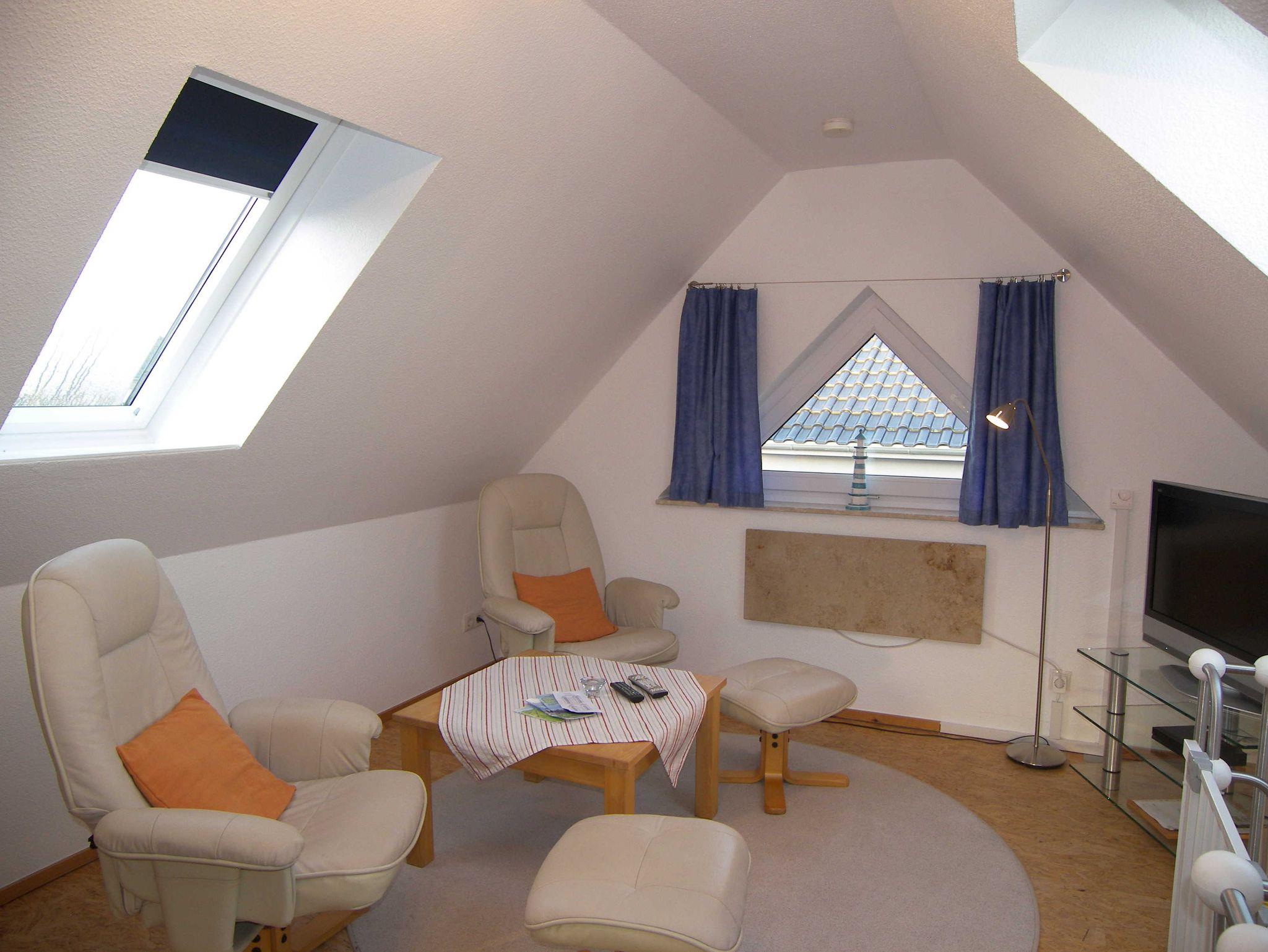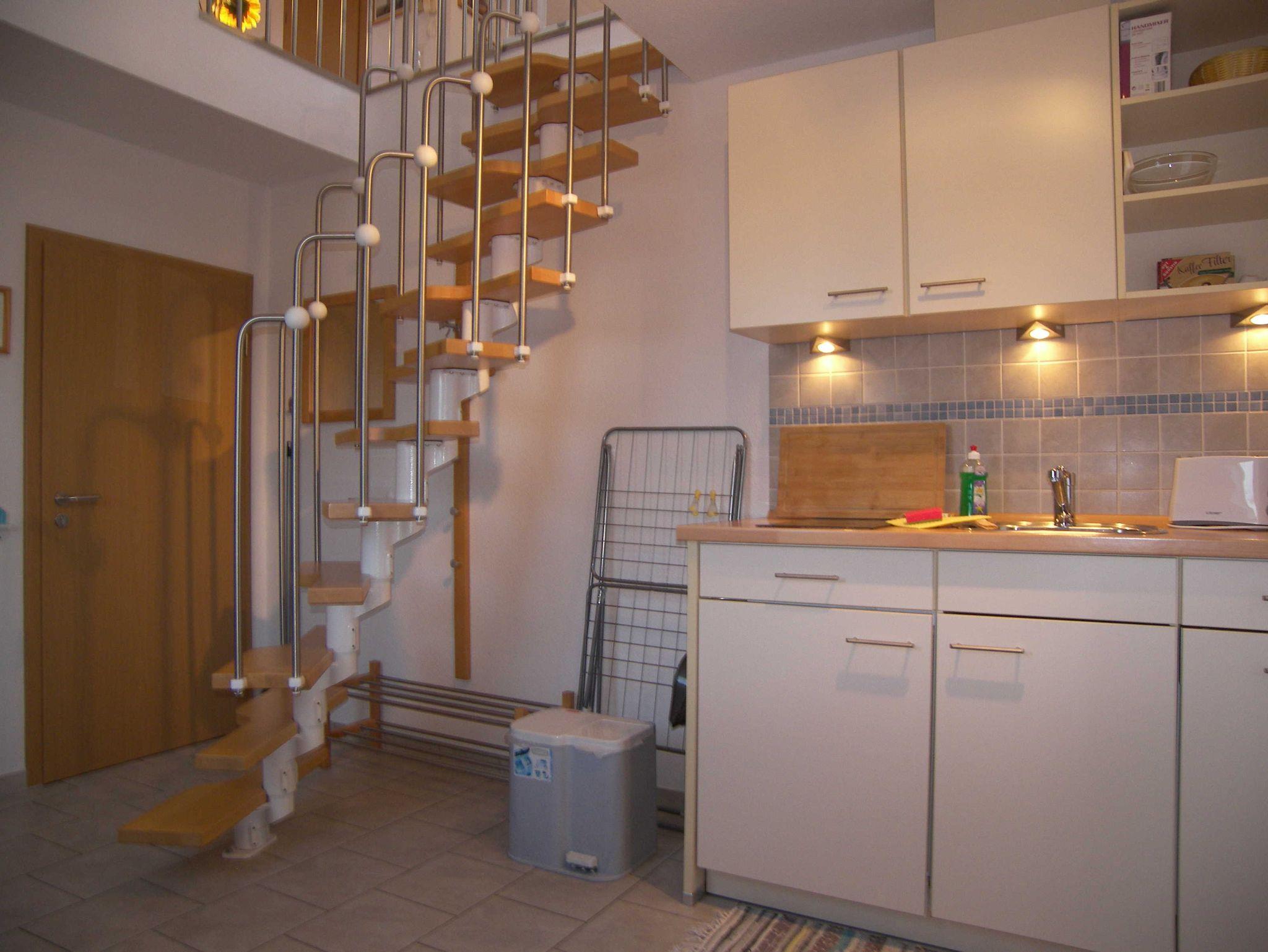 Die ca. 58qm große, modern eingerichtete Maisonette-Ferienwohnung befindet sich im 1. OG und Dachgeschoss. Auf der unteren Ebene befindet sich der Essbereich und die Küchenzeile mit Cerankochfeld, Mikrowelle, Geschirrspüler, Kühlschrank, Kaffeemaschine, Toaster und Wasserkocher. Vom Essbereich aus, gelangen Sie auf den sonnigen Balkon. Ebenfalls befindet sich das Badezimmer mit Dusche/WC und Haartrockner auf der unteren Ebene. Über eine Raumspartreppe erreichen Sie den Wohn- und Schlafbereich mit Sitzecke und TV sowie einem Doppelbett ausgestattet. Bitte beachten Sie, dass eine Raumspartreppe sehr steil ist und für ältere Gäste nicht geeignet ist.