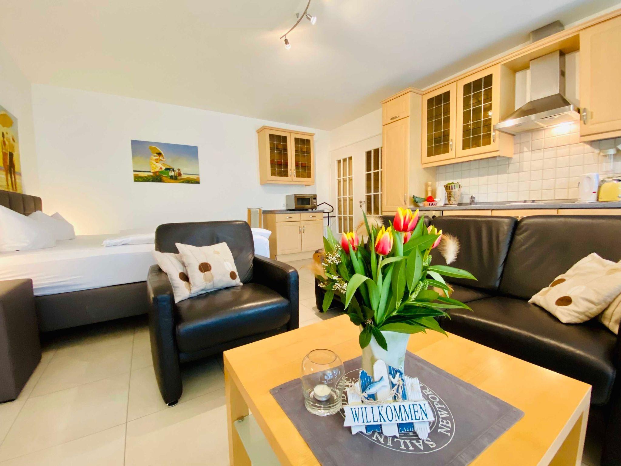 Sie verfügt über ein großes Boxspringbett, kleine Couchecke sowie eine Küchenzeile.