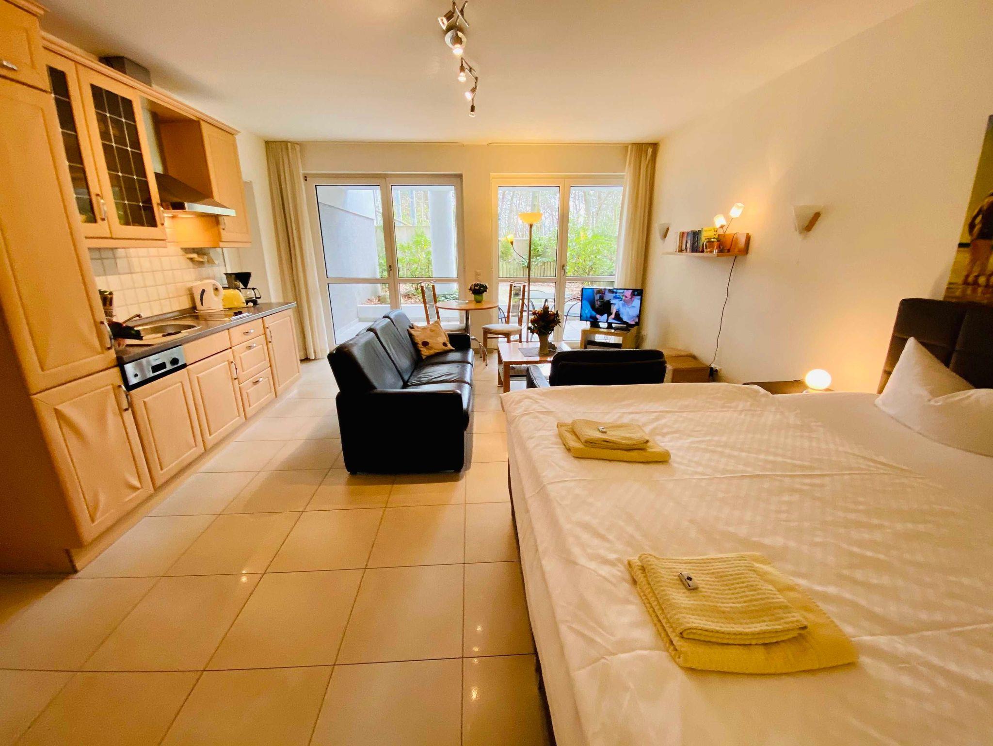 Das großzügige Studio-Apartement mit eigener Sauna befindet sich im Untergeschoss der Villa Seepark.
