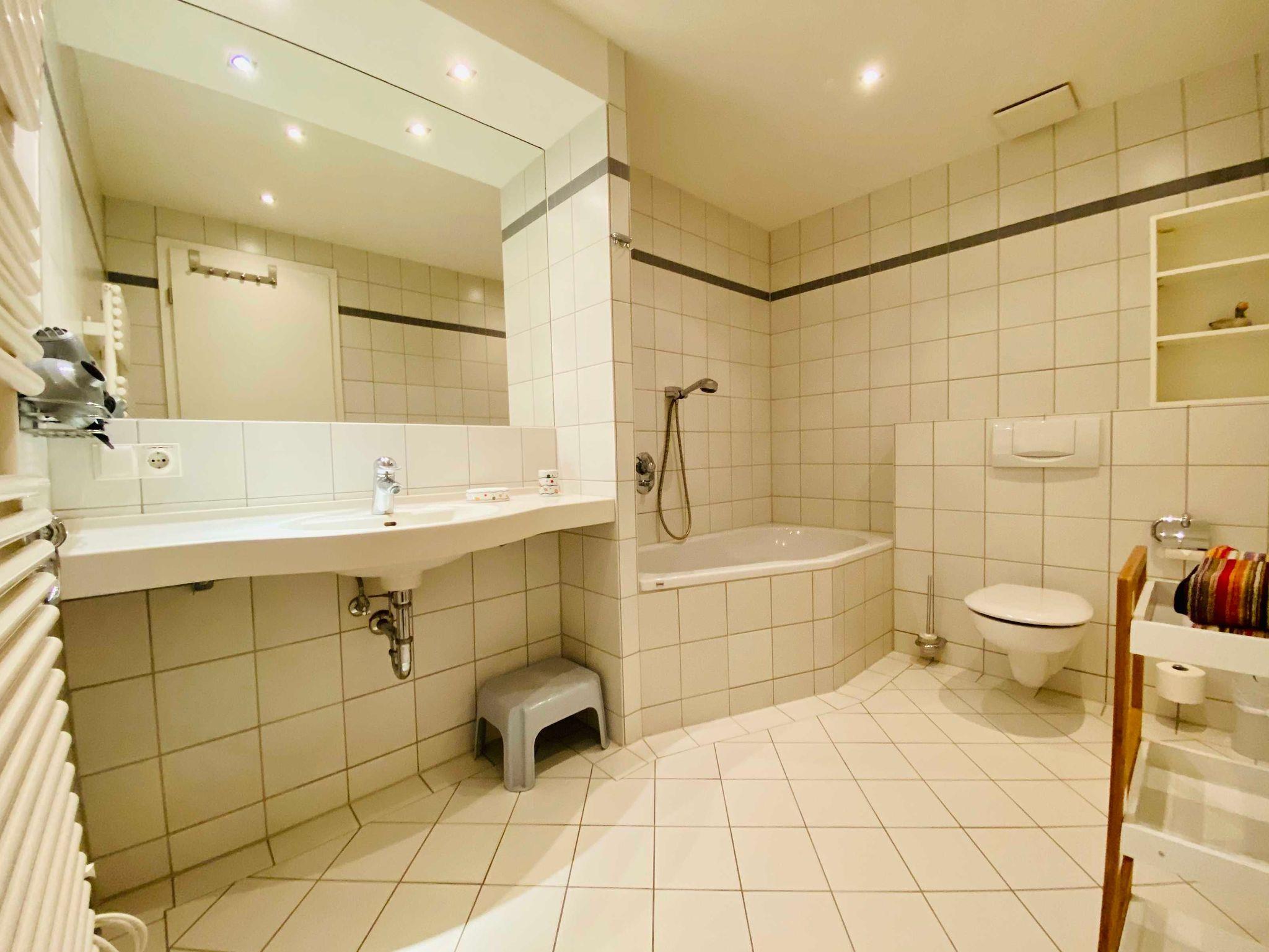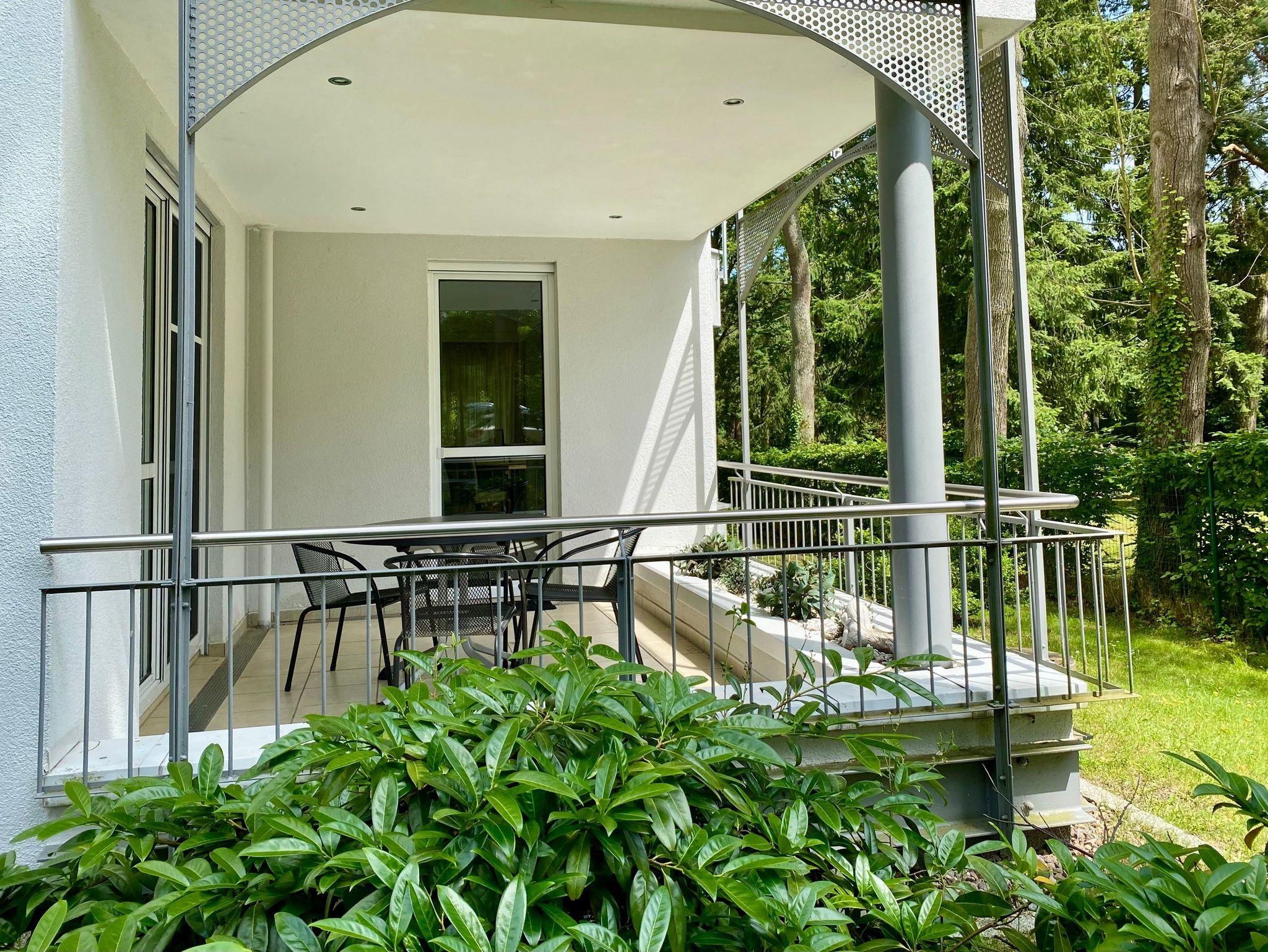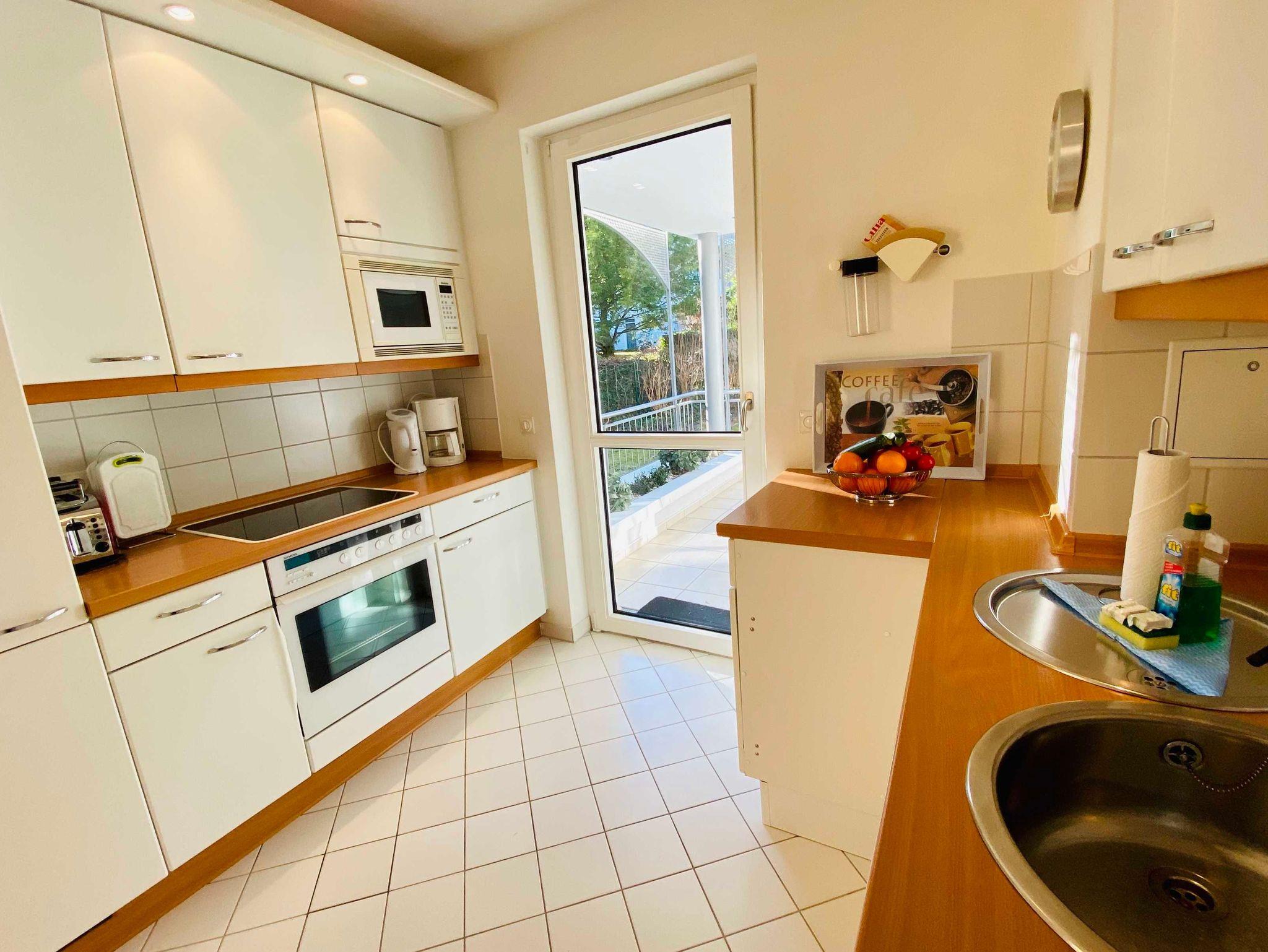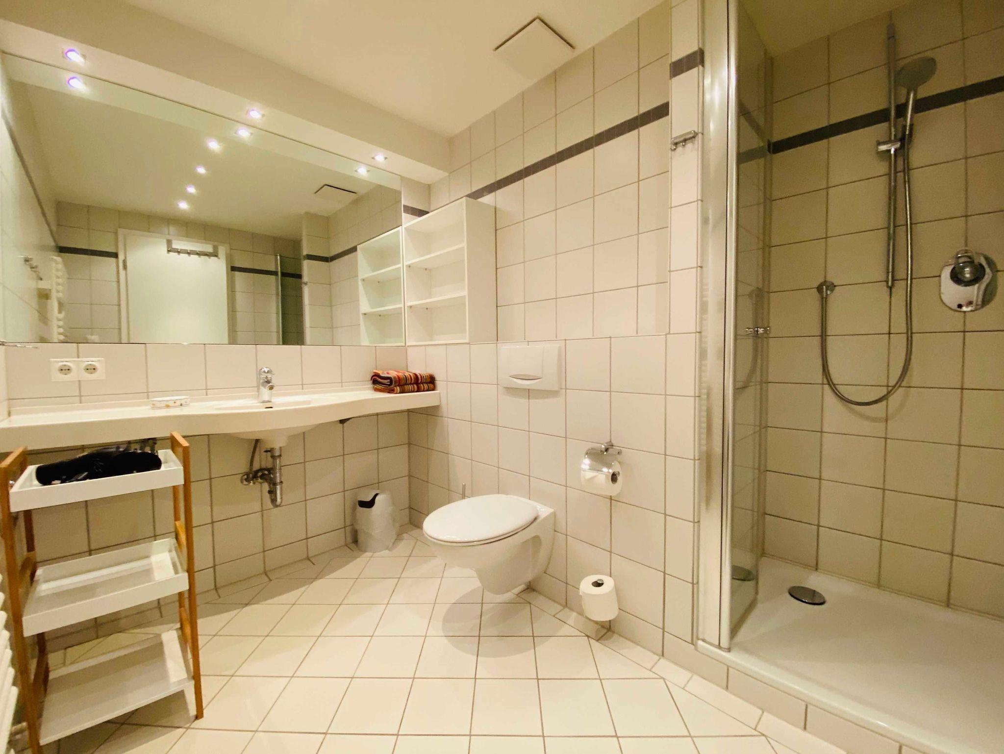 Sie besteht aus einem großzügigen Wohnraum mit Couchecke, TV und Esstisch. Vom Wohnzimmer aus gelangen Sie zur separaten Komplettküche (Geschirrspüler, Mikrowelle, Backofen). Genießen Sie zwei Balkone in Richtung Süd bzw. Promenade mit Blick in den Park der Residenz Bleichröder.