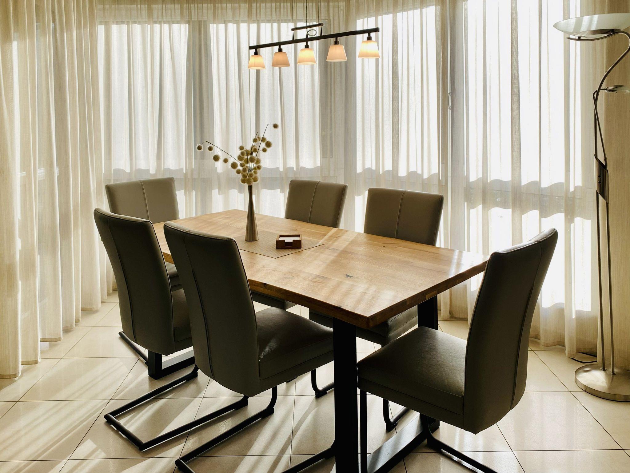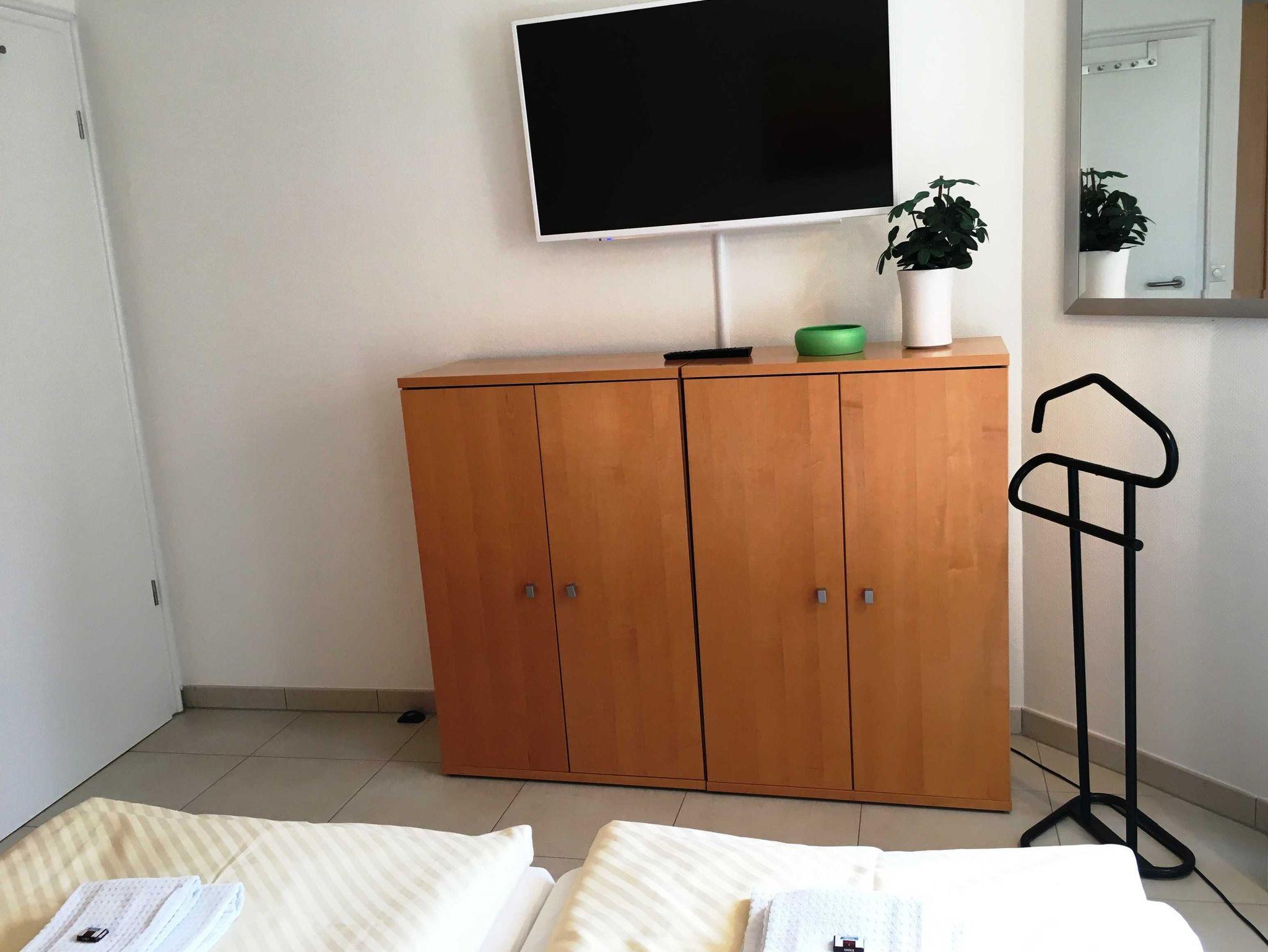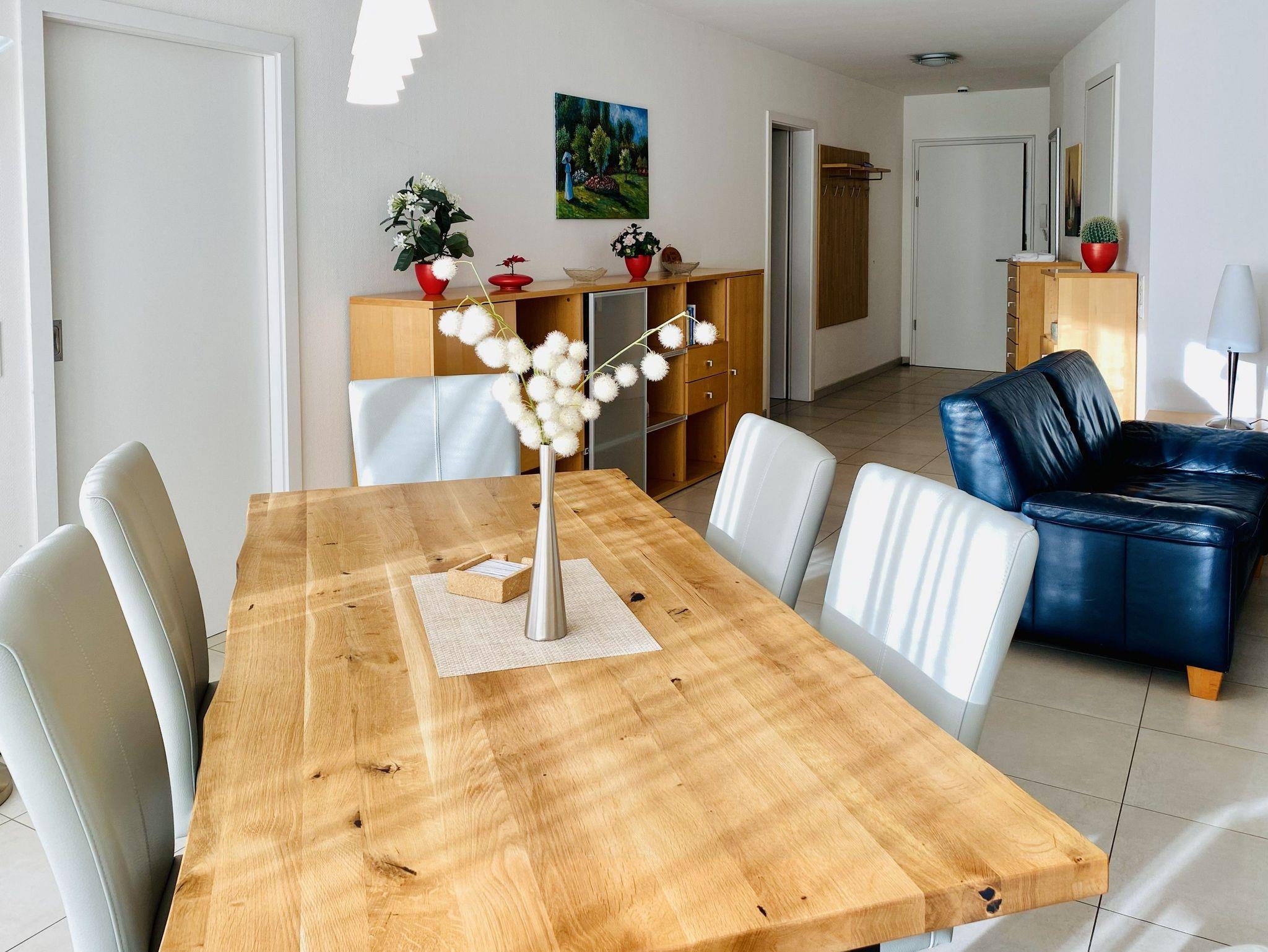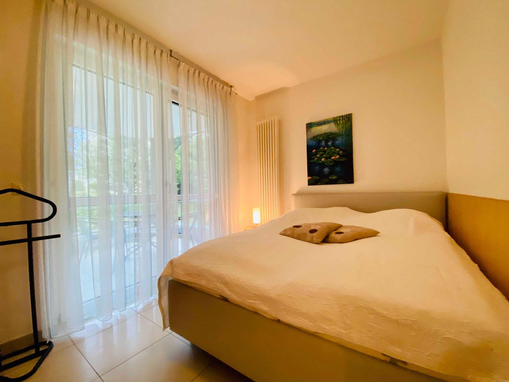Sie besteht aus einem großzügigen Wohnraum mit Couchecke, TV und Esstisch. Vom Wohnzimmer aus gelangen Sie zur separaten Komplettküche (Geschirrspüler, Mikrowelle, Backofen). Genießen Sie zwei Balkone in Richtung Süd bzw. Promenade mit Blick in den Park der Residenz Bleichröder.
