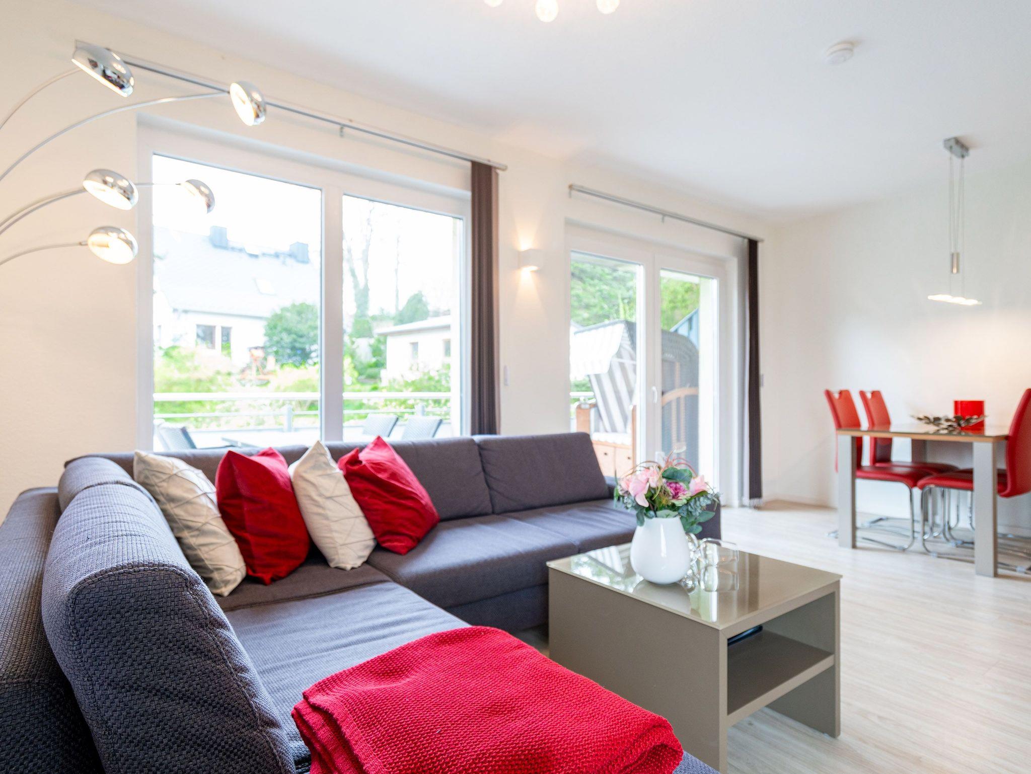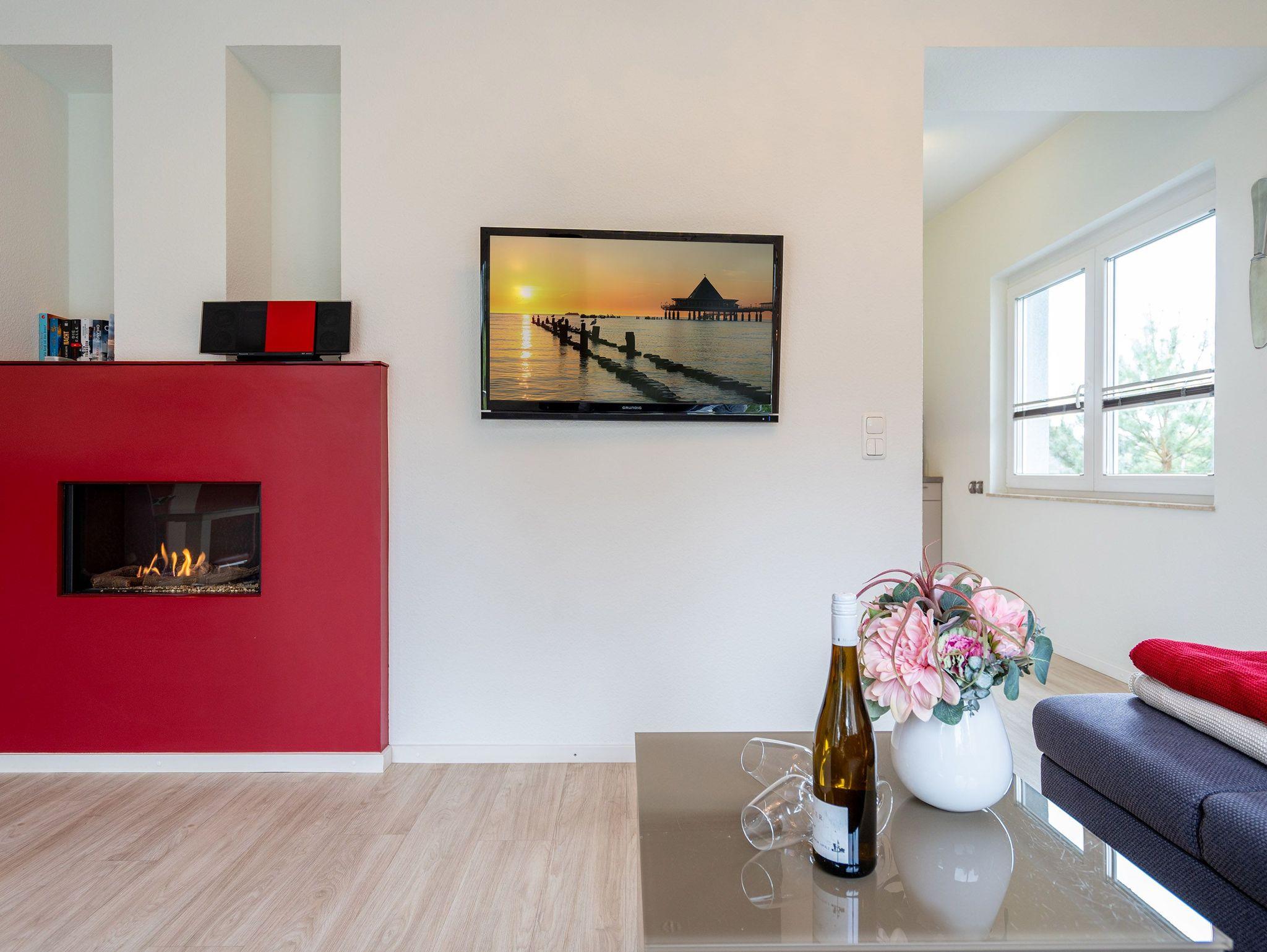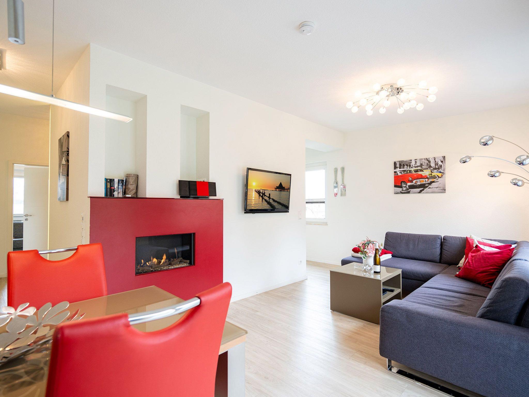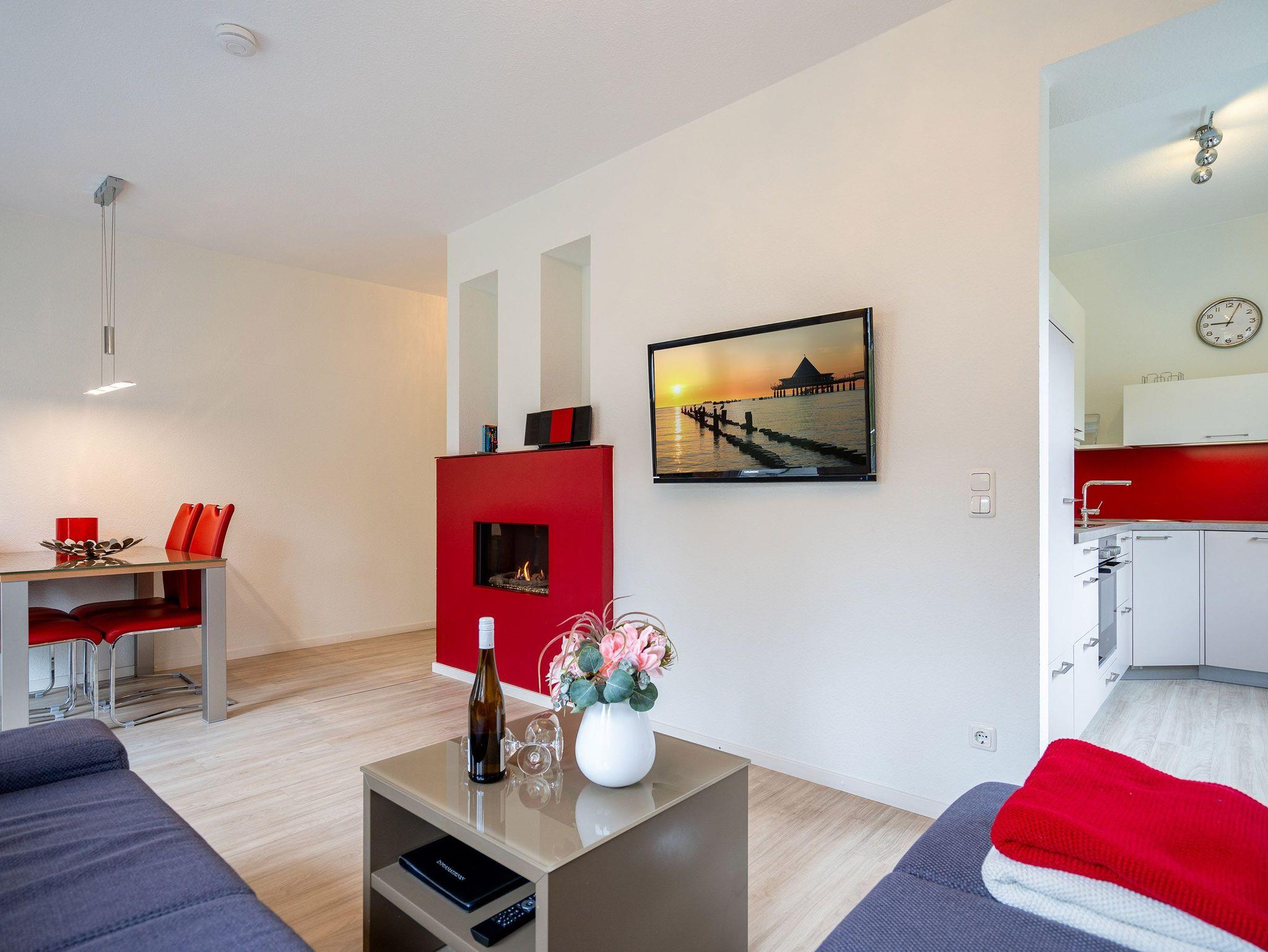 Sonne über Sonne lassen Sie in diesem Appartement auf alle möglichen Arten entspannen und neue Energie tanken. Das 61 Quadratmeter große Ferien-Appartement, zu dem Sie ganz bequem per Fahrstuhl gelangen können, ist für einen Urlaub an der Ostsee die ideale Ruhe-Oase. Dazu passt der Spruch Ihres Domizils ideal: Gönne dir einen Augenblick der Ruhe und achte auf das, was dir Freude macht. Bis zu drei Personen und ein Kleinkind (im kostenpflichtig dazu buchbaren Kinderreisebett) können es sich hier gut gehen lassen. Auf Wunsch stellen wir auch einen Kinderhochstuhl in die Wohnung. Das Urlaubsdomizil ist hell und modern eingerichtet. Frische Farben, Bilder und Accessoires sorgen für Akzente. Das Wohnzimmer ist großzügig geschnitten, bietet viel Platz zum Kuscheln auf dem Sofa vor dem flackernden Flammenspiel des Gas-Kamins oder dem großen Flat-TV. Genießen Sie darüber hinaus den großen Südbalkon oder essen Sie entspannt am schönen Esstisch. Die Küche ist offen und mit Geräten wie Herd, Kühlschrank, Spülmaschine, Mikrowelle, Toaster etc. voll ausgestattet. Und da man für ein gemeinsames Essen auch Geschirr braucht, ist dieses dort ebenfalls zu finden. Den großen Südbalkon (17 Quadratmeter groß) mit Strandkorb können Sie vom Wohnzimmer aus betreten. Ob beim Sonnenbaden auf den Liegen oder beim Frühstück im Freien ? die frische Ostseeluft erfrischt so oder so Körper und Seele. Das Appartement hat zwei Schlafzimmer. Eines verfügt über ein bequemes Boxspringdoppelbett, einen stummen Diener zum Aufhängen Ihrer Sachen, einen geräumigen Schrank und einen Flat TV. Im zweiten Schlafzimmer steht eine ausziehbare Schlafcouch (1,40 m x 2,00 m). Auch hier gibt es einen Fernseher und einen großen Schrank. Das Badezimmer verfügt über Dusche, Waschtisch und WC. Handtücher liegen für Sie bereit und die Betten sind bei Anreise bezogen. Das WLAN ist kostenfrei. Ein Pkw-Stellplatz ist in der Tiefgarage vorhanden.