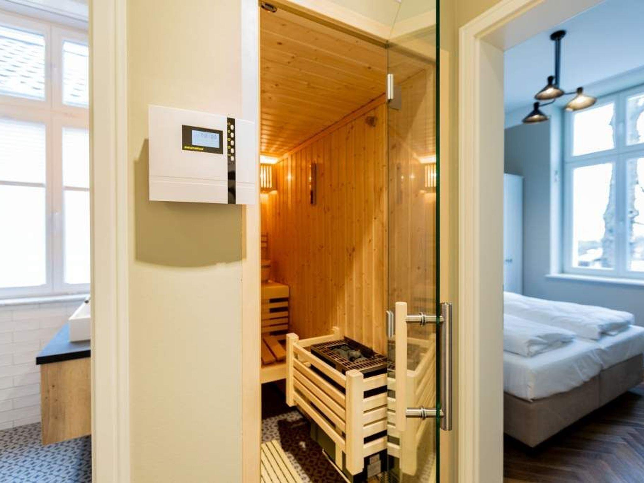 Vom Fischgrät-Parkett bis zu den edlen Design-Tapeten ? in der geschmackvoll eingerichteten Wohnung Nummer 3 im Erdgeschoss der Villa Bellevue hat alles Stil. Mit einem Händchen für exquisite Möbel und viel Liebe zum Detail ist das ganze Interieur des 70-Quadratmeter-Appartements in sich stimmig und besticht vom ersten Moment an als eine echte Wohlfühloase für Designliebhaber. Vor allem die Kombination aus sichtbar gelassener Bausubstanz und modernem Wohnkonzept macht einen großen Reiz dieses Domizils aus. Genießen Sie hier Ihre Auszeit mit Freunden oder der Familie. Vier Erwachsenen mit bis zu zwei Kindern bis drei Jahre (im Kinderreisebett) bieten die drei Räume viel Platz zum Entspannen und Urlauben. Highlight des offenen Wohn-Esszimmers ist der schöne, mit Vintage-Fliesen eingefasste Gas-Kamin, der per Knopfdruck wohlige Wärme spendet und mit seinem Flammenspiel ein wahrer Entschleuniger ist. Den besten Blick darauf haben Sie von der gemütlichen Sofalandschaft des Wohnbereichs. Für Unterhaltung sorgt zudem der 42-Zoll-Flat TV. Die West-Terrasse vor dem Wohnzimmer lädt zum Sonnen, Faulenzen und Sitzen ein. Vor allem gegen Abend ist sie ein wunderbar sonniges Plätzchen. Die weiße und offene Küche im Landhausstil ist mit allen modernen Geräten ausgestattet, die es für ein gemeinsames Kochevent braucht. Der Essplatz mit den stylischen Retro-Freischwingern eignet sich ideal zum Dinieren und Diskutieren. Die beiden Schlafzimmer warten mit jeweils einem komfortablen Boxspringdoppelbett (beide 1,80 m x 2,00 m) nur darauf, Ihnen auch nachts Freude zu bereiten. Wunderschön sind die in beiden Zimmern unterschiedlichen Tapeten. Wellness in den eigenen vier Wänden, das können Sie in der finnische Sauna genießen. Die anschließende Dusche im geräumigen Badezimmer kann bei so viel Platz sogar zu zweit Spaß machen. Die Wohnung hat einen kostenfreien WLAN-Zugang und einen Pkw-Stellpatz. Lassen Sie sich einfach fallen. Wir haben für Sie die Betten bei der Anreise bezogen und Handtücher bereit gelegt.