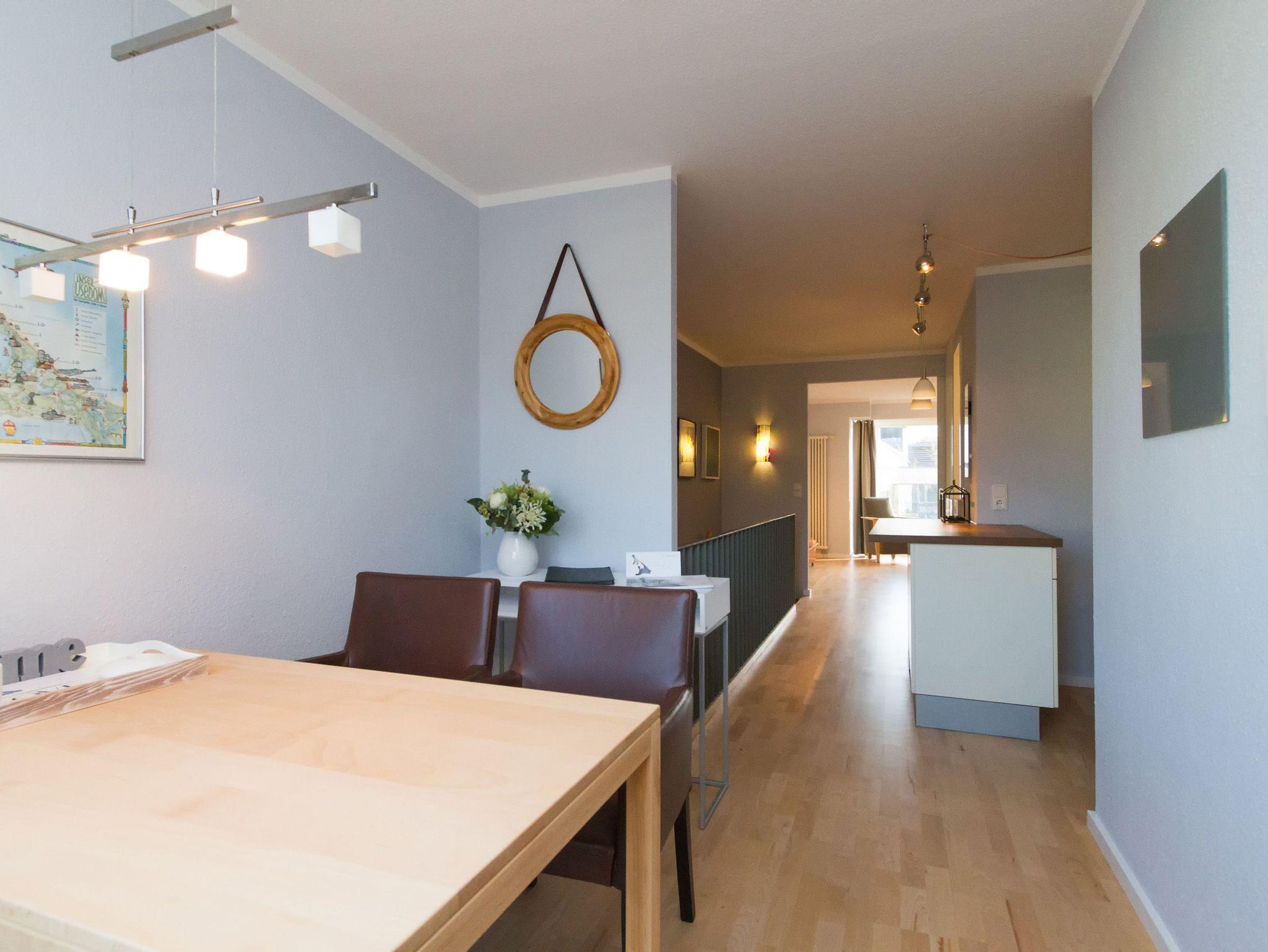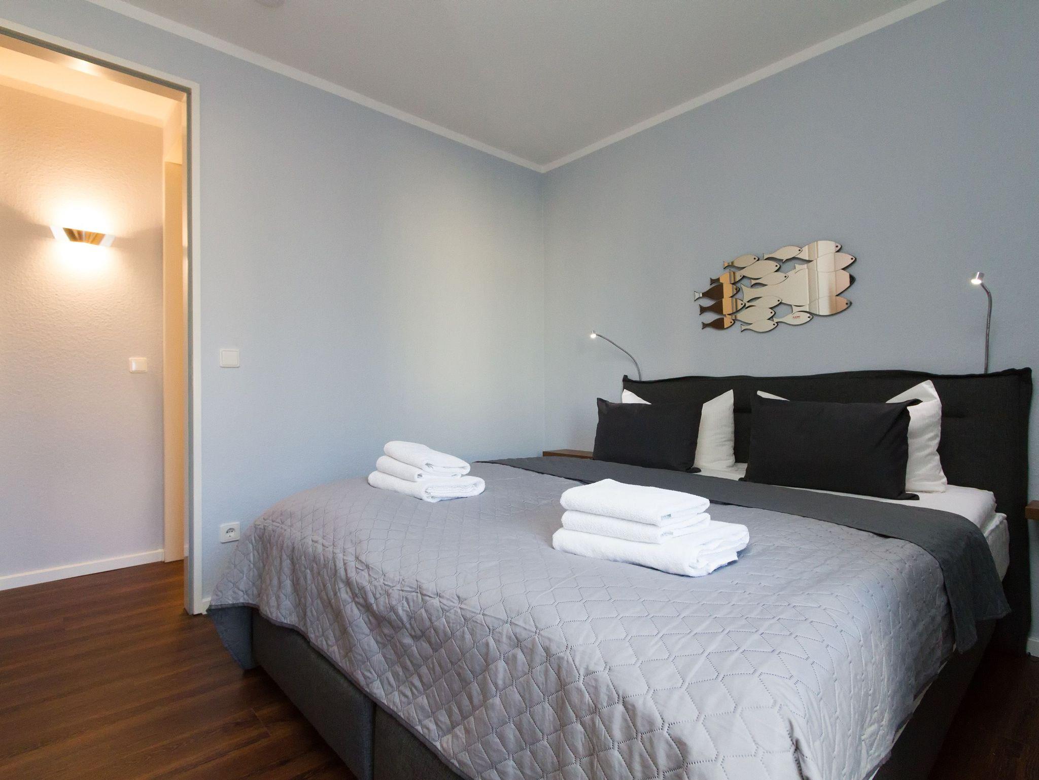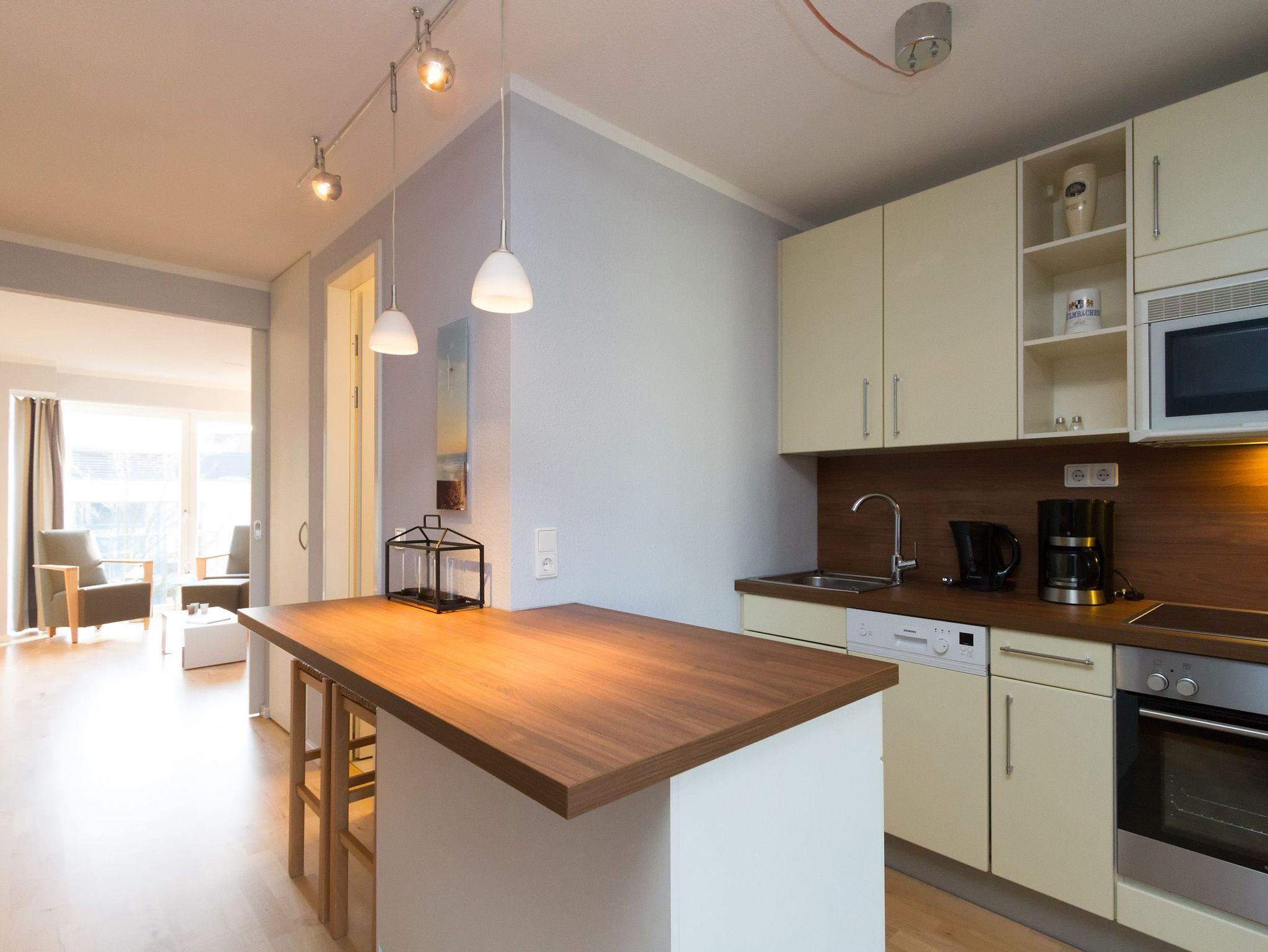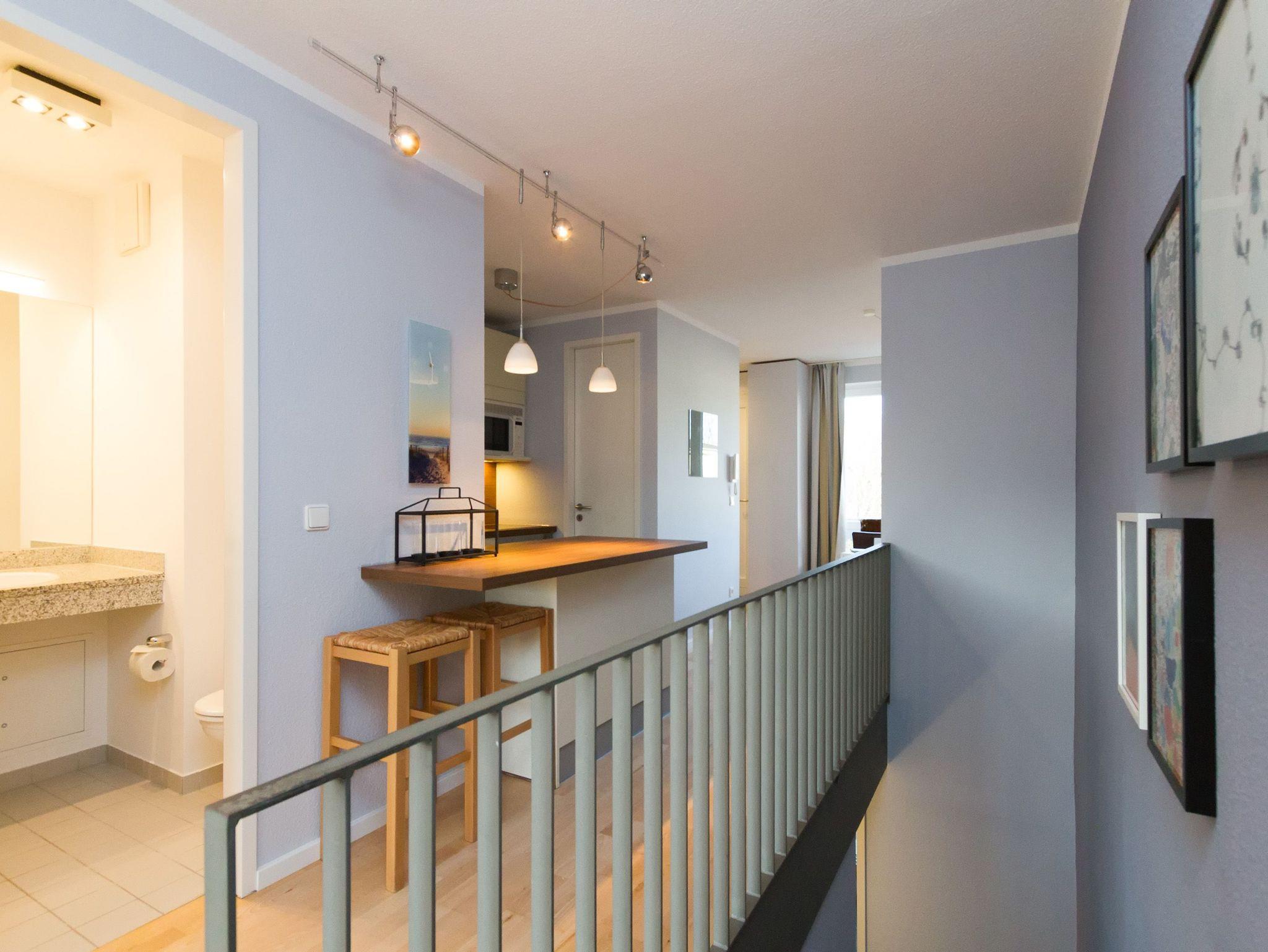Modern, gemütlich und lichtdurchflutet hell präsentiert sich das Appartement Nummer 15 im Forum Marinar. Über zwei Etagen lädt die stilvolle Maisonette-Wohnung mit ihren 58 Quadratmetern zum ausgiebigen Entspannen und Urlauben ein. Zumal der feine, weiße Ostseestrand in unmittelbarer Nähe und sogar seitlicher Sichtweite liegt und an stürmischen Tagen für die richtige Wellenrauschkulisse sorgt. Ein schöner, großer Wohnbereich mit einem Kuschelsofa, das zur Schlafcouch umfunktioniert werden kann, zwei komfortablen Sesseln und einem Flat-TV empfängt Sie in der 2. Etage. Platz ist in den zwei Zimmern für zwei bis vier Personen. Eine offene Küchenzeile ist mit allem ausgestattet, was zum Kochen und Essen gebraucht wird. Ein schöner Esstisch nebst Stühlen und Bank sorgt beim Zusammensitzen für Gemütlichkeit. Auf der Wohnetage befindet sich zudem ein Gäste-WC. In der ersten Etage liegt das Schlafzimmer mit einem bequemen Boxspringdoppelbett (1,60 m x 2,00 m), einem großen Schrank und Flat-TV und ein schönes und geräumiges Badezimmer mit Waschtisch, WC und Badewanne. Entspannung pur, denn Sie brauchen sich um nichts kümmern. Handtücher liegen bereit und das Bett ist bezogen. Zu der Wohnung gehört ein Pkw-Stellplatz. In den Monaten April bis Juni und September bis November haben Sie zudem freien und kostenlosen Zugang zum Wellnessbereiches des 750 Meter entfernten Kaiser Spa Hotel Zur Post.