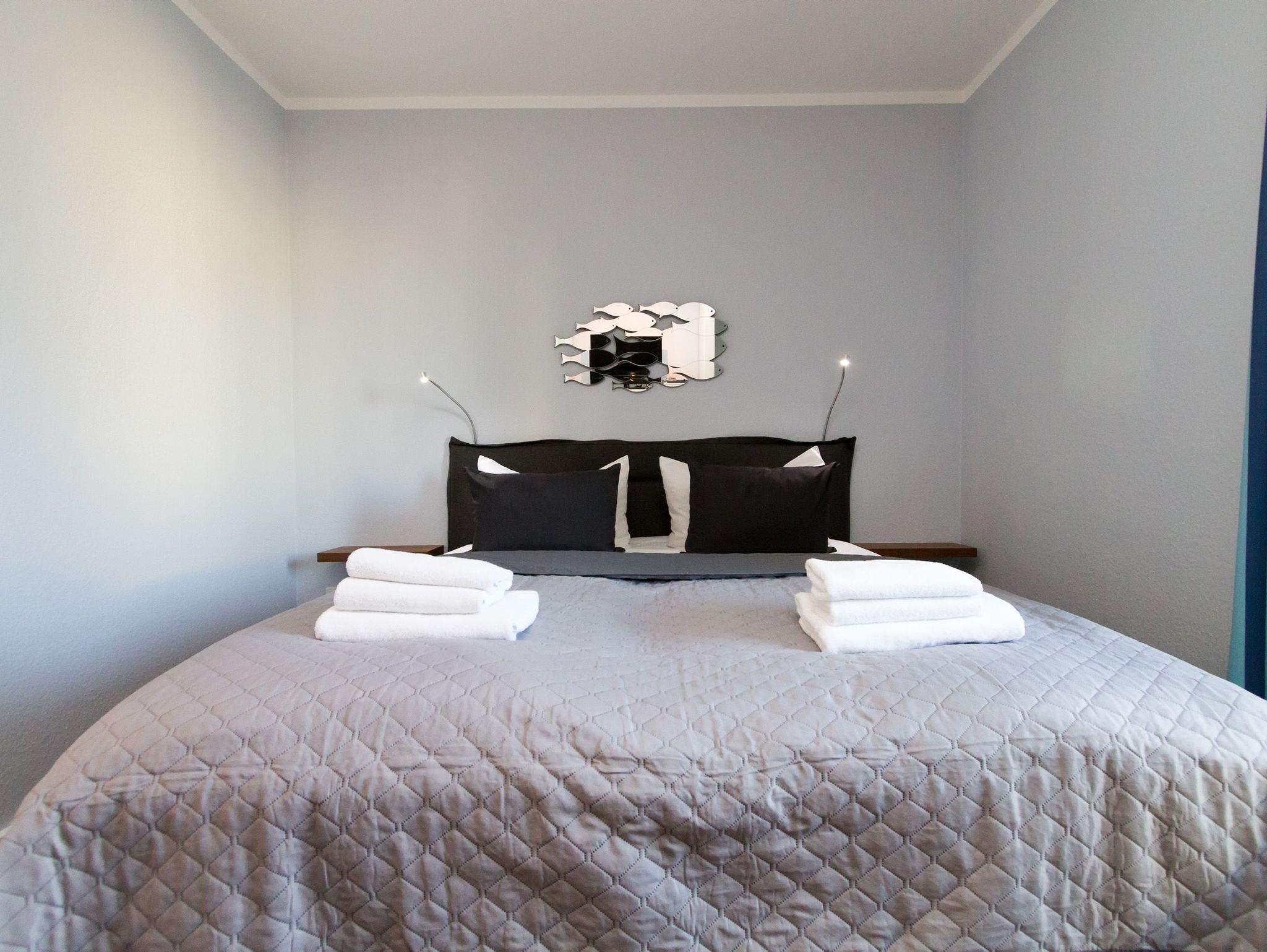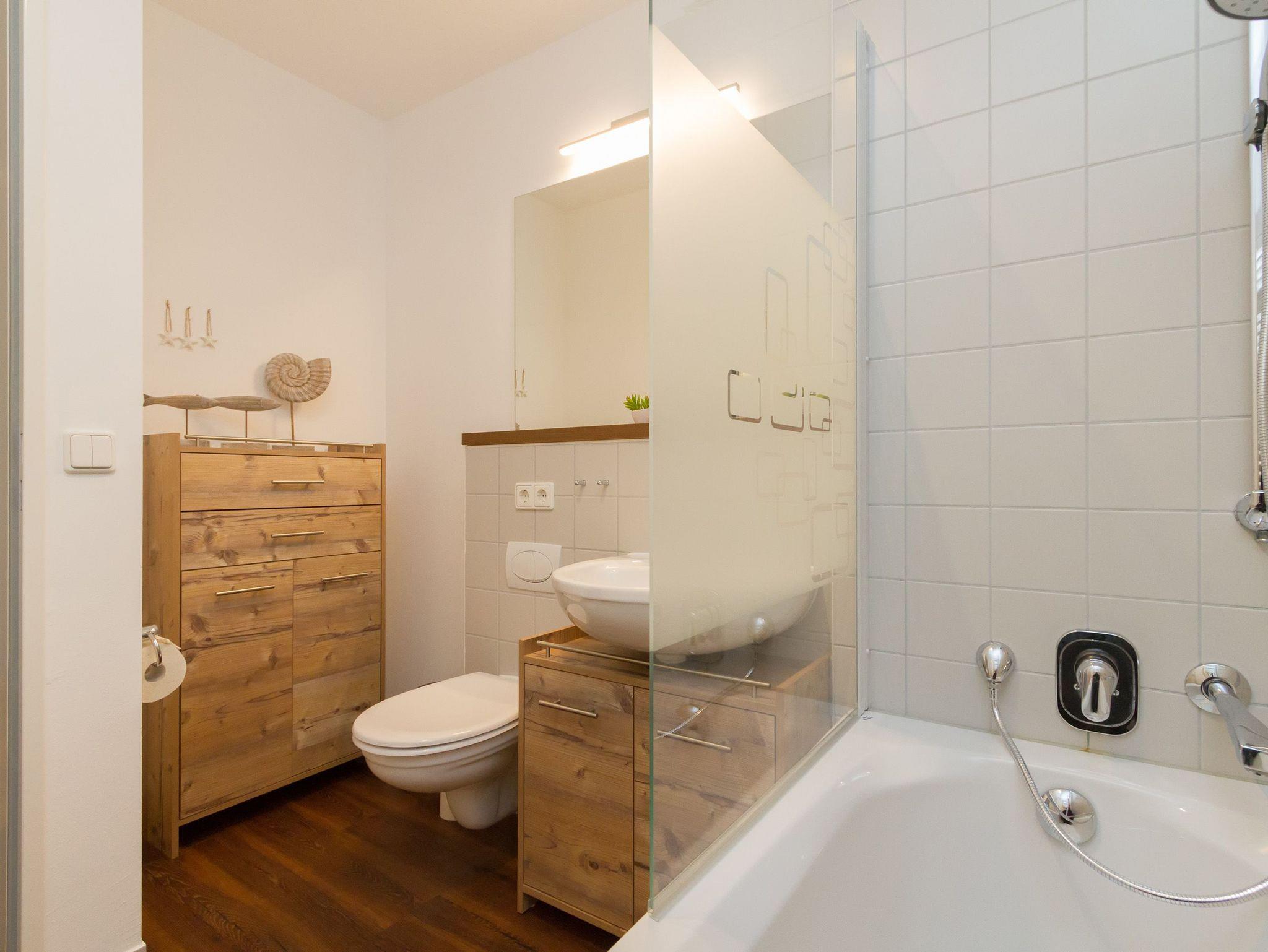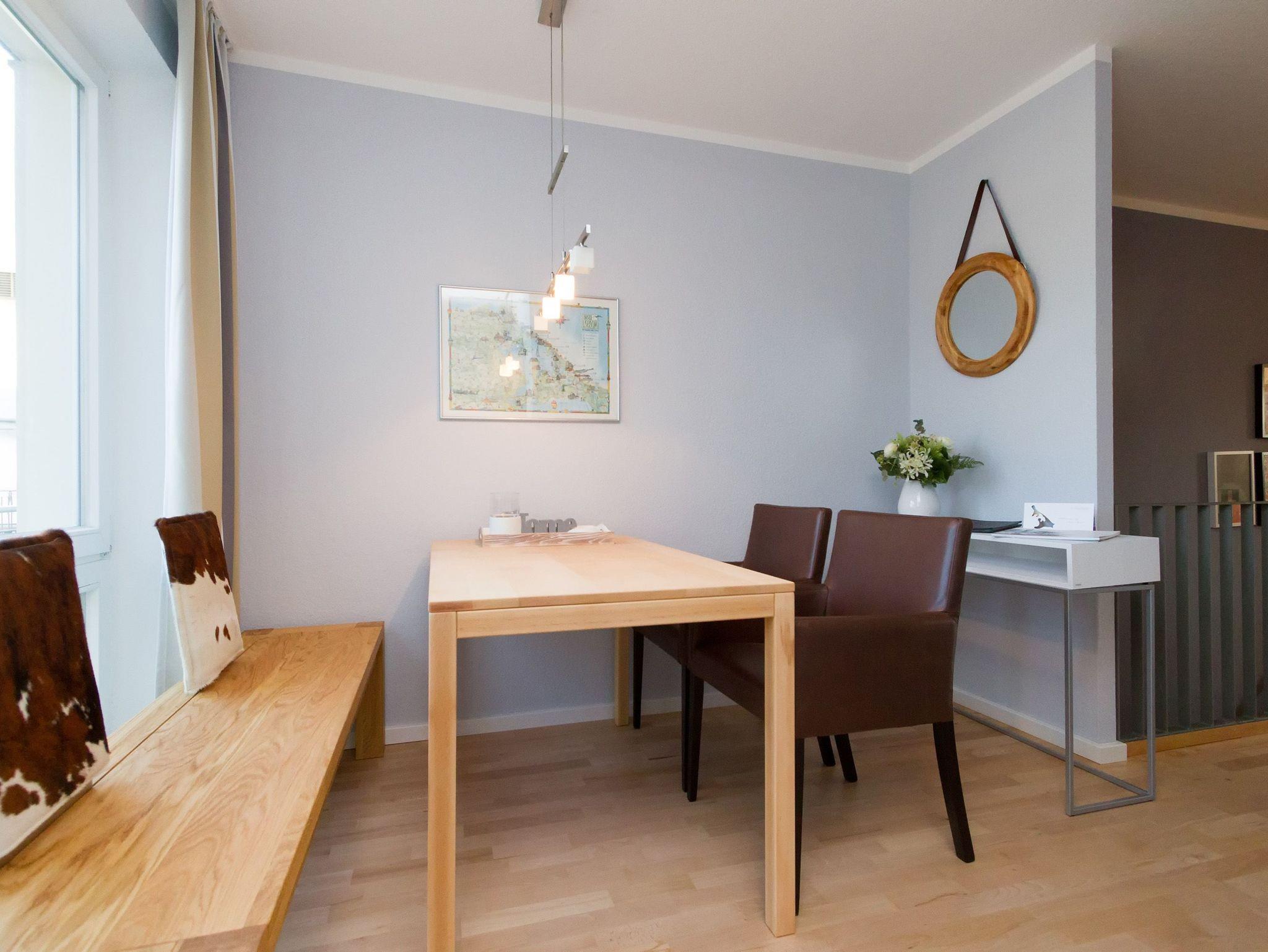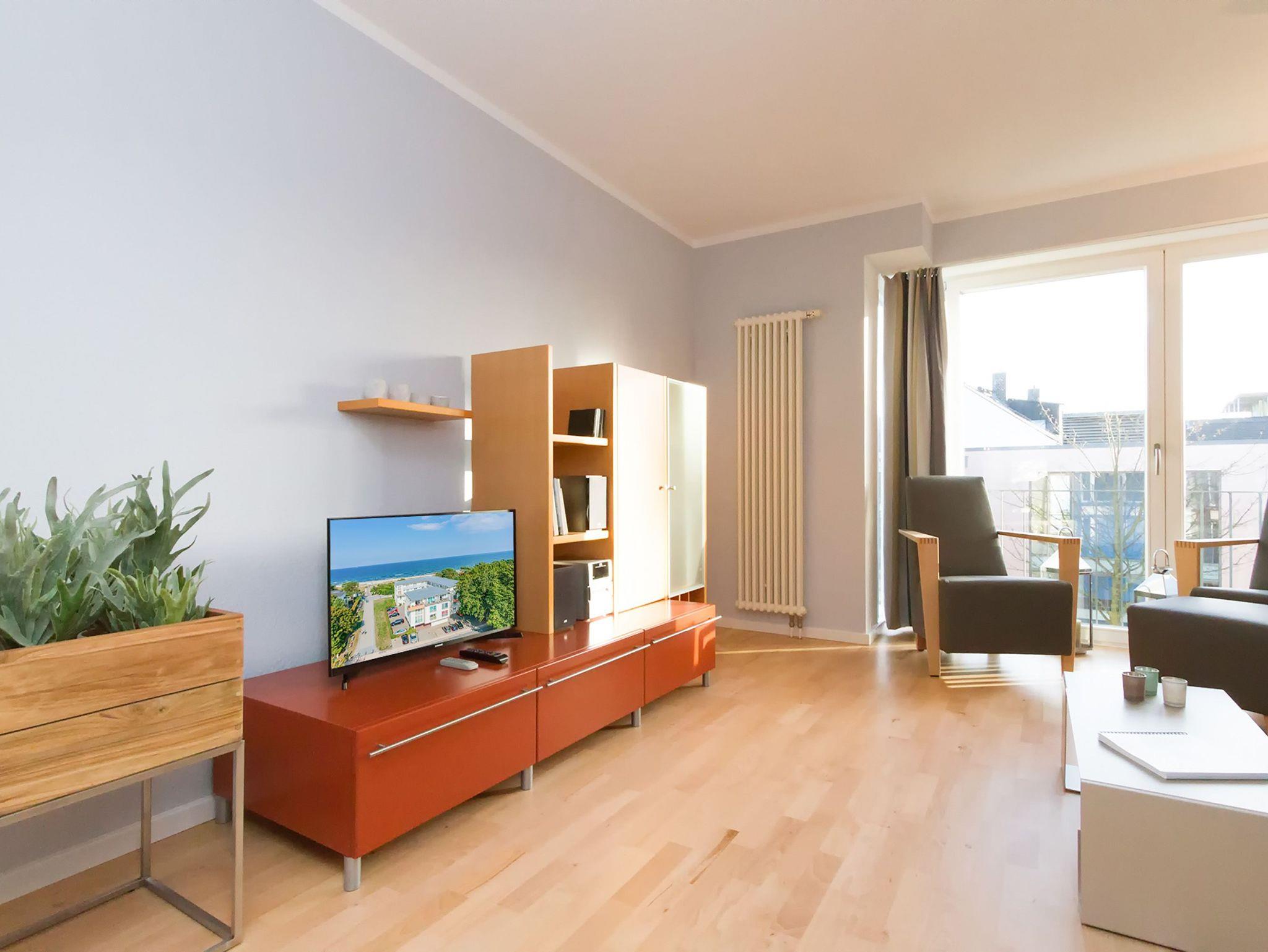 Modern, gemütlich und lichtdurchflutet hell präsentiert sich das Appartement Nummer 15 im Forum Marinar. Über zwei Etagen lädt die stilvolle Maisonette-Wohnung mit ihren 58 Quadratmetern zum ausgiebigen Entspannen und Urlauben ein. Zumal der feine, weiße Ostseestrand in unmittelbarer Nähe und sogar seitlicher Sichtweite liegt und an stürmischen Tagen für die richtige Wellenrauschkulisse sorgt. Ein schöner, großer Wohnbereich mit einem Kuschelsofa, das zur Schlafcouch umfunktioniert werden kann, zwei komfortablen Sesseln und einem Flat-TV empfängt Sie in der 2. Etage. Platz ist in den zwei Zimmern für zwei bis vier Personen. Eine offene Küchenzeile ist mit allem ausgestattet, was zum Kochen und Essen gebraucht wird. Ein schöner Esstisch nebst Stühlen und Bank sorgt beim Zusammensitzen für Gemütlichkeit. Auf der Wohnetage befindet sich zudem ein Gäste-WC. In der ersten Etage liegt das Schlafzimmer mit einem bequemen Boxspringdoppelbett (1,60 m x 2,00 m), einem großen Schrank und Flat-TV und ein schönes und geräumiges Badezimmer mit Waschtisch, WC und Badewanne. Entspannung pur, denn Sie brauchen sich um nichts kümmern. Handtücher liegen bereit und das Bett ist bezogen. Zu der Wohnung gehört ein Pkw-Stellplatz. In den Monaten April bis Juni und September bis November haben Sie zudem freien und kostenlosen Zugang zum Wellnessbereiches des 750 Meter entfernten Kaiser Spa Hotel Zur Post.