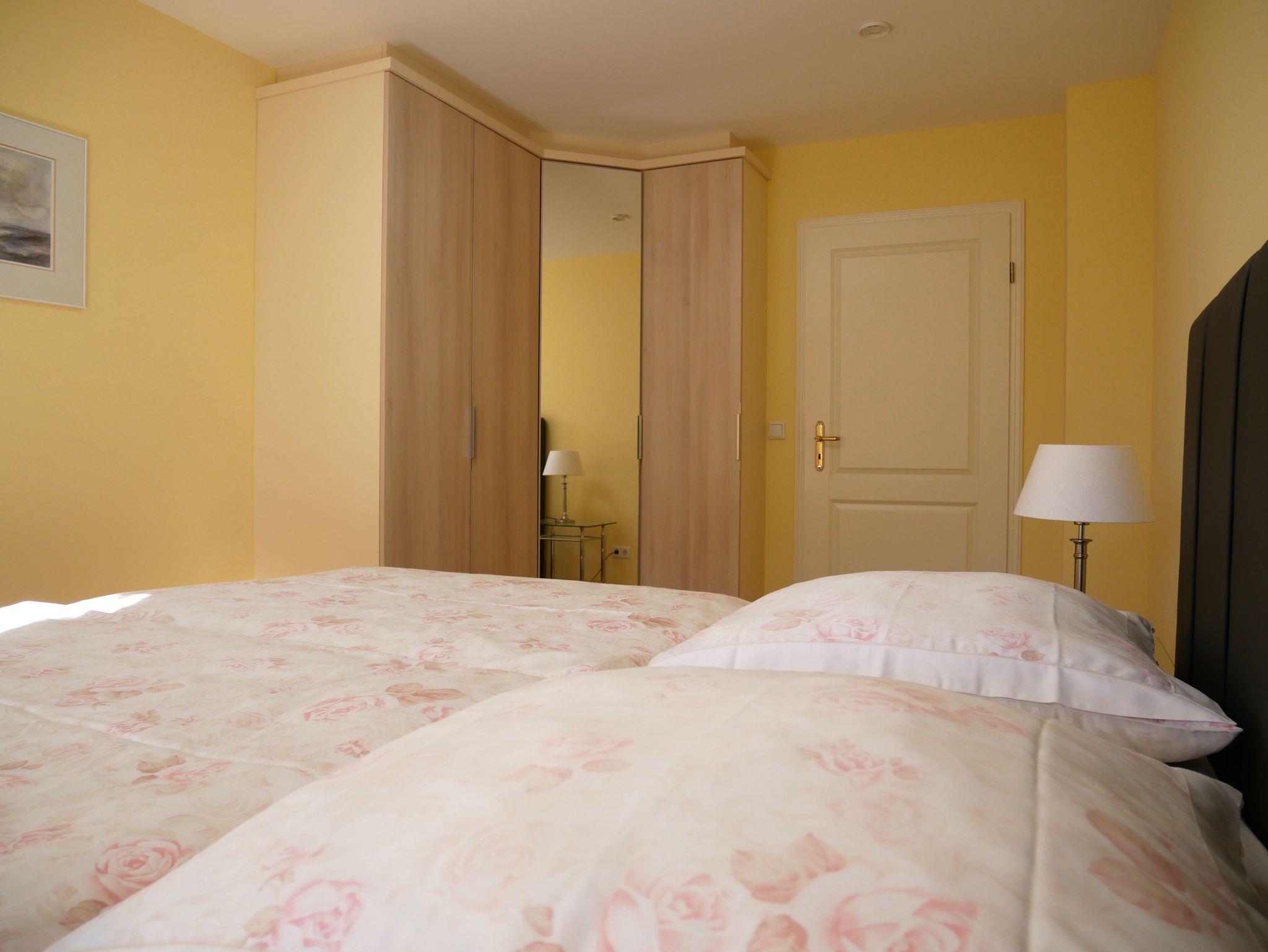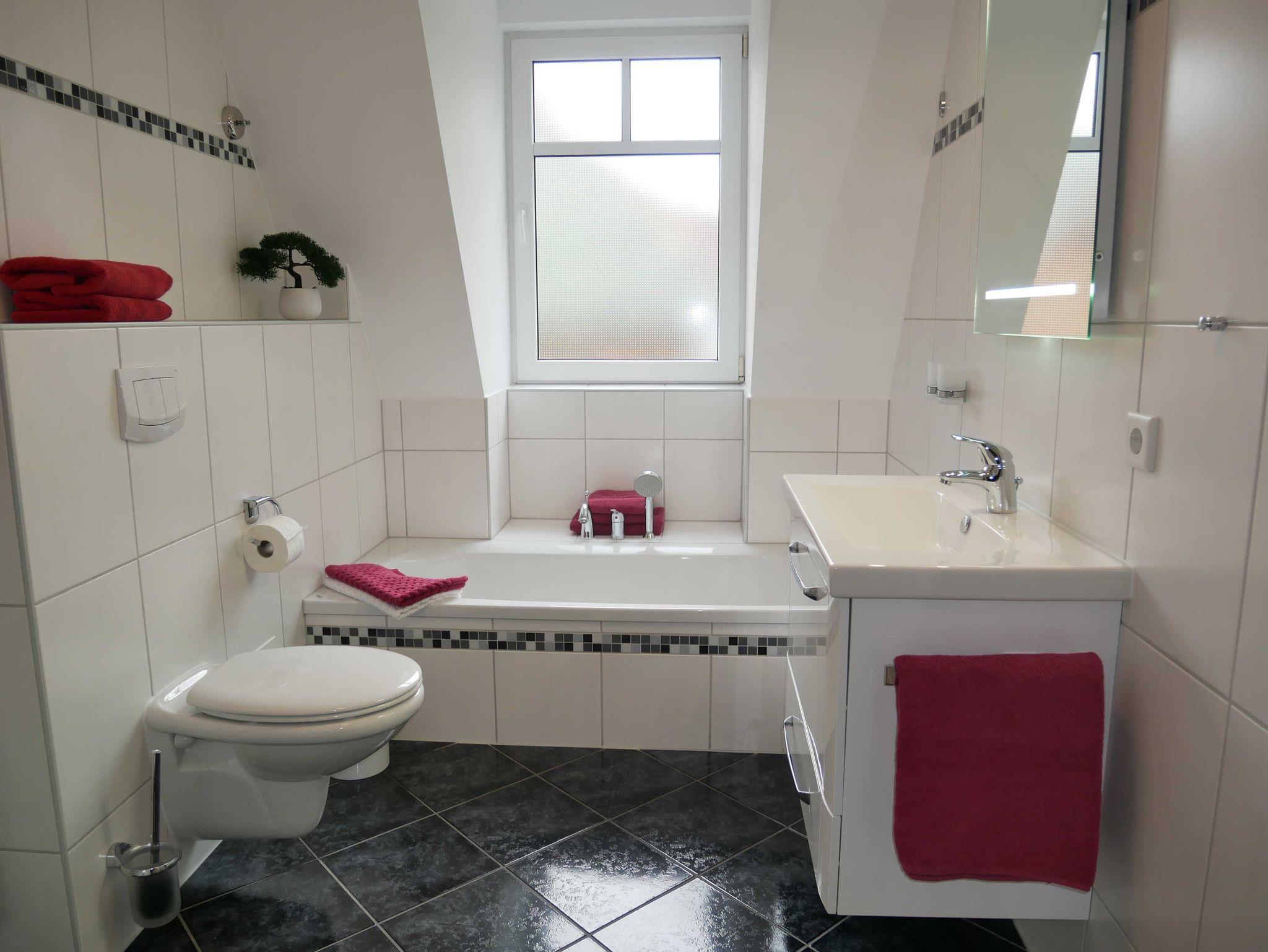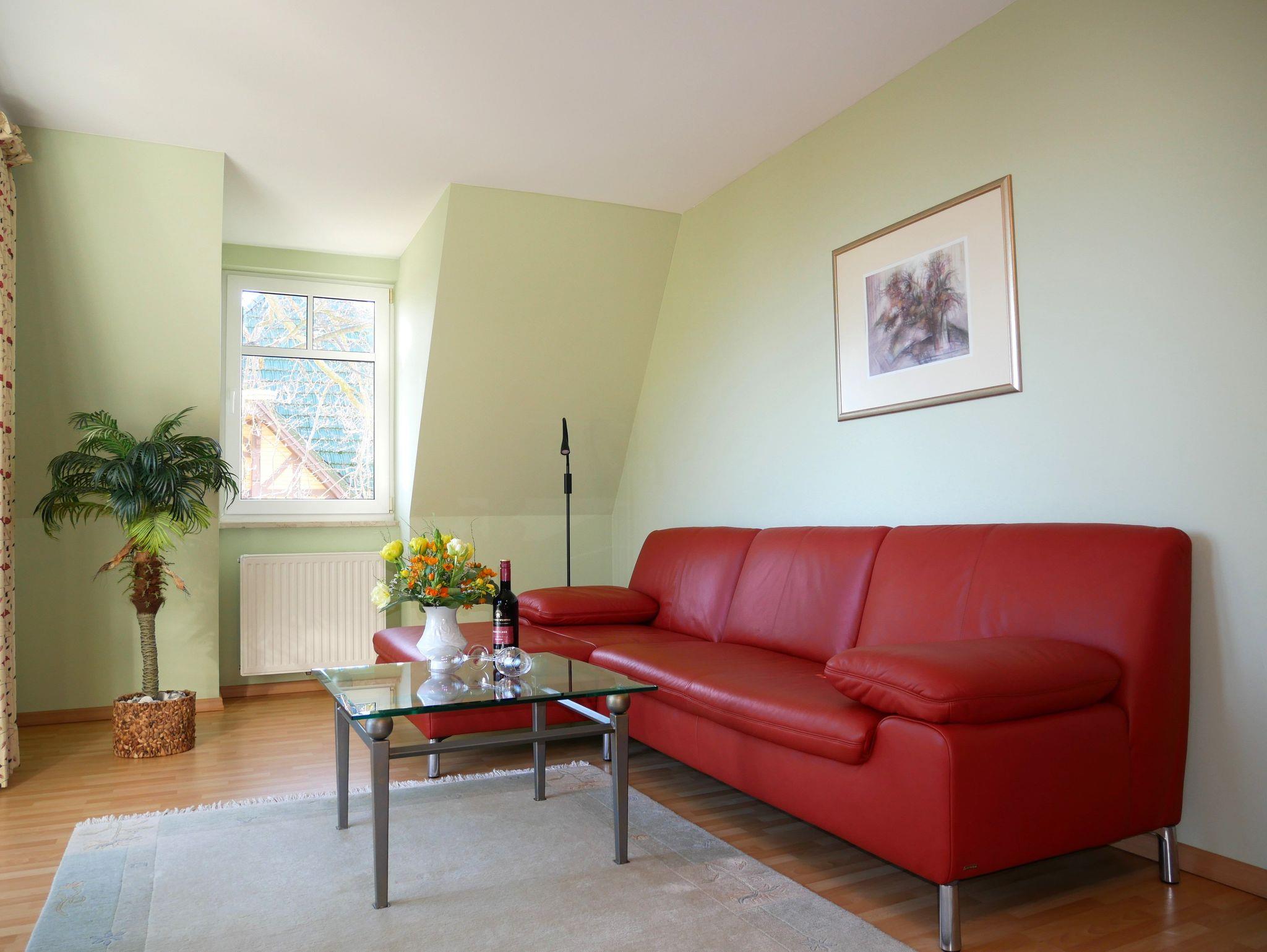 Die komfortable 3-Raum-Ferienwohnung befindet sich im Obergeschoss der Villa und verfügt über ein Wohnzimmer und zwei Schlafzimmer (das 2. Schlafzimmer ist über eine Treppe in der Wohnung zu erreichen und verfügt über einen 2. TV), eine voll ausgestattete separate Küche mit Essplatz und zwei Balkonen (Meer- und Südseite). Das Badezimmer ist mit Dusche/WC und einer Badewanne ausgestattet. Die Wohnung verfügt über Laminatboden, antike Möbel und moderner Funktionsausstattung wie FLAT-TV und W-LAN.