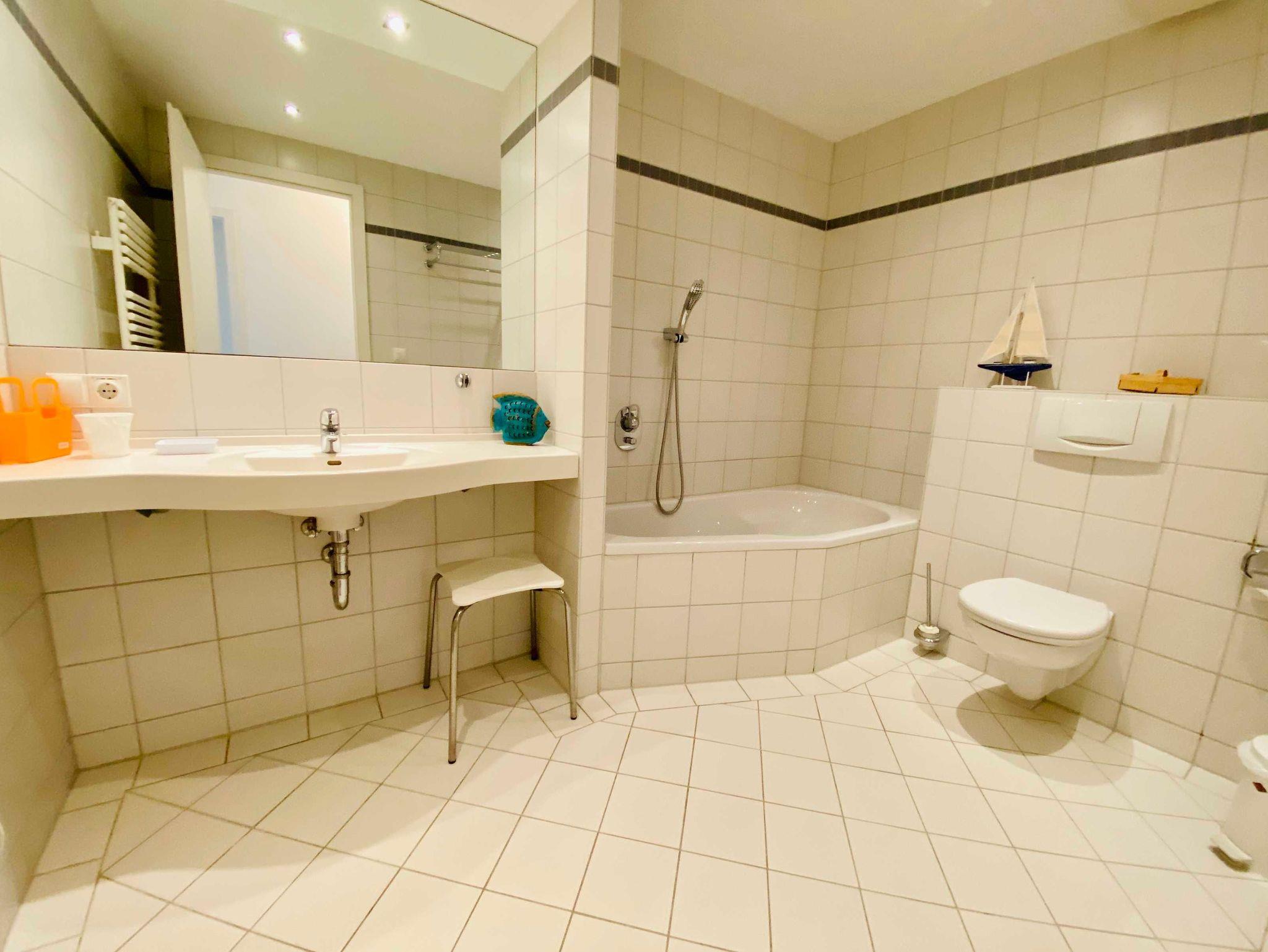 Die Wohnung hat 2 Schlafzimmer mit Doppelbett bzw. 2 Einzelbetten.Es gibt zwei Bäder mit Dusche und Wanne.