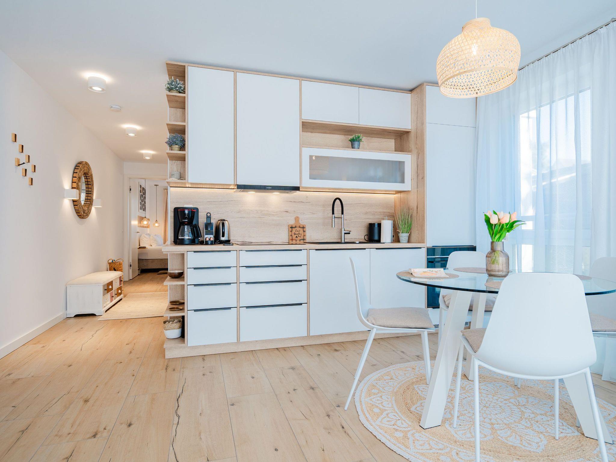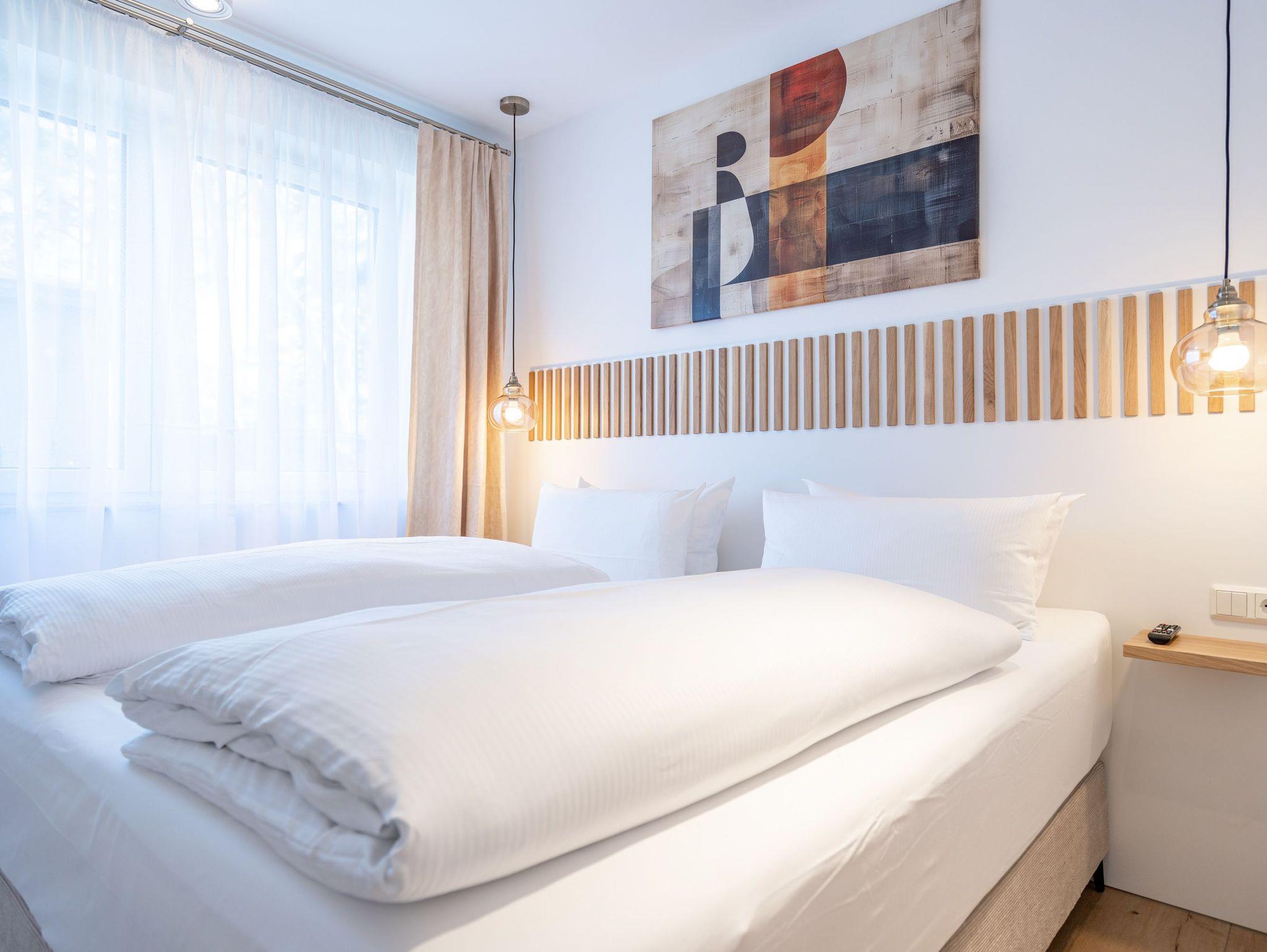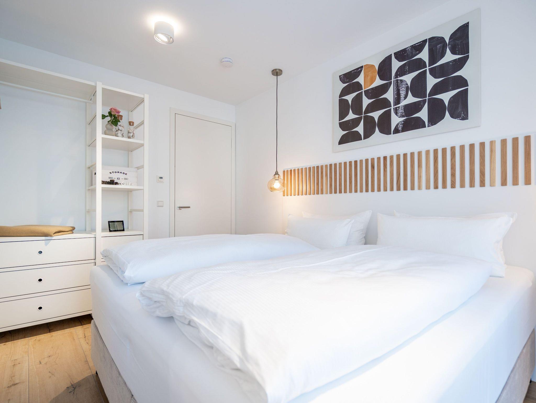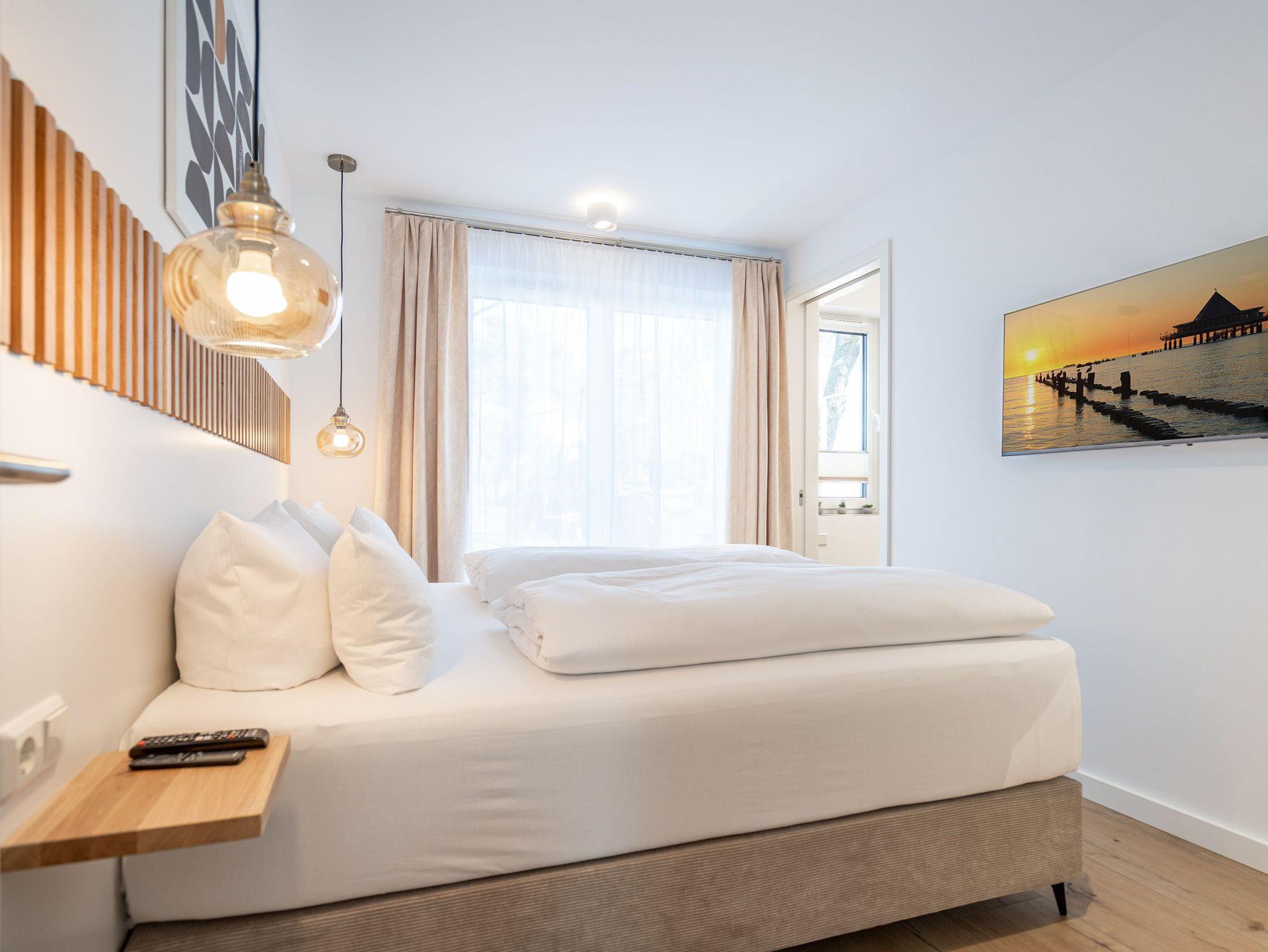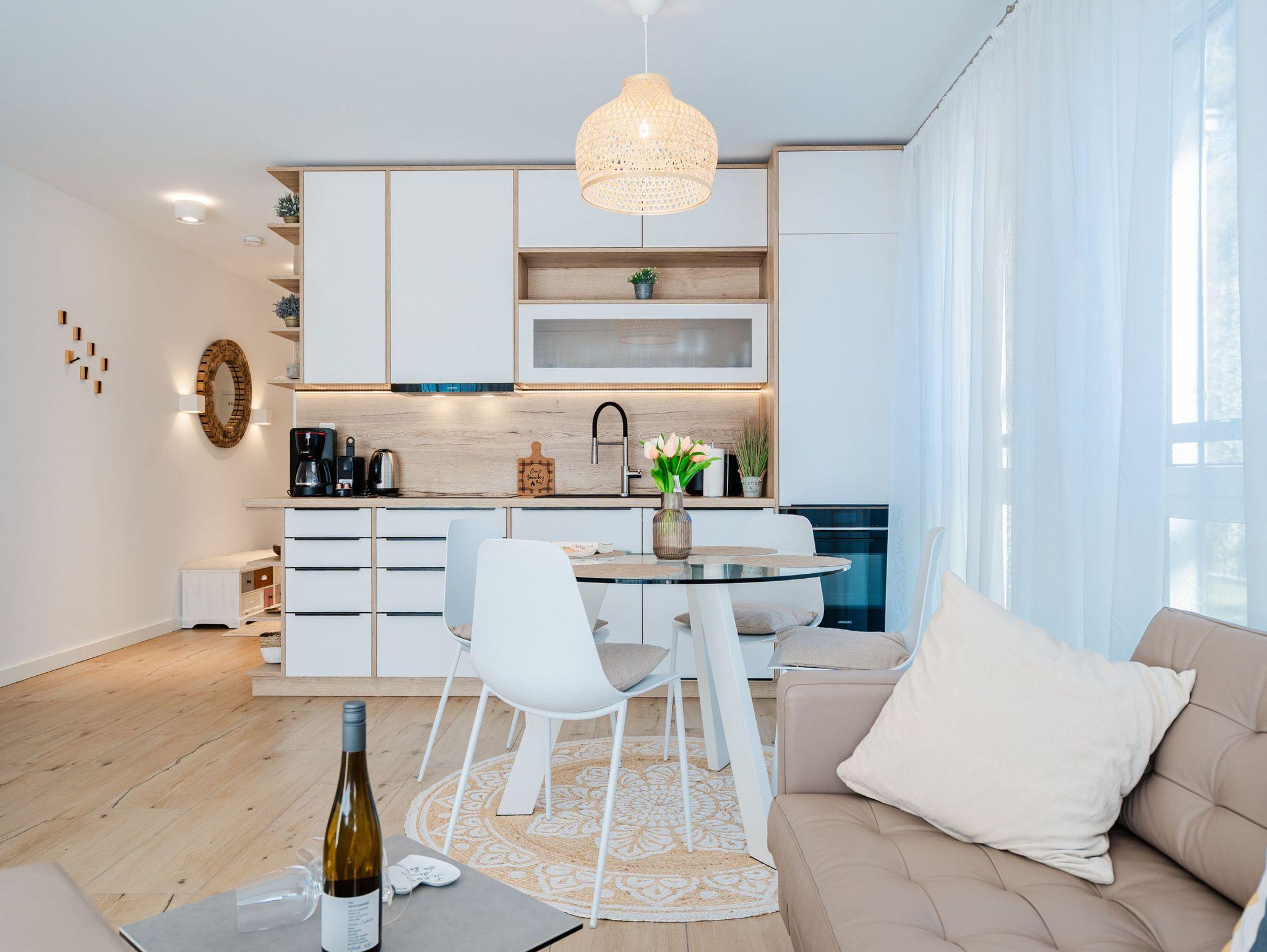 Willkommen in der stilvollen 3-Raum-Ferienwohnung Nr. 3 im exklusiven Quartier Maxim! Auf großzügigen 72 qm im Erdgeschoss bietet diese geschmackvoll eingerichtete Wohnung Platz für bis zu 4 Personen und vereint modernen Komfort mit Wohlfühl-Ambiente. Der offene Wohnbereich lädt mit einer bequemen Sitzgruppe, einem Kaminofen für gemütliche Abende sowie einem 65-Zoll-Flat-TV und Bluetooth-Radio zum Entspannen ein. Direkt angrenzend befindet sich die offene Wohnküche, die mit Backofen, Mikrowelle, Kühlschrank mit Gefrierfach und einer Nespresso-Kapselmaschine bestens ausgestattet ist. Der Essplatz für 4 Personen rundet den Wohnbereich harmonisch ab. Für höchsten Komfort sorgen zwei moderne Duschbäder: Ein innenliegendes Bad mit Finnischer Sauna lädt nach einem erlebnisreichen Tag zum Relaxen ein, während das Tageslichtbad als Masterbad mit direktem Zugang vom zweiten Schlafzimmer überzeugt. Die beiden stilvollen Schlafzimmer sind jeweils mit Boxspringdoppelbetten, einem Kleiderschrank und einem Flat-TV ausgestattet ? ideal für erholsame Nächte. Für sonnige Stunden stehen Ihnen zwei Terrassen mit Gartenmöbeln zur Verfügung: Eine Süd-West-Terrasse, auf der Sie die Nachmittagssonne genießen können, sowie eine Nord-Ost-Terrasse, die sich perfekt für ein Frühstück an der frischen Luft eignet. Für Ihre Fahrräder steht ein wohnungseigener Abstellraum sowie ein Fahrradständer am Haus bereit. Zwei Haustiere bis mittlerer Größe sind gegen Aufpreis herzlich willkommen. Erleben Sie erholsame Urlaubstage in dieser exklusiven Ferienwohnung ? wir freuen uns auf Sie!