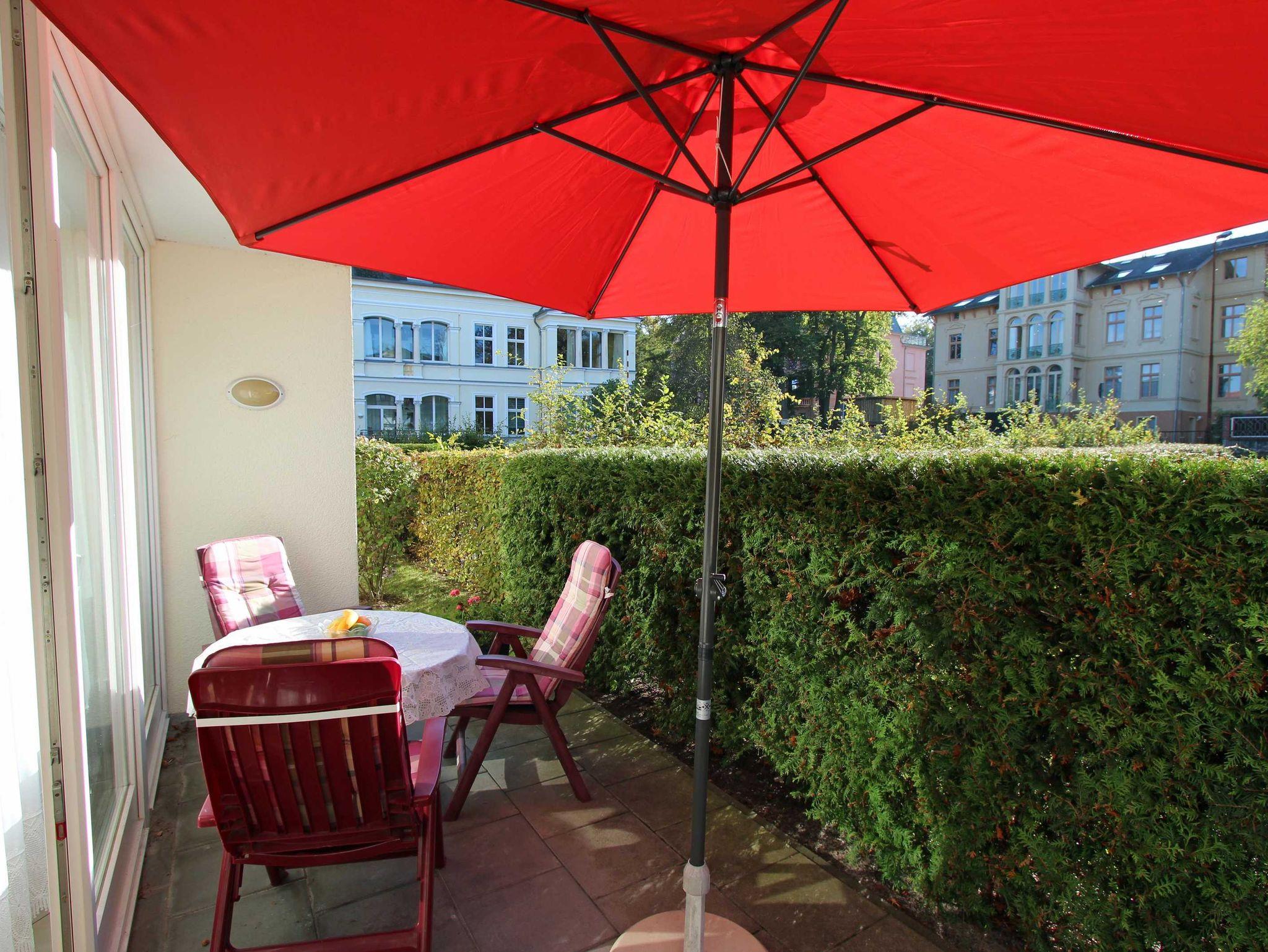 Mit dem Komfort eines Neubaus und der reizvollen Nähe zu mondänen Villen der Gründerzeit empfängt Sie die Villa Seestern im Neuen Weg im Seebad Heringsdorf. Die gemütliche 3-Zimmerwohnung im Erdgeschoss des Hauses ist 55 qm groß und bietet zwei bis sechs Personen Platz. Sie verfügt über ein Wohnzimmer mit einer Schlafcouch Liegefläche (1,40cm), eine komplett ausgestattete Küchenzeile mit Geschirrspüler, Herd mit Ceranfeld usw., ein Schlafzimmer mit Doppelbett, sowie ein zweites Schlafzimmer mit zwei Einzelbetten und eine sonnige Südterrasse. Bettwäsche und Geschirrtücher sind im Preis enthalten. Die Wohnung verfügt zudem über einen KFZ-Stellplatz auf dem Grundstück der Villa Seestern.