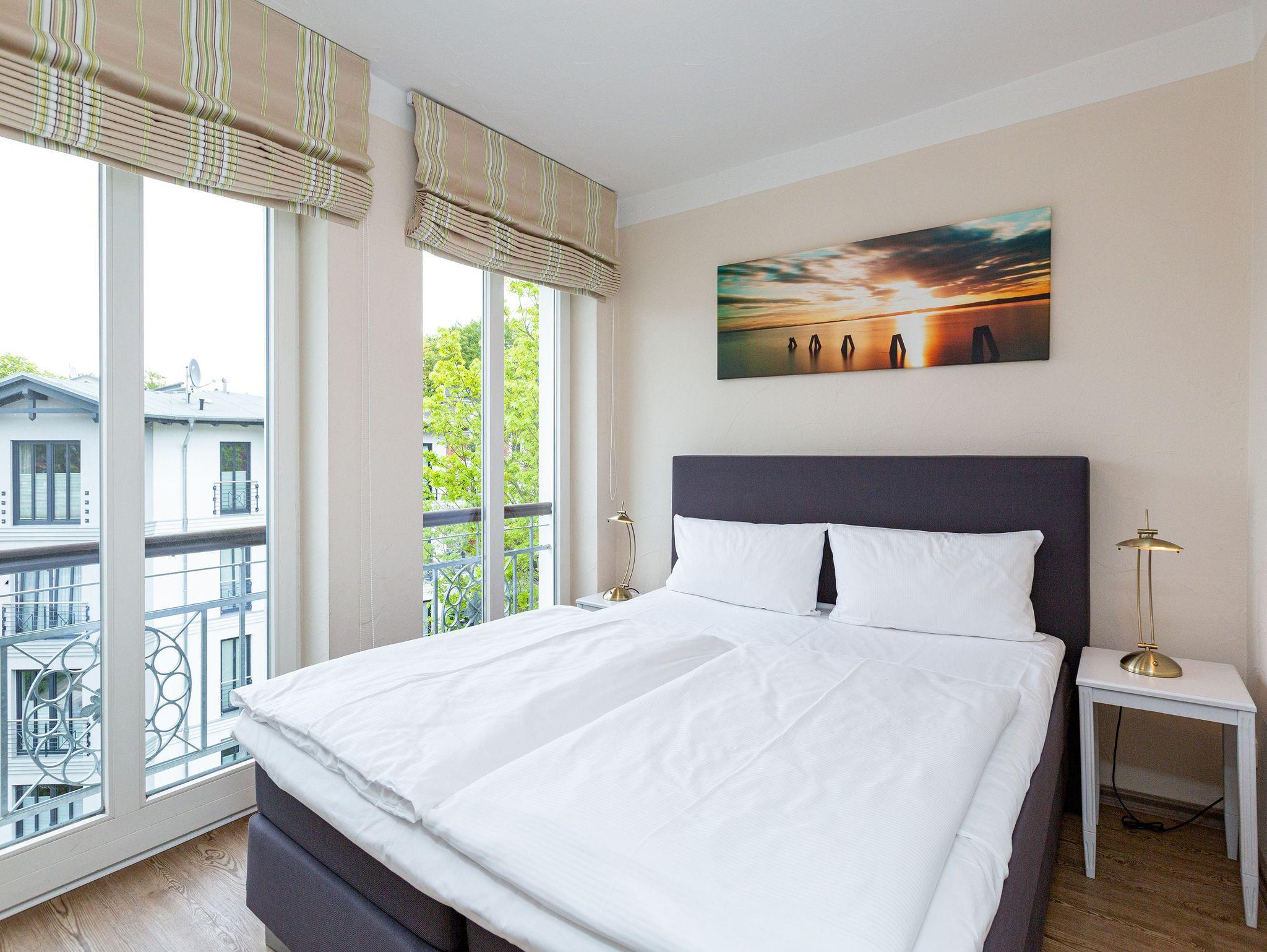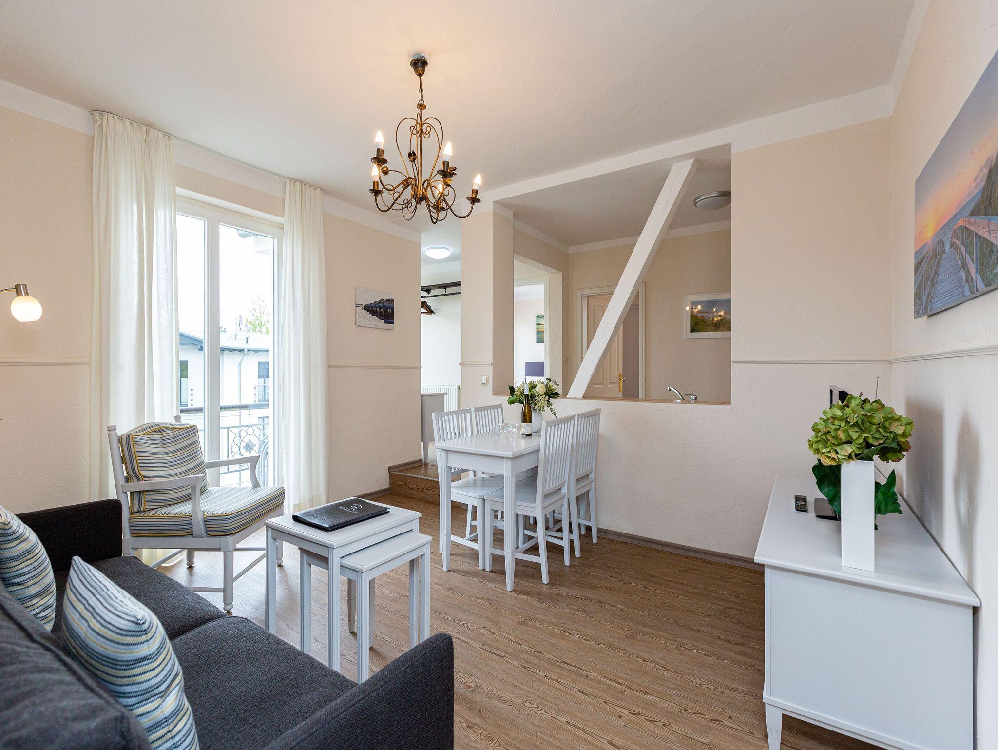 Nur einen Steinwurf von der Ostsee entfernt befindet sich dieses exklusive, 50 Quadratmeter große Urlaubsparadies, aus dem Sie garantiert nicht wieder abreisen wollen. Denn es eignet sich ideal, um abzuschalten und neue Energie zu tanken. Die drei Zimmer bieten Platz für bis zu 3 Erwachsene [&] 1 Kind bis 15 Jahre. Genießen Sie den Ausblick auf die schönen Villen um sie herum. Der kleine Balkon eignet sich dafür bestens. Die Räume sind hoch und hell und die geschmackvolle Einrichtung aus erlesenen Vintage-Möbeln verleiht dem Urlaubswohntraum einen mondänen Charme. An das geräumige Wohn-Esszimmer mit einem schönen Esstisch und Flat-TV ist die offene Küche angeschlossen. Hier finden Sie alles Nötige zum Kochen und Essen ? vom Toaster bis zur Kaffeetasse. In den beiden Schlafzimmern warten zwei Boxspringdoppelbetten darauf, Ihnen Erholung auch im Schlaf zu schenken. Große Schränke bieten viel Platz für die Urlaubsgarderobe. Das Tageslichtbad verfügt über eine Dusche, WC und einen Waschtisch. Sie benötigen Internet? Das WLAN Netz im Haus kann kostenfrei genutzt werden. Damit Sie sich um nichts kümmern müssen, haben wir die Betten bei Anreise bezogen und Handtücher liegen für Sie bereit. Das Auto können Sie auf dem Stellplatz am Haus parken.