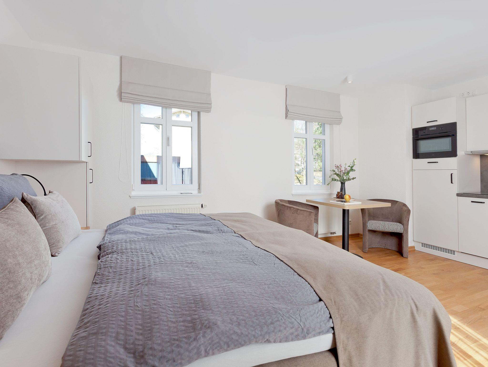Der kombinierte Wohn- und Schlafbereich lädt zum Entspannen ein. Genießen Sie gemütliche Abende auf den neuen Sesseln am Esstisch für zwei, bevor Sie im komfortablen Boxspringbett (180 x 200 cm) eine erholsame Nacht verbringen. Am Morgen begrüßt Sie die Sonne auf dem möblierten Balkon in Südostlage.