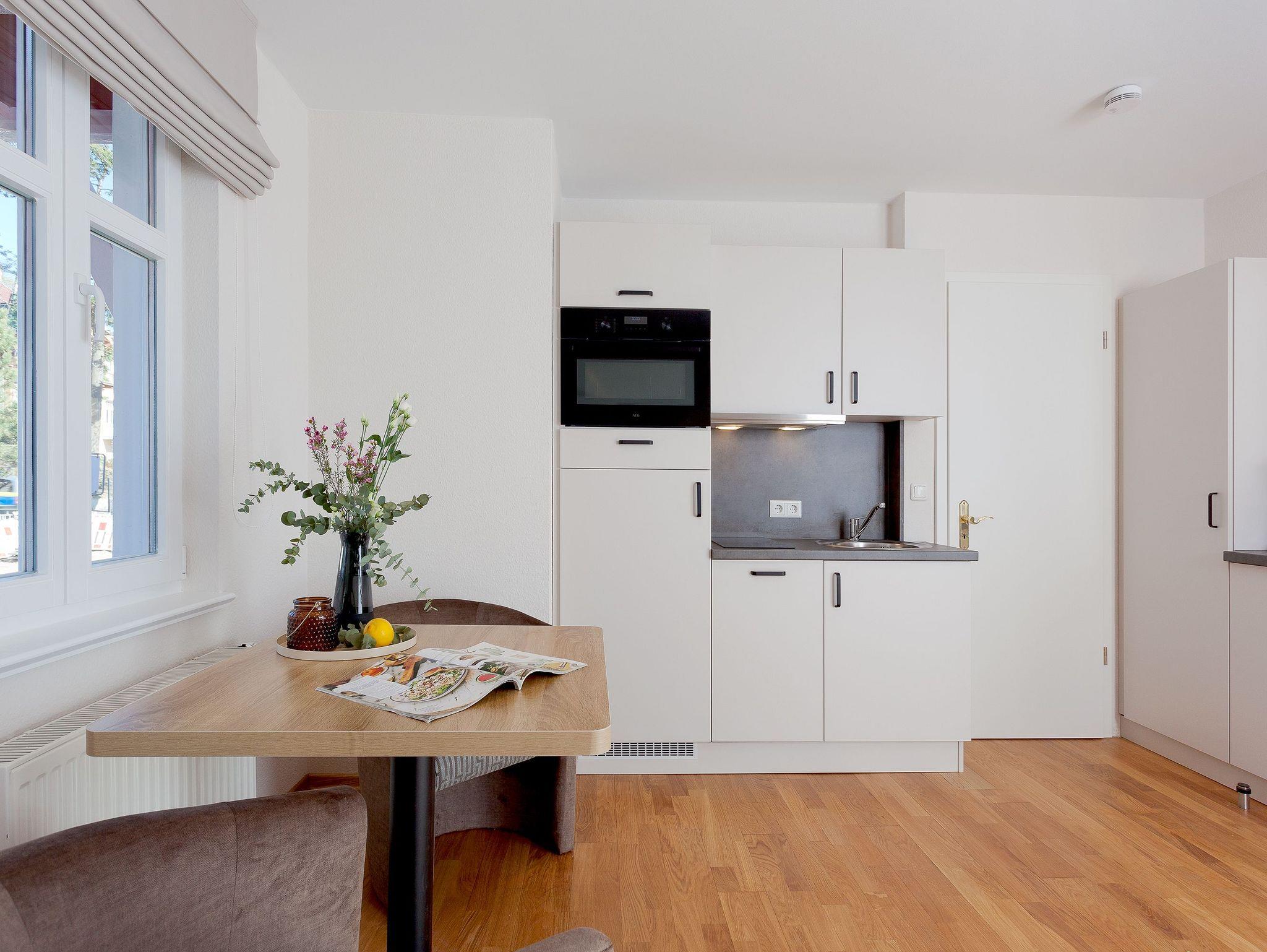 Unser Appartement 5 im 1. Obergeschoss wurde im Winter 2024 - 25 renoviert und erstrahlt nun in neuem Glanz. Mit ca. 30 qm bietet das Appartement alles, was es für einen erholsamen Aufenthalt mit bis zu 2 Personen benötigt. Die neue, moderne Single-Küchenzeile ist vollausgestattet mit einem 2 Platten-Cerankochfeld, Kühlschrank mit Gefrierfach, Backofen mit integrierter Mikrowelle, Spülmaschine sowie Kaffeemaschine, Wasserkocher und Toaster.