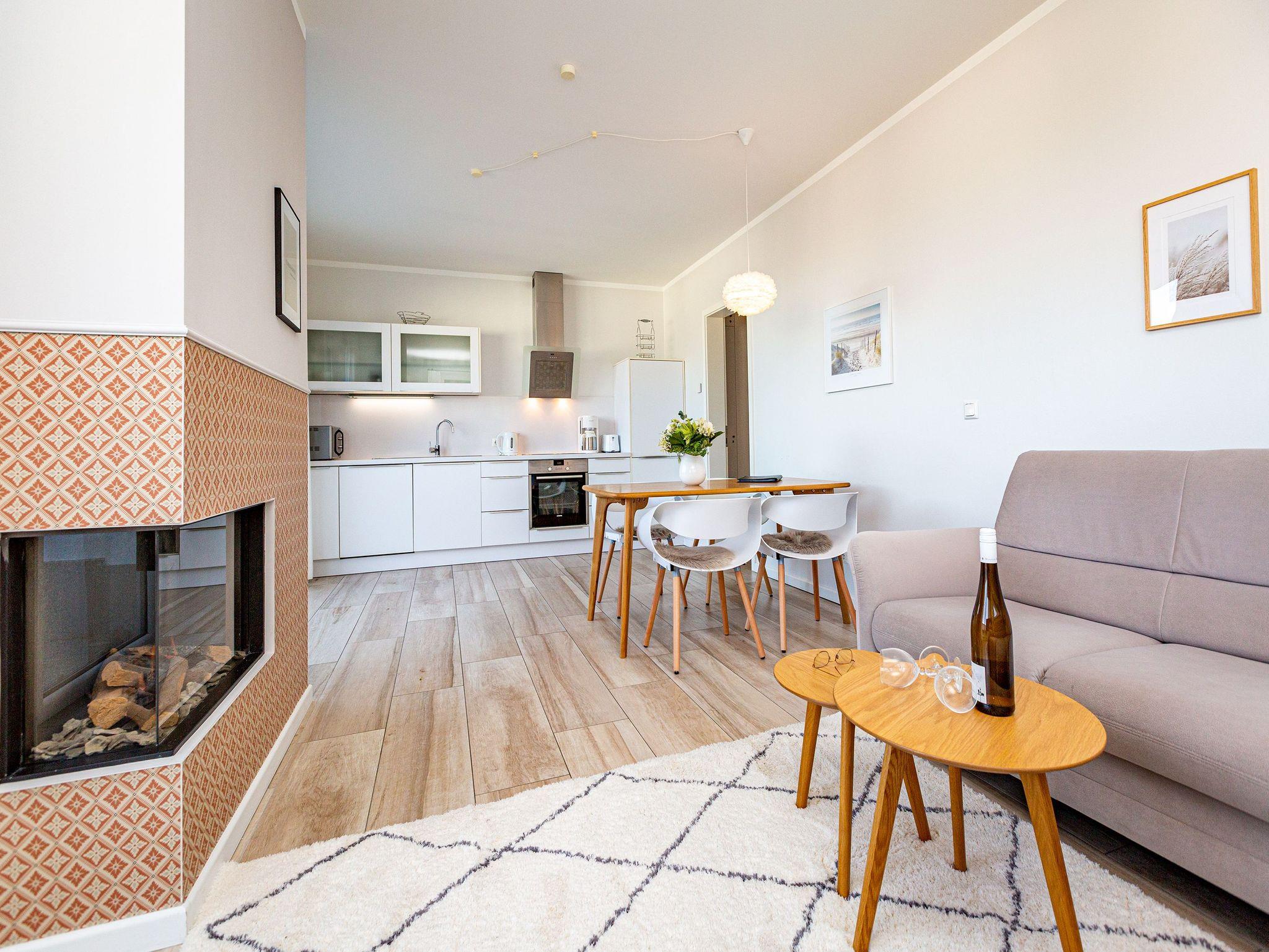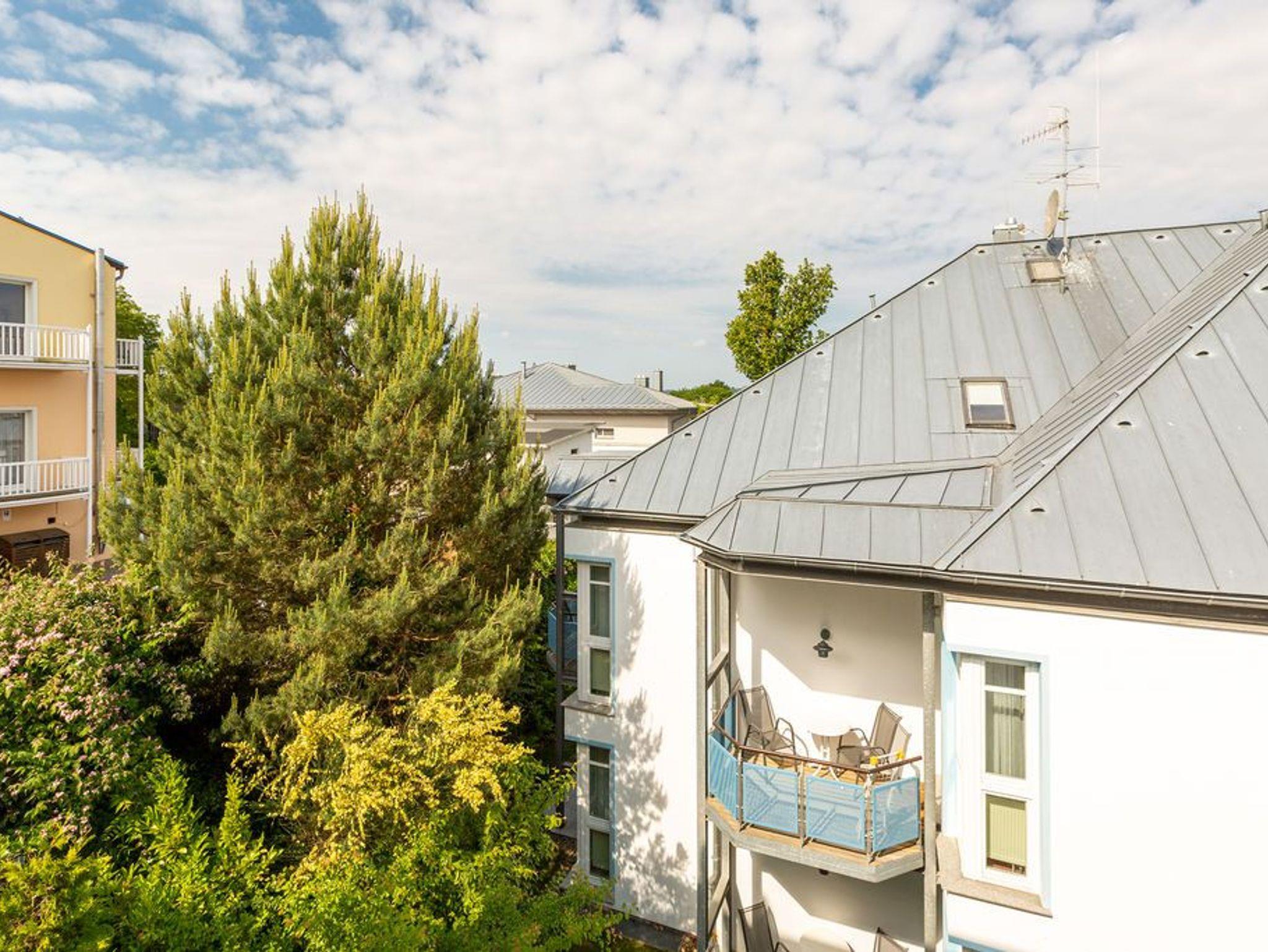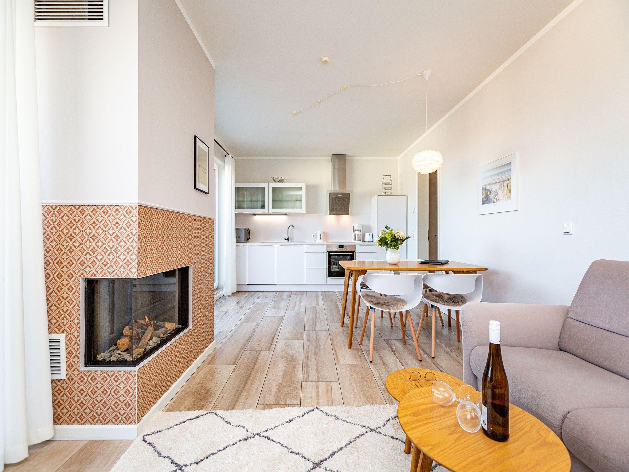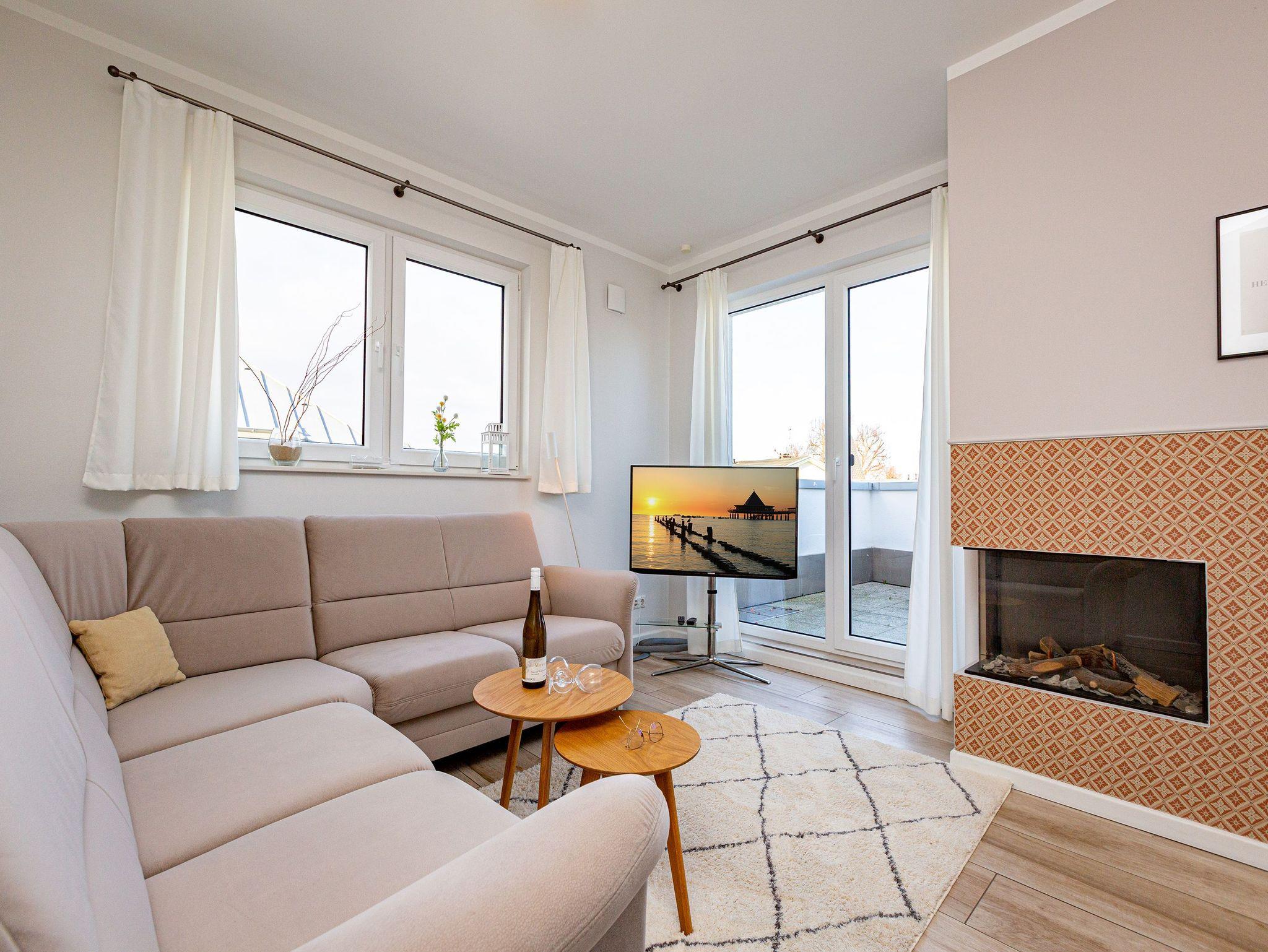 Der Blick wandert über die Dächer der alten Bädervillen bis über das Tiefblau der Ostsee. Mehr braucht ein Meerverliebter doch eigentlich gar nicht. Na gut. Ein schönes Dach über dem Kopf macht das Ganze unübertrefflich. Im Appartement 2 des Quartiers Arinja im 2. Obergeschoss werden Ostsee-Sehnsüchtige überglücklich. Auf den 84 Quadratmetern können bis zu vier Personen und ein Kleinkind (im Kinderreisebett) ihrer Inselliebe ausgiebig frönen. Wunderschön hell sind die Räume ? in dezenten Farben gehalten und modern eingerichtet. Das Wohnzimmer ist dazu noch unglaublich geräumig. Von hier aus haben Sie Zugang zum aussichtsreichen Balkon mit Gartenmöbeln. Hier scheint schon morgens die Sonne auf den Frühstückstisch. Auch drinnen finden Sie einen großen Esstisch mit ausreichend Stühlen vor. Das Wohnzimmer ist zudem mit einer bequemen Sofalandschaft ausgestattet. Ein Flat-TV sorgt für Heimkinofeeling. An kühlen Tagen spendet ein Gas-Kamin kuschelige Wärme. Zum Wohnzimmer gehört eine vollausgestattete Küchenzeile dazu. Ob Kühlschrank, Herd, Spülmaschine oder Mikrowelle ? es ist alles vorhanden. Auch edles Geschirr. Zwei Schlafzimmer warten mit komfortablen und höhenverstellbaren Boxspringdoppelbetten (1,80 m x 2,00 m) auf. In den Schränken finden Sie ausreichend Ablageflächen für die Urlaubsgarderobe vor. Das Appartement verfügt über zwei Bäder. Eines birgt neben der Dusche eine Finnische Sauna. Entspannen Sie hier wie in einem exklusiven Wellnesshotel. Eine Badewanne lädt im zweiten Bad zu entspannten Planschmomenten ein. Die Betten sind bei Ihrer Anreise bezogen. Handtücher liegen für Sie bereit. Das WLAN ist kostenfrei. In der Garage ist für Ihr Auto ein Stellplatz reserviert.