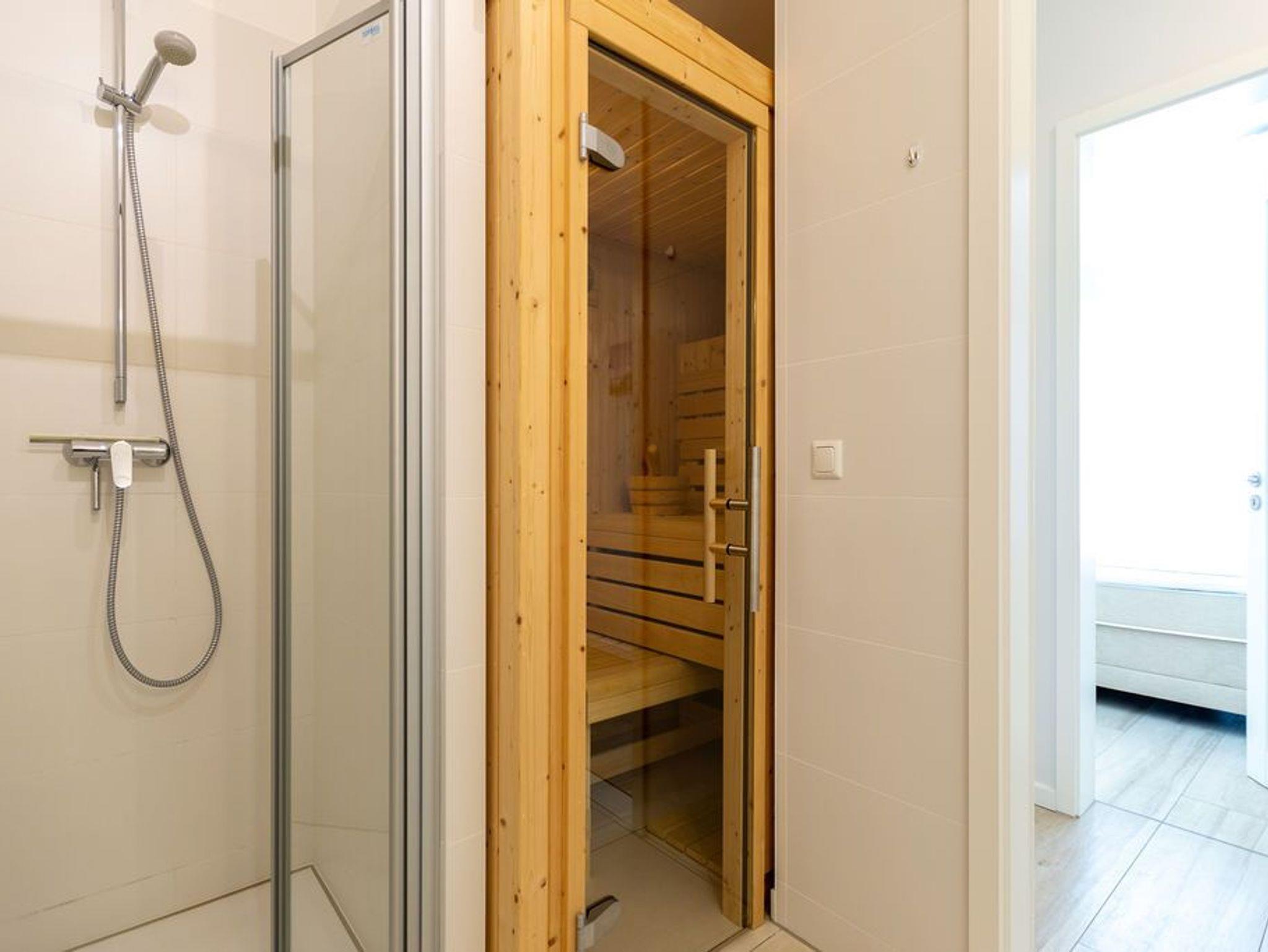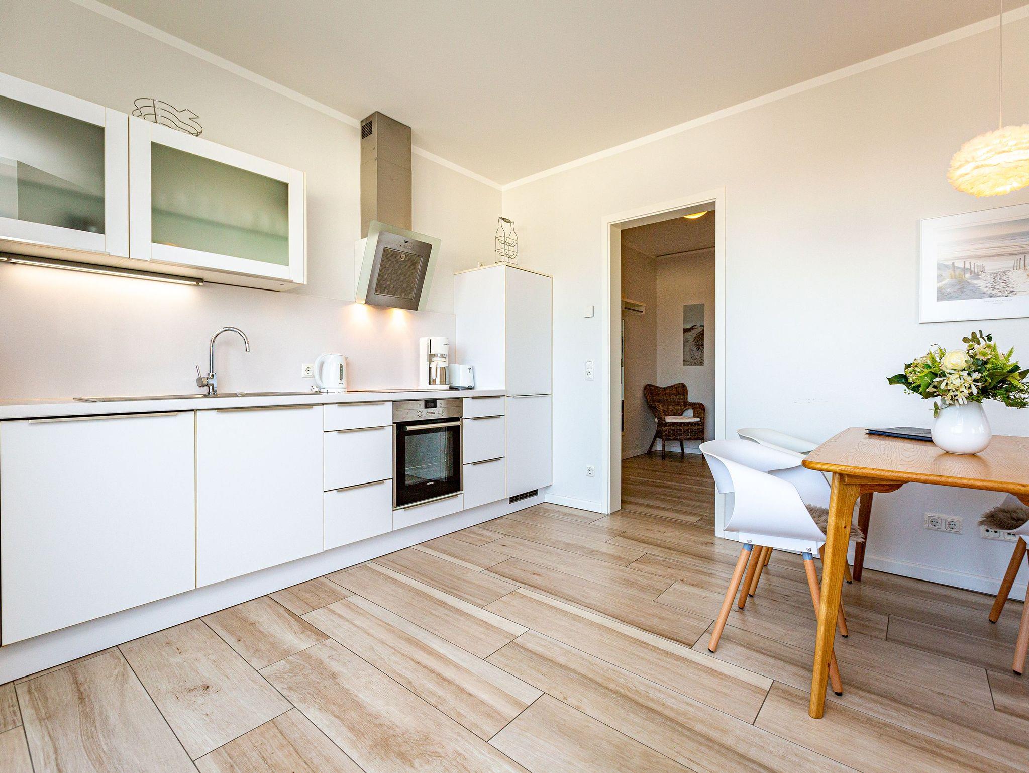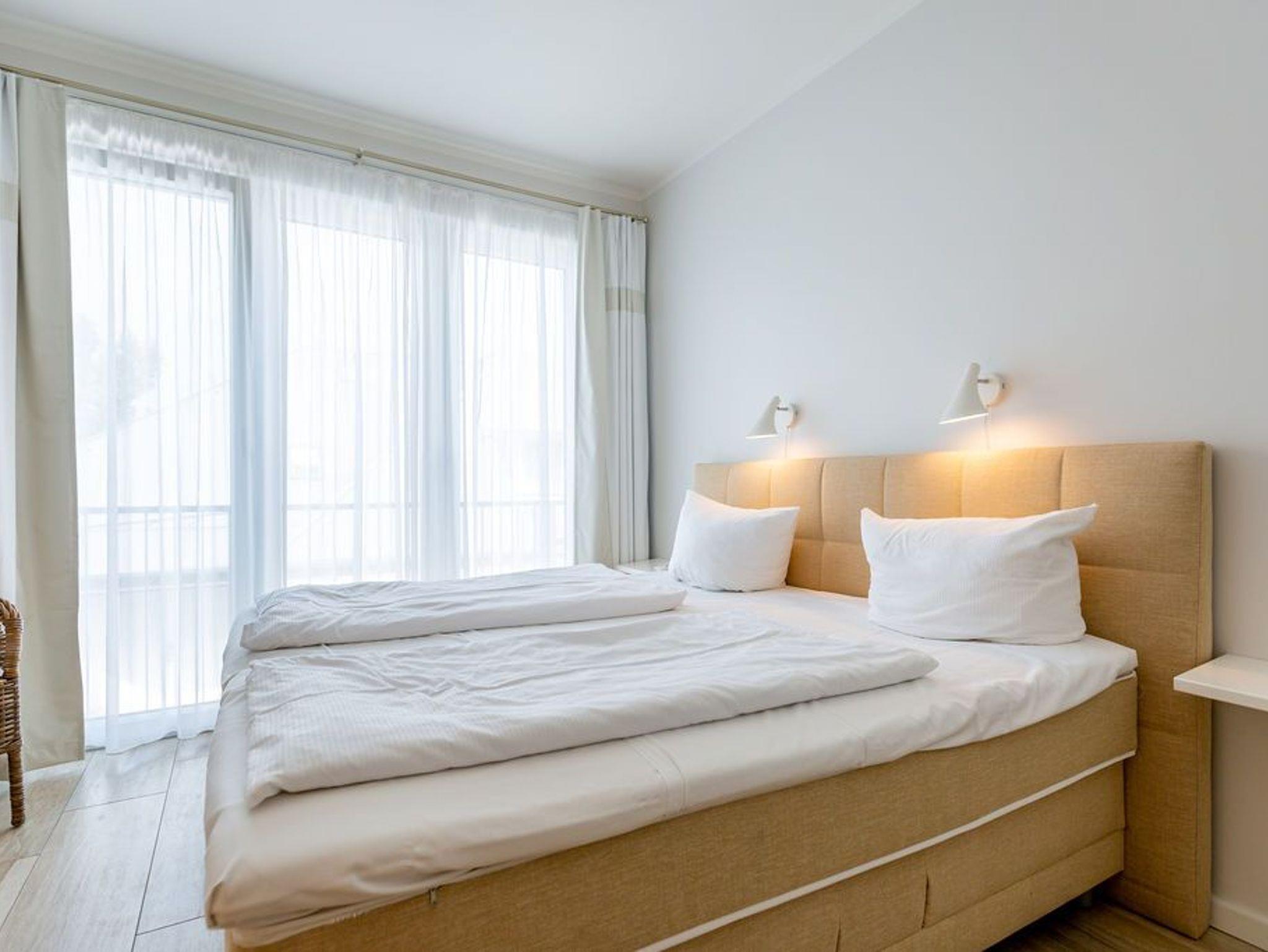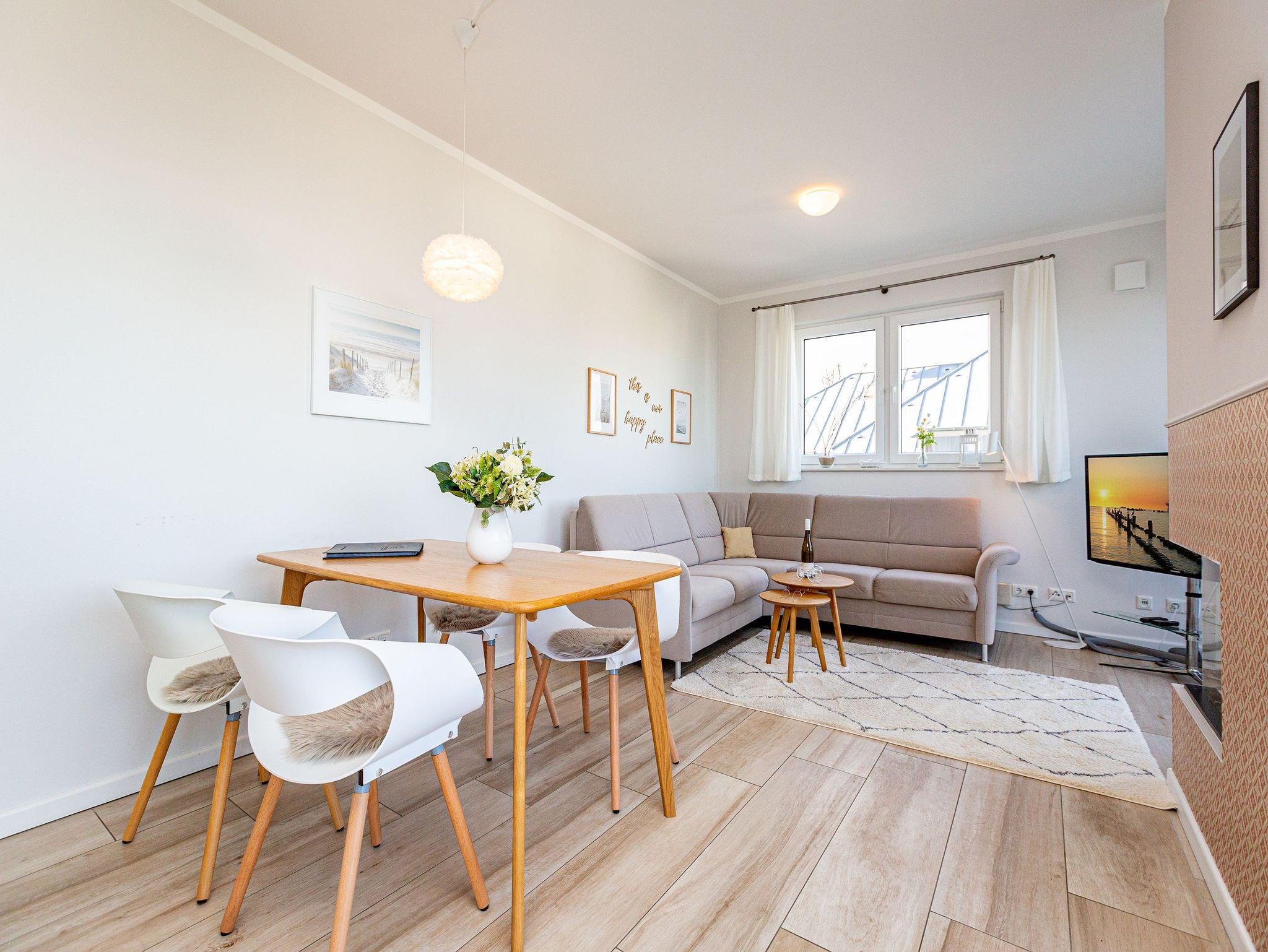 Der Blick wandert über die Dächer der alten Bädervillen bis über das Tiefblau der Ostsee. Mehr braucht ein Meerverliebter doch eigentlich gar nicht. Na gut. Ein schönes Dach über dem Kopf macht das Ganze unübertrefflich. Im Appartement 2 des Quartiers Arinja im 2. Obergeschoss werden Ostsee-Sehnsüchtige überglücklich. Auf den 84 Quadratmetern können bis zu vier Personen und ein Kleinkind (im Kinderreisebett) ihrer Inselliebe ausgiebig frönen. Wunderschön hell sind die Räume ? in dezenten Farben gehalten und modern eingerichtet. Das Wohnzimmer ist dazu noch unglaublich geräumig. Von hier aus haben Sie Zugang zum aussichtsreichen Balkon mit Gartenmöbeln. Hier scheint schon morgens die Sonne auf den Frühstückstisch. Auch drinnen finden Sie einen großen Esstisch mit ausreichend Stühlen vor. Das Wohnzimmer ist zudem mit einer bequemen Sofalandschaft ausgestattet. Ein Flat-TV sorgt für Heimkinofeeling. An kühlen Tagen spendet ein Gas-Kamin kuschelige Wärme. Zum Wohnzimmer gehört eine vollausgestattete Küchenzeile dazu. Ob Kühlschrank, Herd, Spülmaschine oder Mikrowelle ? es ist alles vorhanden. Auch edles Geschirr. Zwei Schlafzimmer warten mit komfortablen und höhenverstellbaren Boxspringdoppelbetten (1,80 m x 2,00 m) auf. In den Schränken finden Sie ausreichend Ablageflächen für die Urlaubsgarderobe vor. Das Appartement verfügt über zwei Bäder. Eines birgt neben der Dusche eine Finnische Sauna. Entspannen Sie hier wie in einem exklusiven Wellnesshotel. Eine Badewanne lädt im zweiten Bad zu entspannten Planschmomenten ein. Die Betten sind bei Ihrer Anreise bezogen. Handtücher liegen für Sie bereit. Das WLAN ist kostenfrei. In der Garage ist für Ihr Auto ein Stellplatz reserviert.