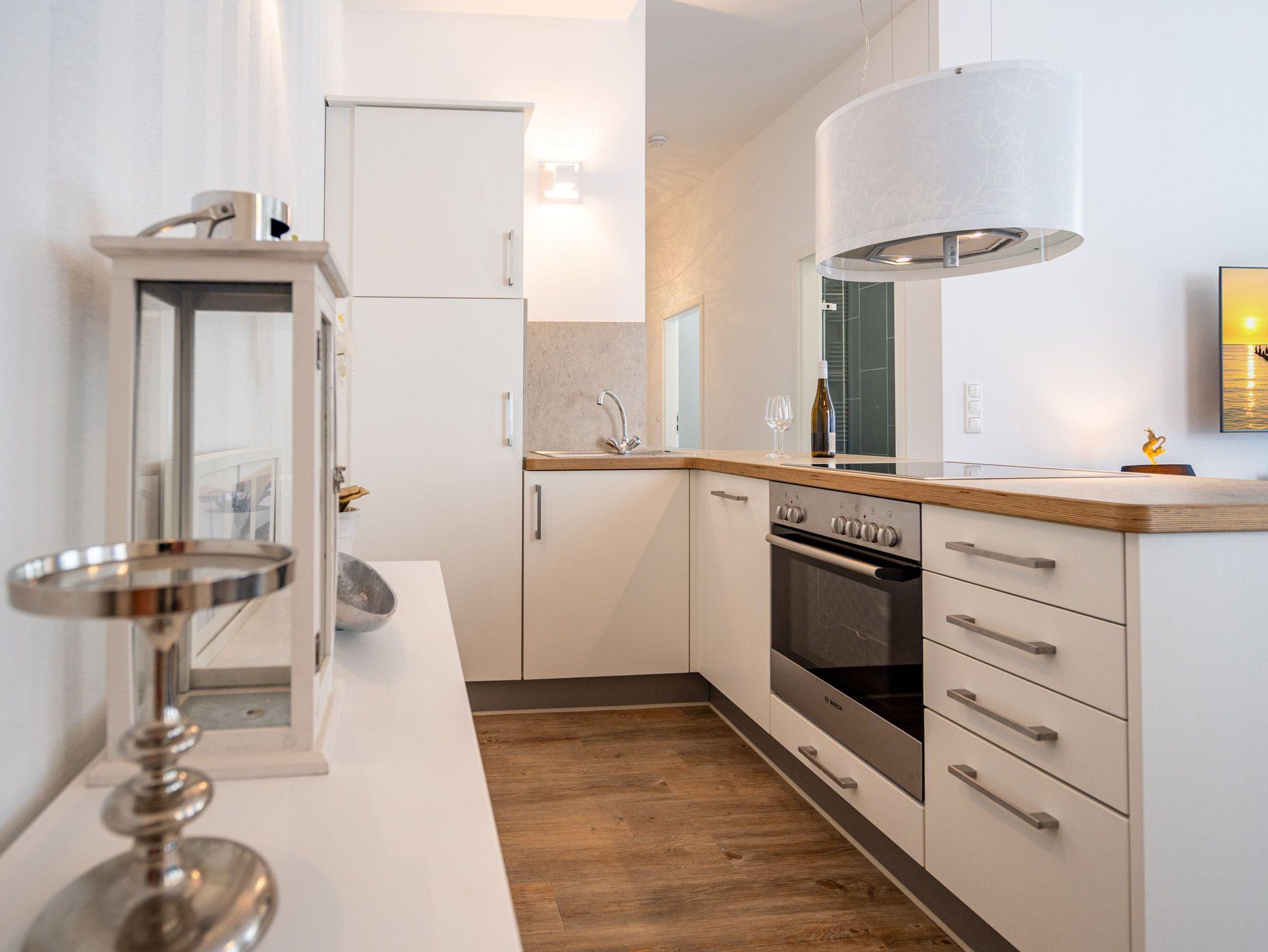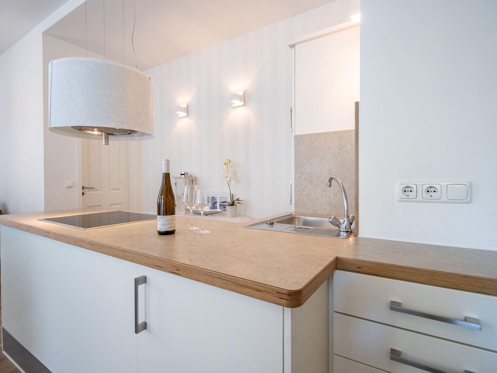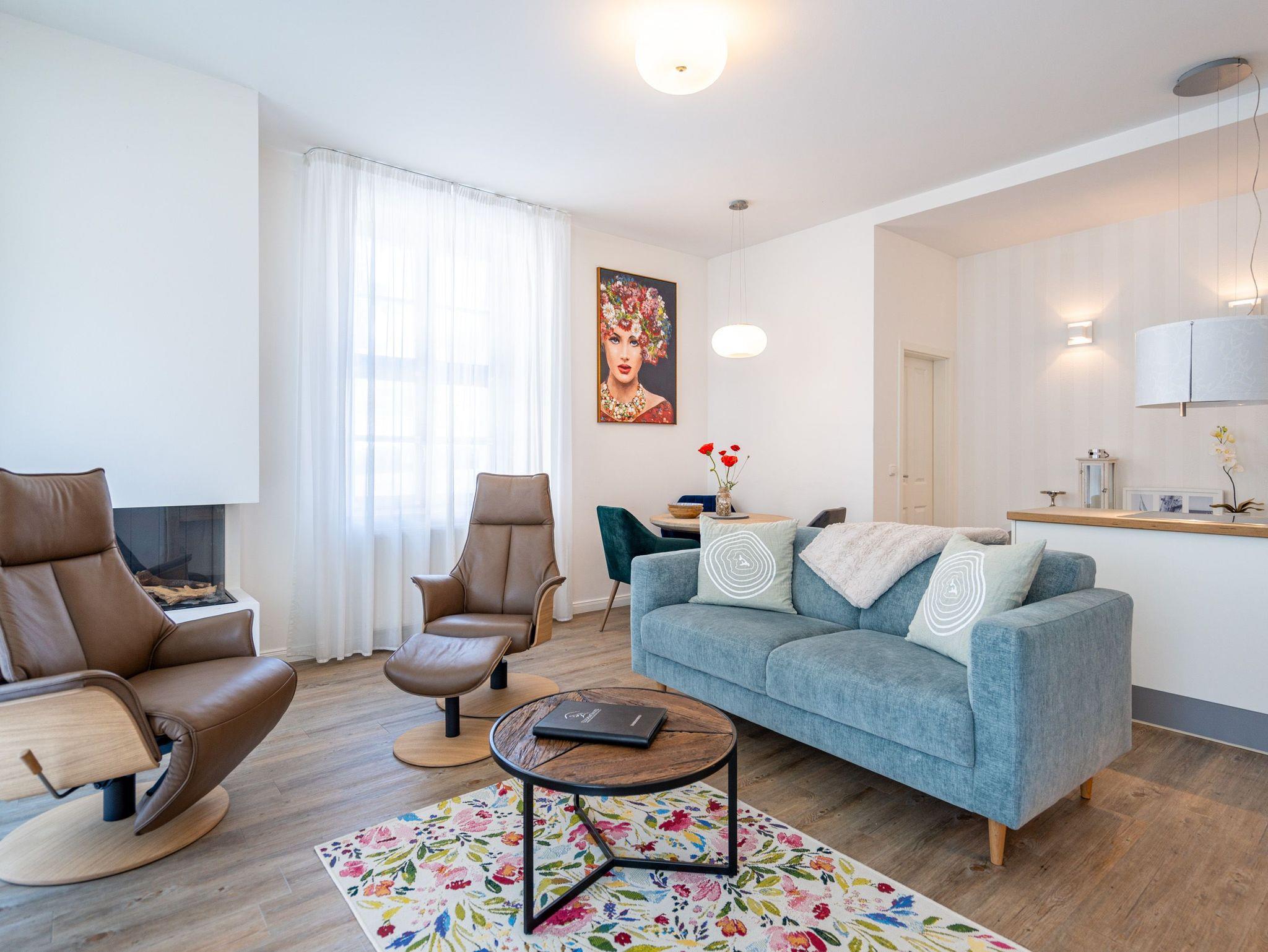 Möblierung mit Geschmack und Stil. Im Erdgeschoss des Hauses ( 57 qm) erwartet Sie diese modern gestaltete 2-Raum-Ferienwohnung für 2 Personen. In jeder Ecke Ihres Domizils lassen sich ausgesuchte Details entdecken, die Ihren Aufenthalt besonders gestalten. Genießen Sie gemütliche Stunden vor dem ( per Fernbedienung bedienbaren) Gas-Designkamin. An den Wohnbereich mit gemütlicher Couch und Flat-TV schließt sich die offene, komplett ausgestattete Küche und der Essbereich an. Von hier hat man Zugang zur Südterrasse. 1 Schlafzimmer mit Doppelbett und ein schönes Bad mit Dusche ergänzen die Räumlichkeiten. Ein Pkw-Stellplatz steht am Haus zur Verfügung. Für Ihren Komfort steht die Erstausstattung Wäsche ( Bettwäsche, 1 Duschtuch [&] 2 kleine Handtücher) für Sie bereit. Das WLAN-Netz im Haus kann kostenfrei genutzt werden.