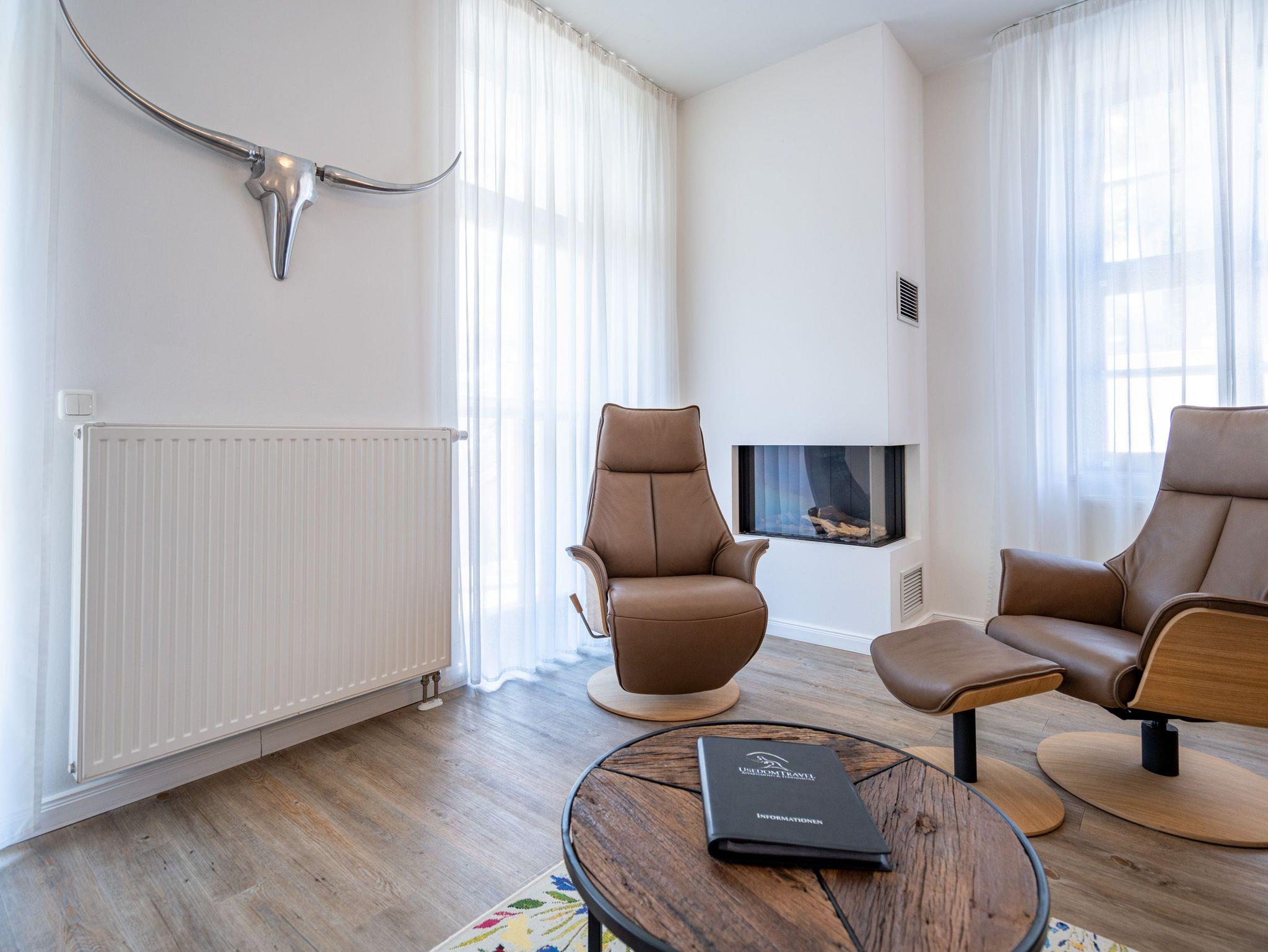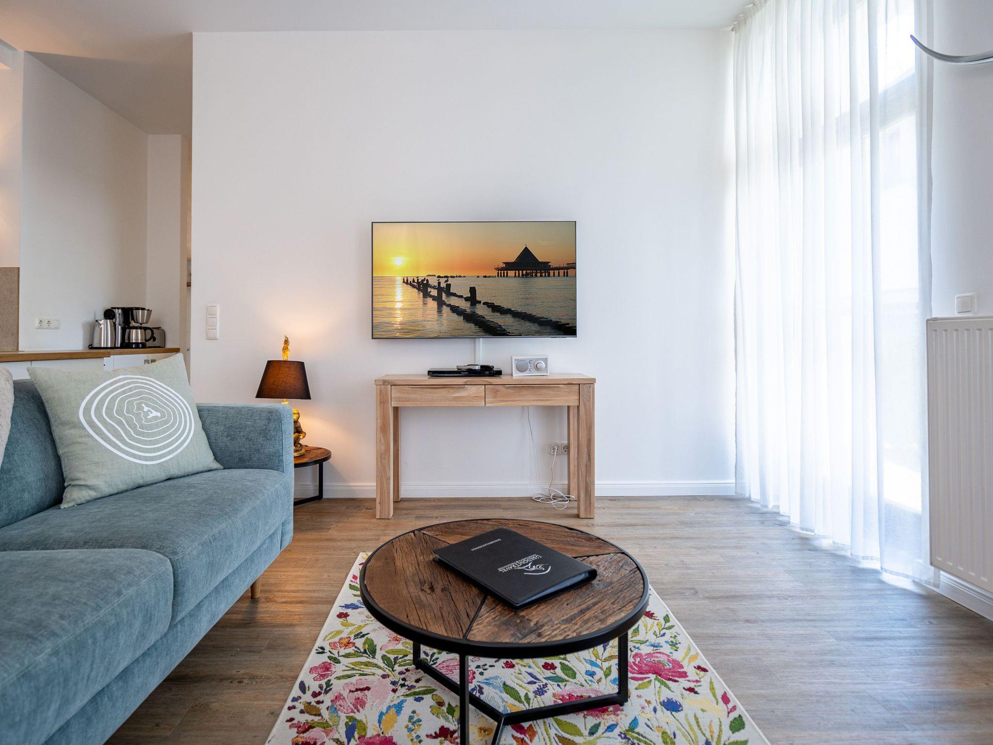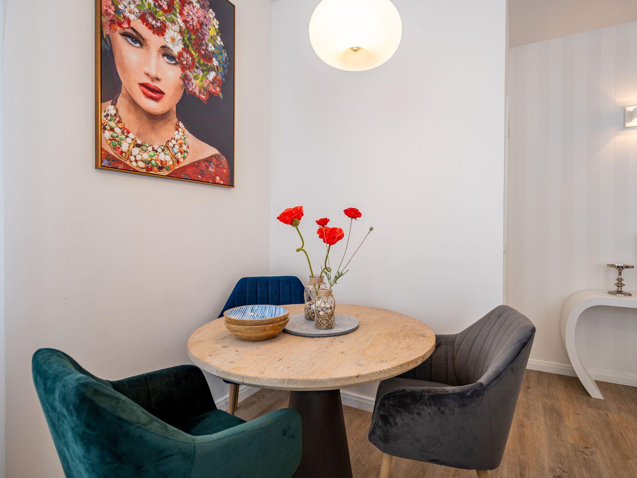 Möblierung mit Geschmack und Stil. Im Erdgeschoss des Hauses ( 57 qm) erwartet Sie diese modern gestaltete 2-Raum-Ferienwohnung für 2 Personen. In jeder Ecke Ihres Domizils lassen sich ausgesuchte Details entdecken, die Ihren Aufenthalt besonders gestalten. Genießen Sie gemütliche Stunden vor dem ( per Fernbedienung bedienbaren) Gas-Designkamin. An den Wohnbereich mit gemütlicher Couch und Flat-TV schließt sich die offene, komplett ausgestattete Küche und der Essbereich an. Von hier hat man Zugang zur Südterrasse. 1 Schlafzimmer mit Doppelbett und ein schönes Bad mit Dusche ergänzen die Räumlichkeiten. Ein Pkw-Stellplatz steht am Haus zur Verfügung. Für Ihren Komfort steht die Erstausstattung Wäsche ( Bettwäsche, 1 Duschtuch [&] 2 kleine Handtücher) für Sie bereit. Das WLAN-Netz im Haus kann kostenfrei genutzt werden.