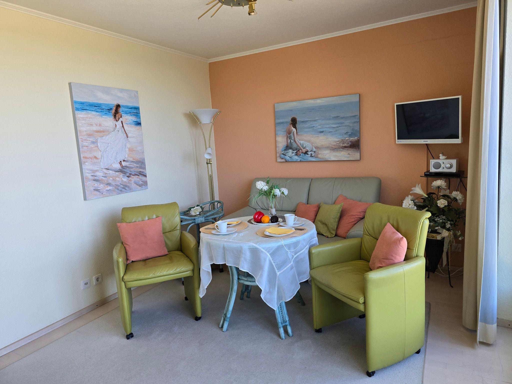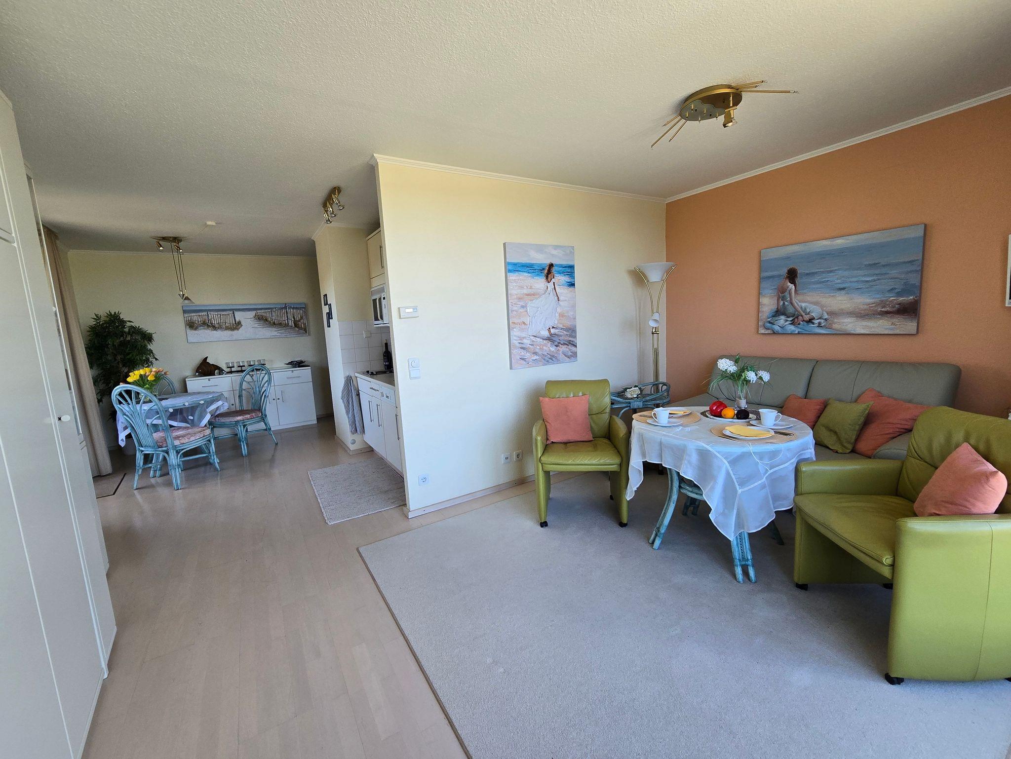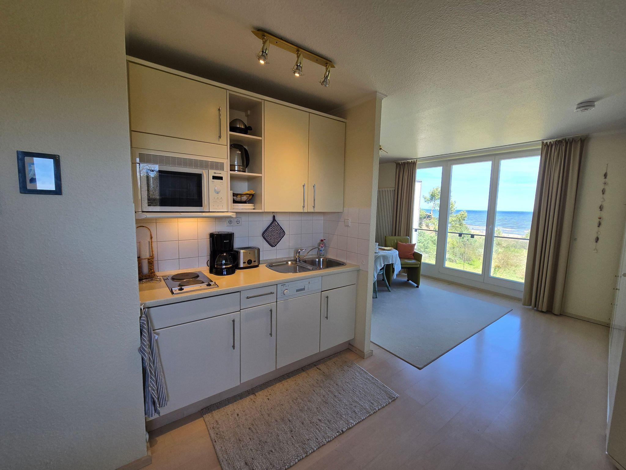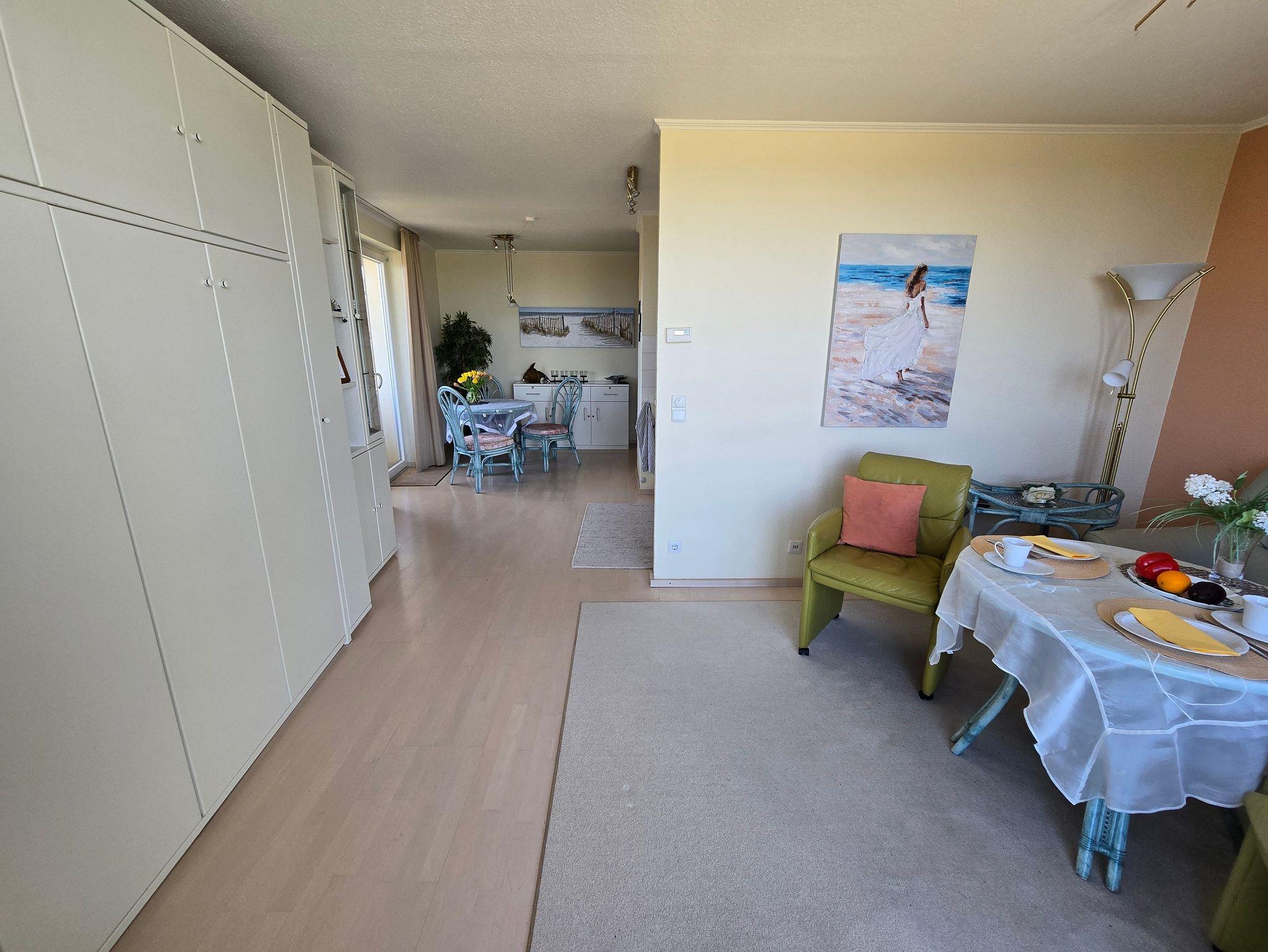 Komfortables, modernes NICHTRAUCHER-Appartement (40 qm) in der 3. Etage mit Balkon und einem herrlichen Meerblick. Ein kombin. Wohn-u. Schlafraum, einer Küchenzeile (mit Geschirrspüler, Mikrowelle, E-Herd, Kühlschrank, Kaffeemaschine etc.), W-Lan, Kabel-TV, kl. Radio, Safe sowie ein Bad mit DU/WC + Haarfön. Die Erstausstattung Bettwäsche und Handtücher ist inklusive.