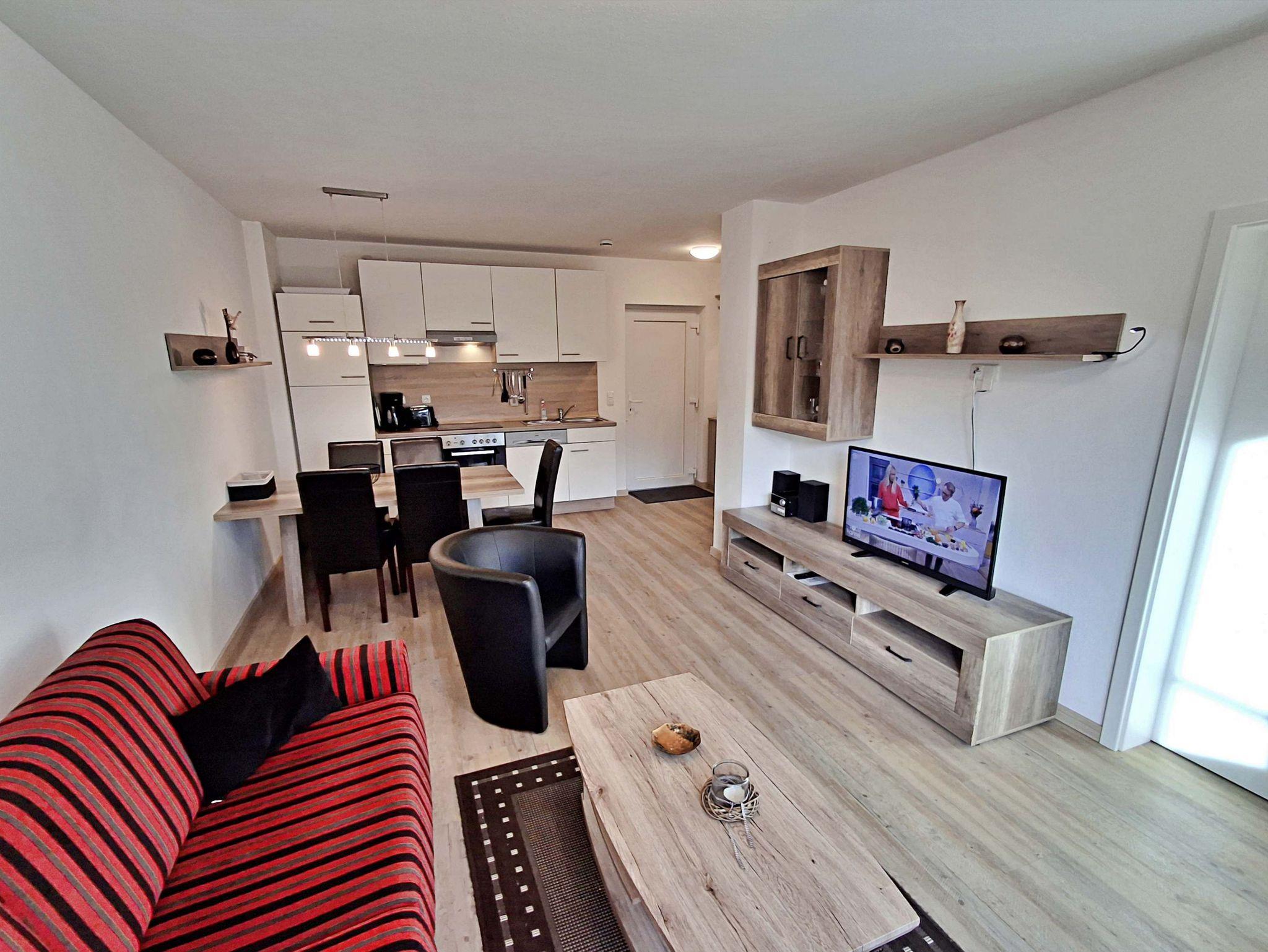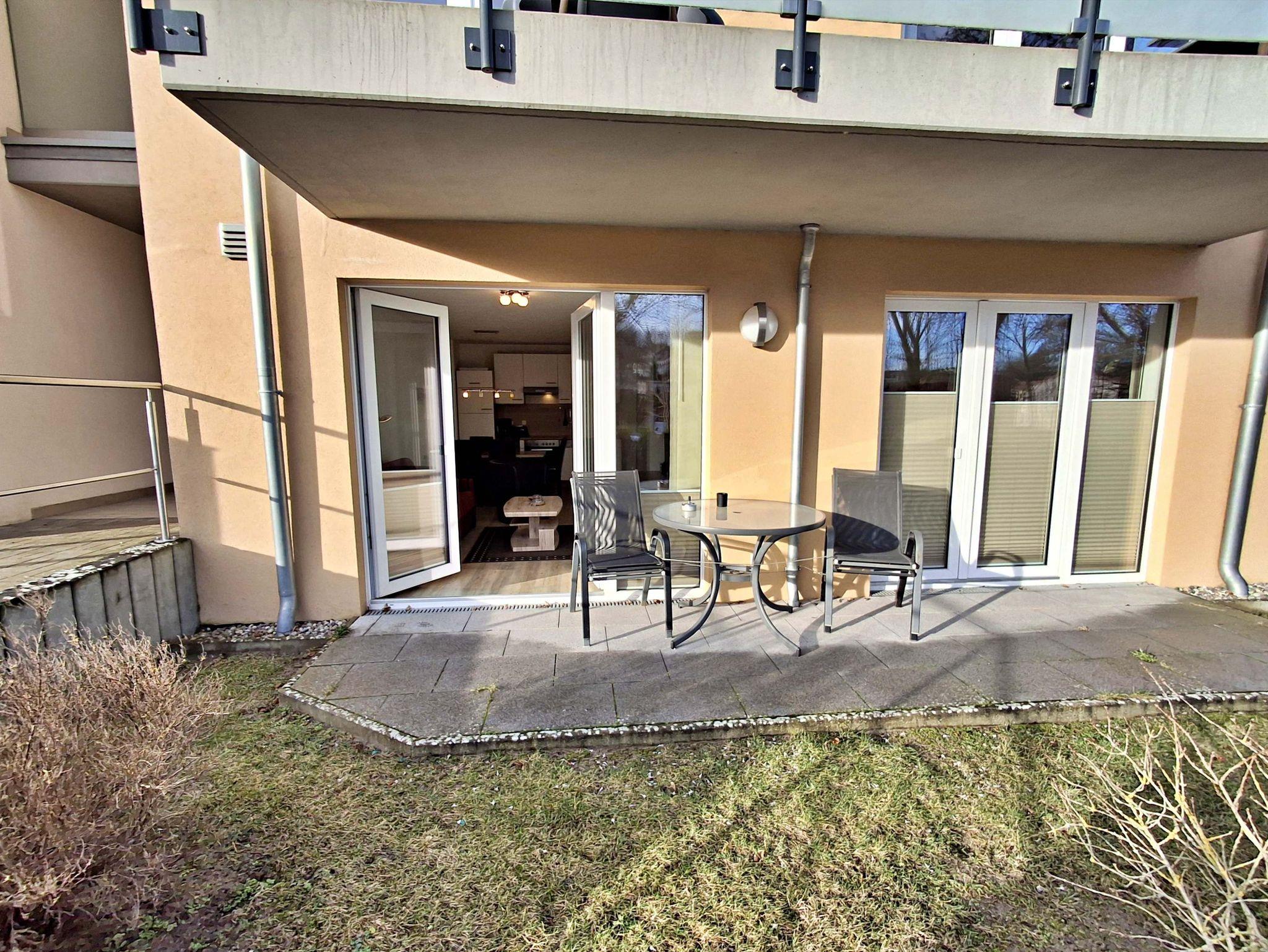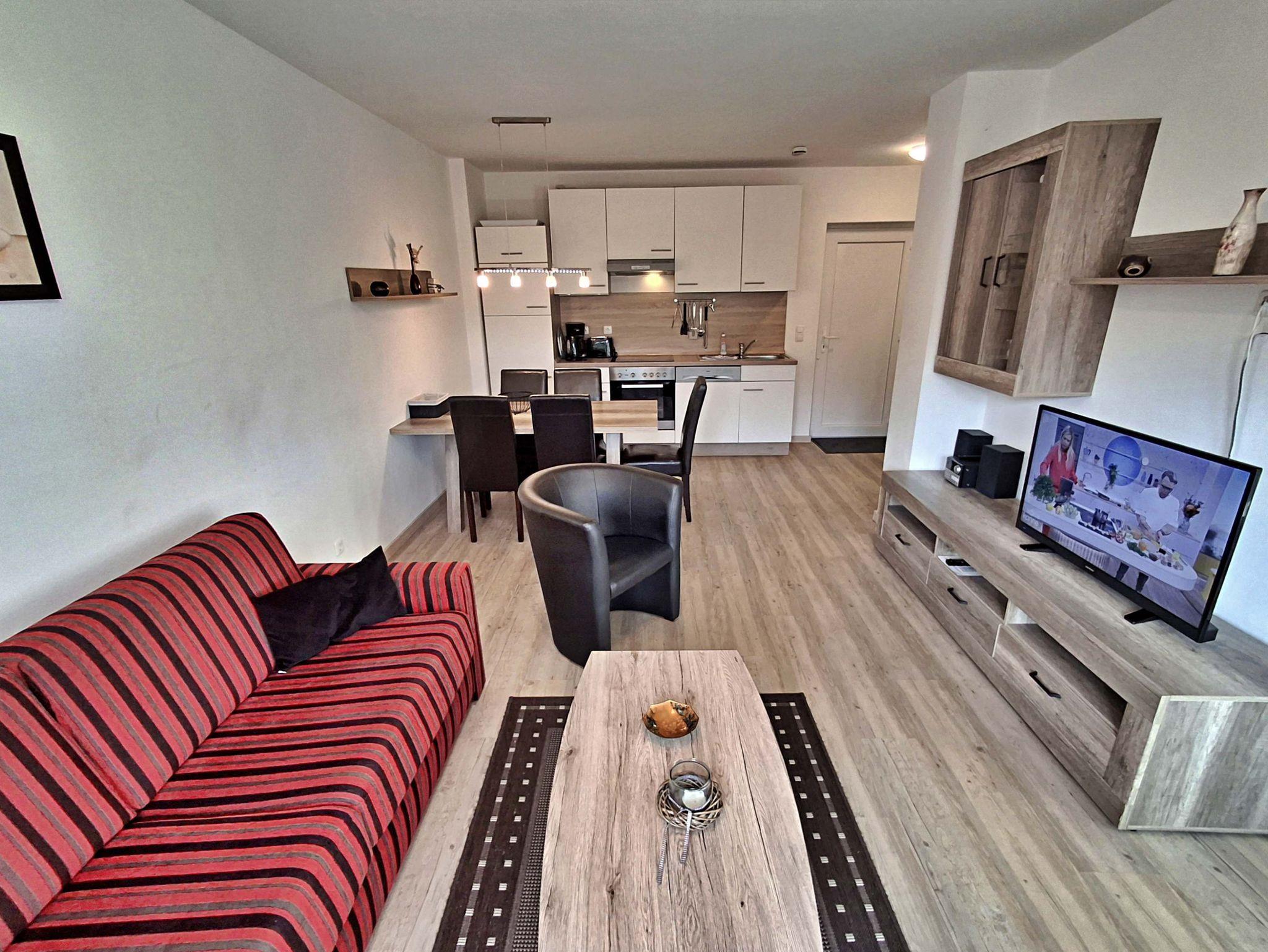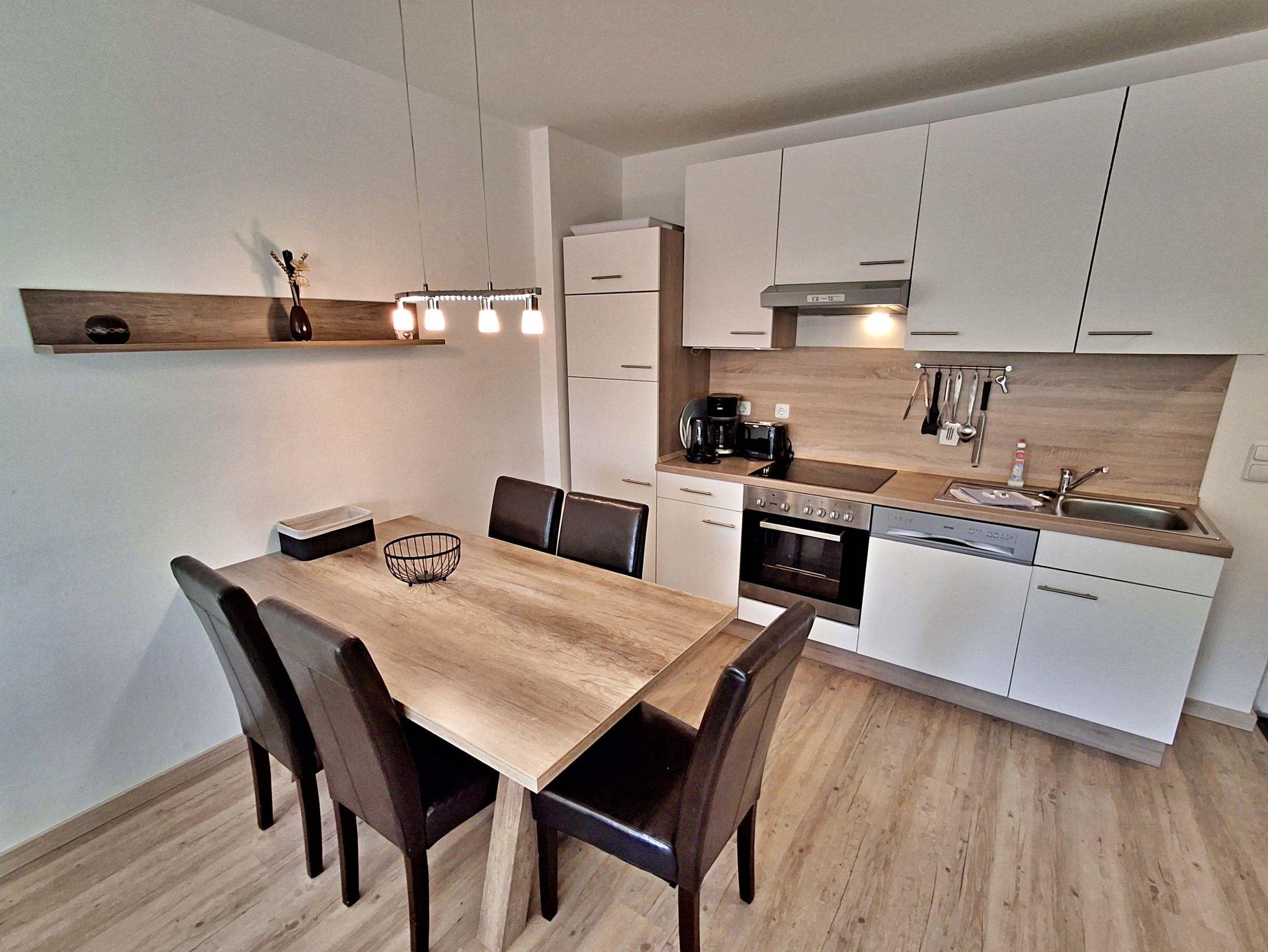Auf großzügigen 52 m² bietet dieses helle Appartement Platz für bis zu 5 Personen, die hier einen erholsamen und entspannten Urlaub verbringen können. Das moderne Wohnzimmer lädt mit einer gemütlichen Couch, die auch als Schlafcouch für 2 Personen dient, sowie einem Flachbild-TV und einer Musikanlage zum Verweilen ein. Der große Esstisch mit 5 Stühlen ist perfekt für gesellige Abende. In der komplett eingerichteten offenen Küche finden Sie alles, was Sie benötigen: einen Ceranherd, Backofen, Kühlschrank mit Tiefkühlfach, Geschirrspülmaschine, Kaffeemaschine, Toaster und Wasserkocher - hier wird das Kochen zum Vergnügen! Das Hauptschlafzimmer ist mit einem komfortablen Boxspringbett und einem Kleiderschrank ausgestattet, während das zweite Schlafzimmer ein Einzelbett und ebenfalls einen Kleiderschrank bietet. Genießen Sie den Zugang zur großzügigen Terrasse sowohl vom Wohnbereich als auch vom Hauptschlafzimmer. Hier können Sie morgens bei einer Tasse Kaffee entspannen oder den Abend bei einem Glas Wein ausklingen lassen. Ein Stellplatz am Haus und ein abschließbarer Fahrradraum runden das Angebot ab und sorgen dafür, dass es Ihnen an nichts fehlt. WLAN steht Ihnen selbstverständlich in der gesamten Wohnung kostenfrei zur Verfügung.