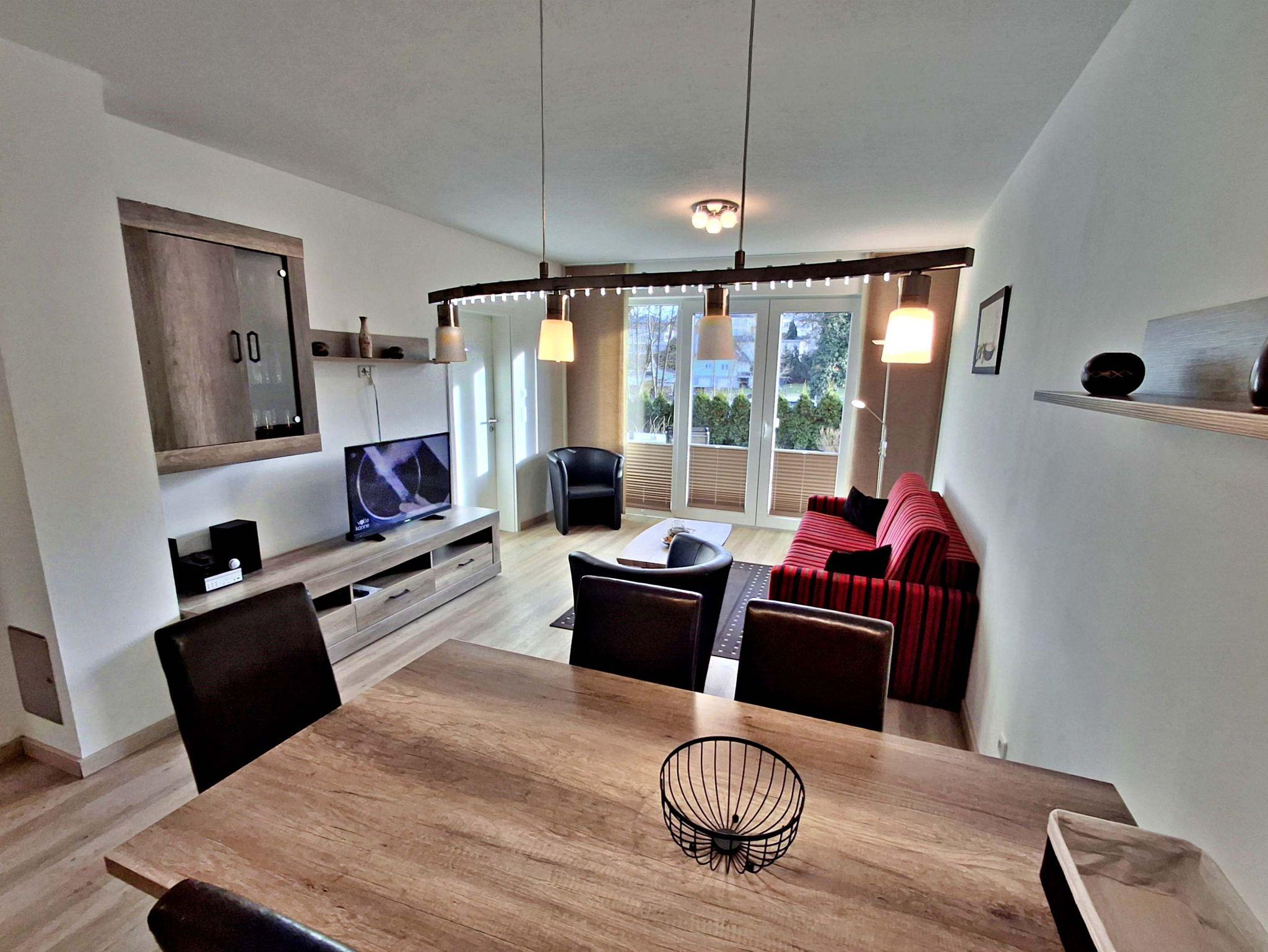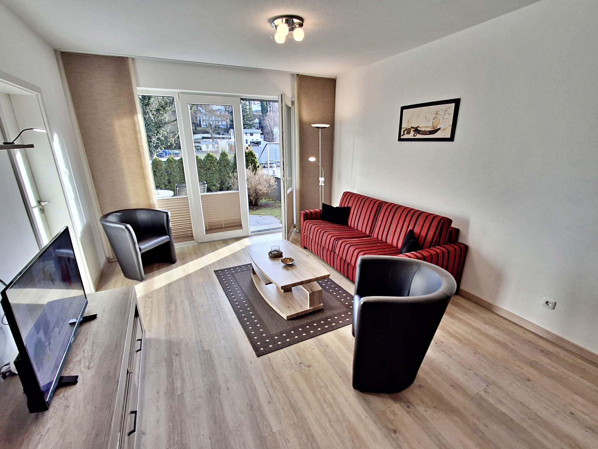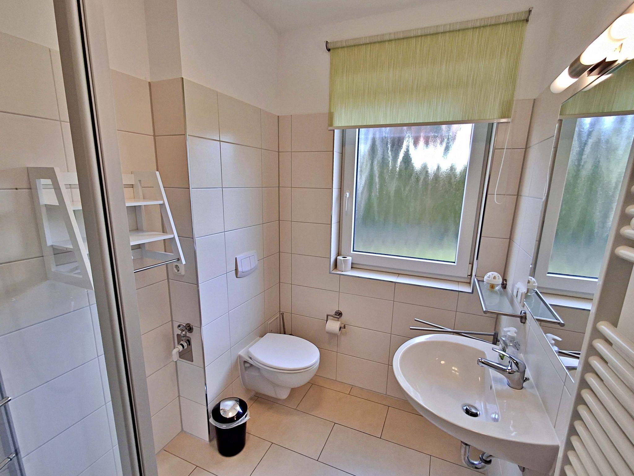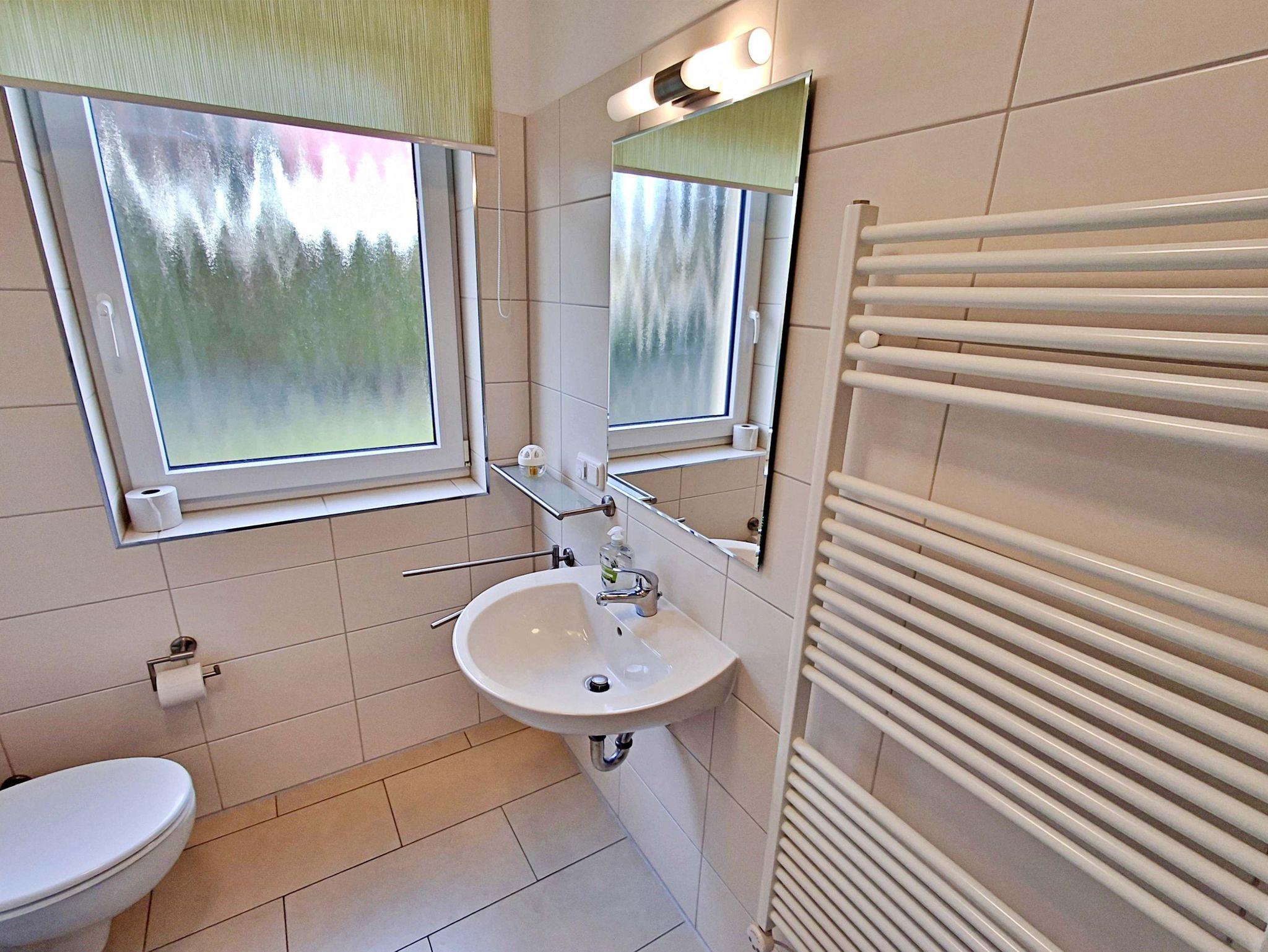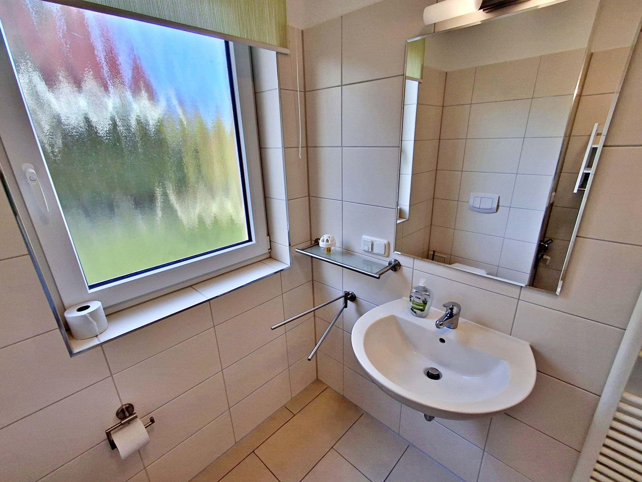 Auf großzügigen 52 m² bietet dieses helle Appartement Platz für bis zu 5 Personen, die hier einen erholsamen und entspannten Urlaub verbringen können. Das moderne Wohnzimmer lädt mit einer gemütlichen Couch, die auch als Schlafcouch für 2 Personen dient, sowie einem Flachbild-TV und einer Musikanlage zum Verweilen ein. Der große Esstisch mit 5 Stühlen ist perfekt für gesellige Abende. In der komplett eingerichteten offenen Küche finden Sie alles, was Sie benötigen: einen Ceranherd, Backofen, Kühlschrank mit Tiefkühlfach, Geschirrspülmaschine, Kaffeemaschine, Toaster und Wasserkocher - hier wird das Kochen zum Vergnügen! Das Hauptschlafzimmer ist mit einem komfortablen Boxspringbett und einem Kleiderschrank ausgestattet, während das zweite Schlafzimmer ein Einzelbett und ebenfalls einen Kleiderschrank bietet. Genießen Sie den Zugang zur großzügigen Terrasse sowohl vom Wohnbereich als auch vom Hauptschlafzimmer. Hier können Sie morgens bei einer Tasse Kaffee entspannen oder den Abend bei einem Glas Wein ausklingen lassen. Ein Stellplatz am Haus und ein abschließbarer Fahrradraum runden das Angebot ab und sorgen dafür, dass es Ihnen an nichts fehlt. WLAN steht Ihnen selbstverständlich in der gesamten Wohnung kostenfrei zur Verfügung.