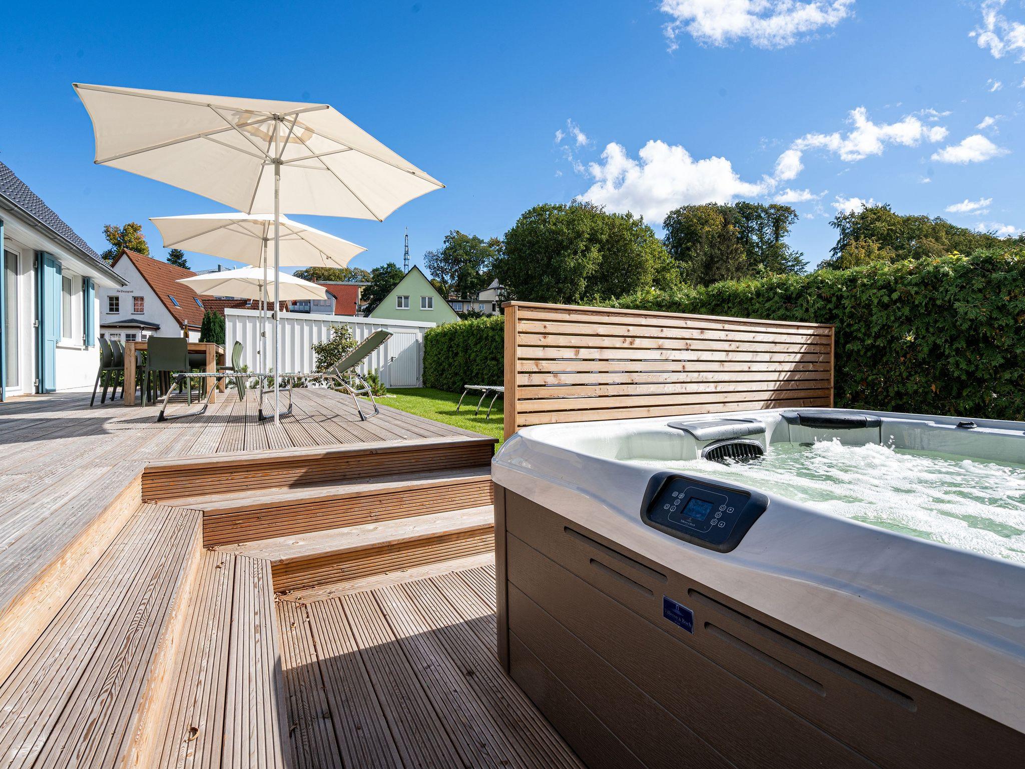 Unweit vom Strand liegt das Ferienhaus ?Das Strandod? wie ein Juwel in der Strandstraße im schönen Seebad Heringsdorf. Modernes Design und helle Farben sorgen für ein luxuriöses Strandhausfeeling. Über 2 Etagen erstrecken sich die insgesamt 170qm. Die durchdachte Raumaufteilung der insgesamt 5 Schlafzimmer und 3 Bäder macht dieses Objekt zum idealen Aufenthaltsort für Ihre Reise mit Freunden oder der Familie. Der offene Wohn-Essbereich im Erdgeschoss für bis zu 10 Erwachsenen [&] 2 Kinder bis 15 Jahre lädt zum gemeinsamen Verweilen ein. Neben Flat-TV und Sonoro Musikanlage mit CD-Player, Streaming und Radio wurde auch an einen gemütlichen Holzkamin gedacht. Stilvolle Möbel und dezente Design-Accessoires gepaart mit wenigen Farbtupfern perfektionieren die exklusive Inneneinrichtung im Erdgeschoss. In der voll ausgestatteten, modernen Küche stehen Ihnen hochwertige Markengeräte (Kühlschrank, Induktionskochfeld und Geschirrspülmaschine) zur Verfügung. Hier finden Sie außerdem zwei Backöfen, davon einer mit Mikrowellenfunktion, und diverse Kleinküchengeräte (darunter 2 Kaffeemaschinen sowie einer zusätzliche Nespresso-Kapselmaschine). Für das perfekte Klima für Ihre Weine sorgt ein extra Weinkühlschrank. Genießen Sie die Vorzüge der großzügigen Sonnenterrasse, die bequem von Wohnzimmer und Küche begehbar ist. Bis zu 12 Personen finden am einzigartigen Holztisch an gemeinsamen Grillabenden Platz. Ein Holzkohlengrill steht Ihnen ebenfalls zur Verfügung. Sonnenliegen und ein Außen-Whirlpool komplettieren die exklusive Außenanlage. Ebenfalls im Untergeschoss gelegen sind zwei der fünf Schlafzimmer, die jeweils mit einem Boxspringbett (1,80m x 2,00m), Flat-TV und Einbauschrank ausgestattet sind. Für 1 Kleinkind steht Ihnen außerdem ein Babyreisebett soweit 1 Hochstuhl im Hauswirtschaftsraum bereit. Das Masterbad mit freistehender Badewanne, Dusche, Waschtisch und WC mit Bidet-Brause rundet diese Etage ab. Drei weitere Schlafzimmer im Obergeschoss mit Boxspringbetten (1,80m x 2,00m), Einbauschränken und Flat-TVs versprechen höchsten Schlafkomfort während Ihres Aufenthaltes. Besonders praktisch sind die beiden Bäder mit Dusche, Waschtisch und WCs mit Bidet-Brausen auf der selben Etage - perfekt für Ihren Urlaub mit mehreren Reisenden. Das Highlight im Obergeschoss bildet der separate Relaxraum mit Relaxsesseln, zwei kleinen Kühlschränken, einer Sonoro-Streaming Anlage sowie einer Holzsauna für bis zu 4 Personen. Damit Sie auch im Urlaub nicht auf Waschkomfort verzichten müssen, verfügt das Ferienhaus über eine Waschmaschine und einen Trockner. Mit 4 PKW-Stellplätzen sowie einem Stellplatz in der Doppelgarage sind ausreichend Parkmöglichkeiten vorhanden. Für Ihr E-Auto steht eine E-Ladesäule (kostenpflichtig) zur Verfügung. Reisende mit Fahrrädern können diese in der zweiten Hälfte der Doppelgarage einschließen. Für einen komfortablen Start in Ihren Urlaub sind die Betten bei Anreise bezogen und Handtücher liegen für Sie bereit. Kostenfreies WLAN komplettiert das Ferienhaus ?Das Strandod?.