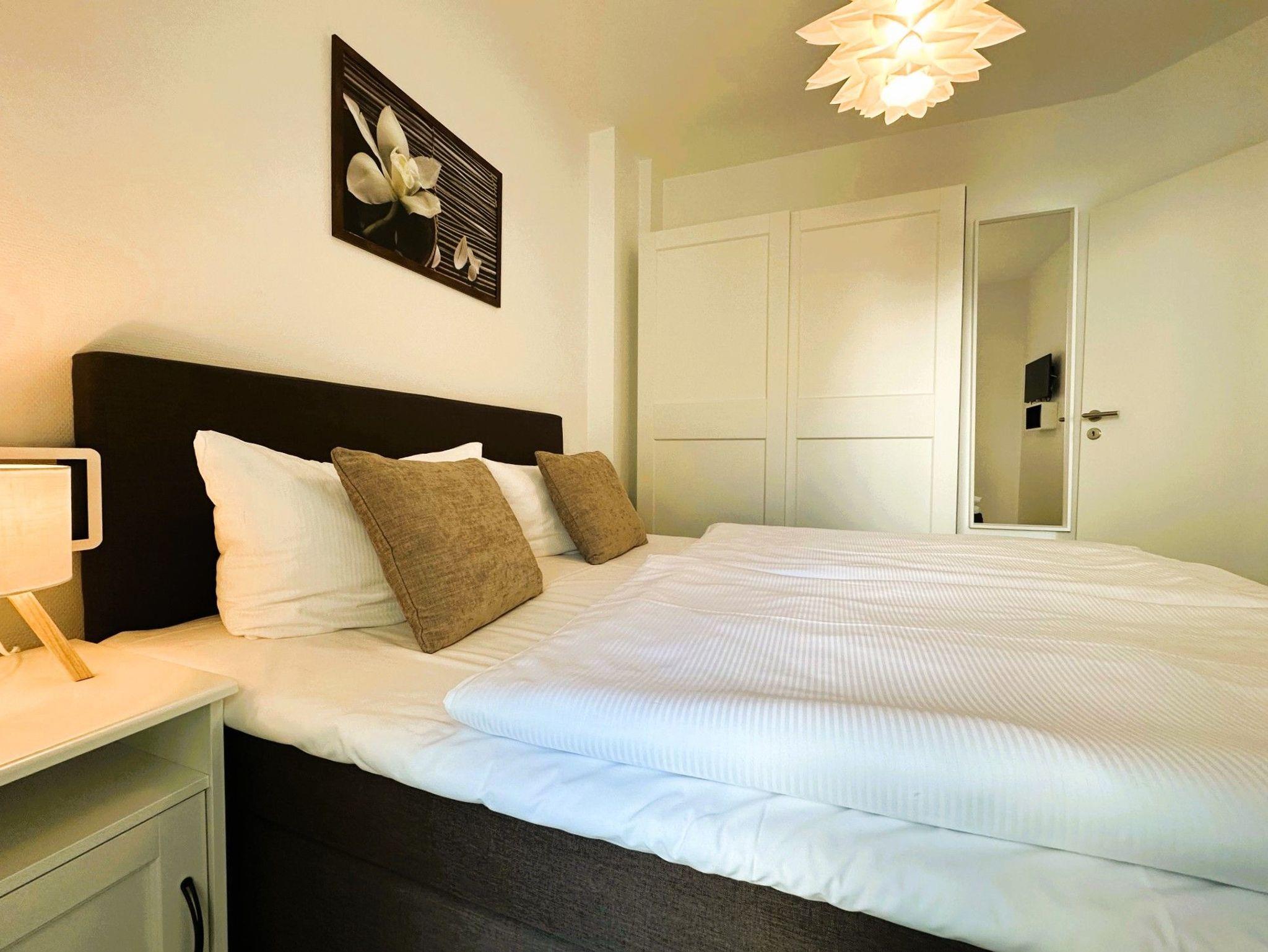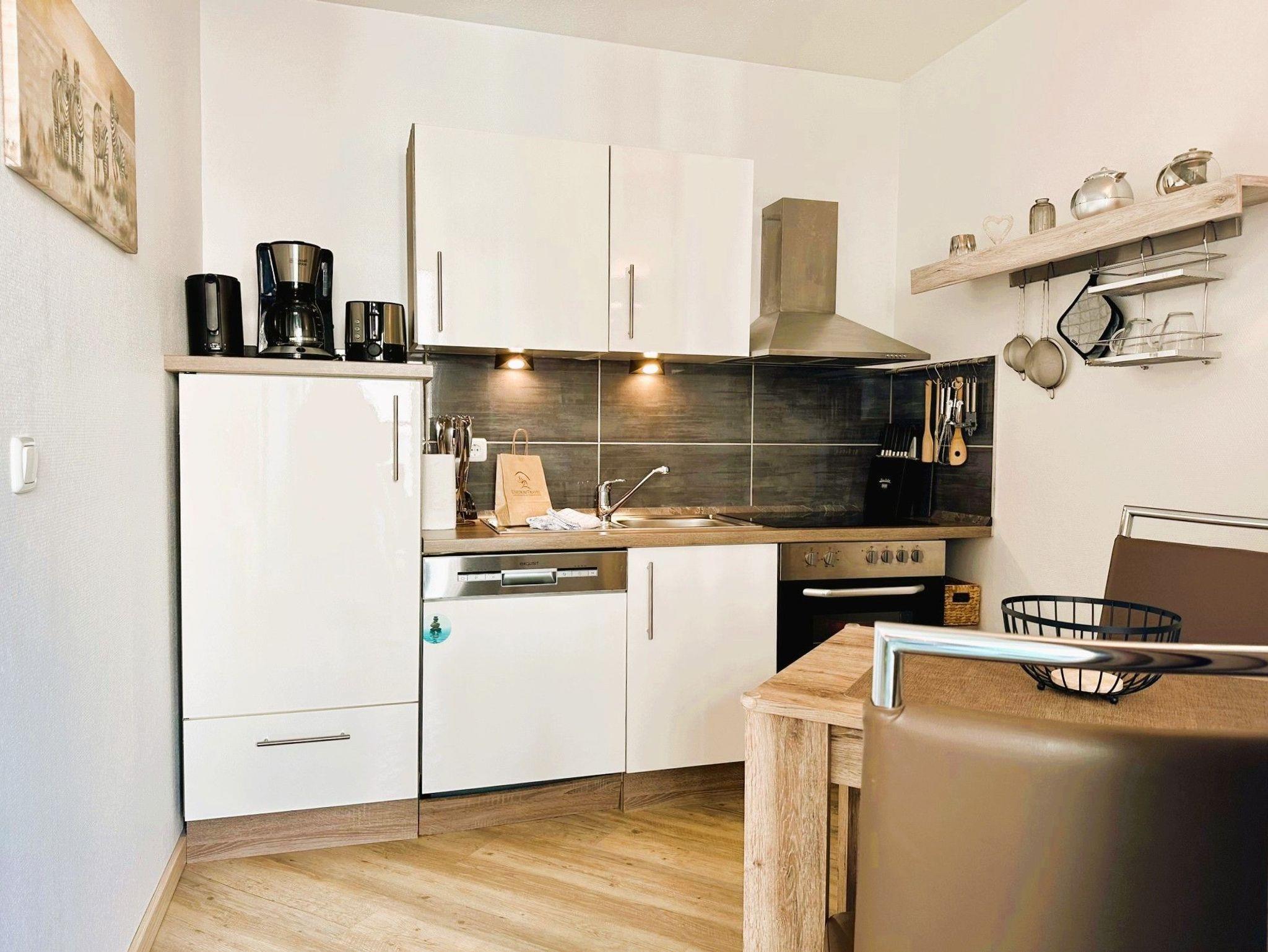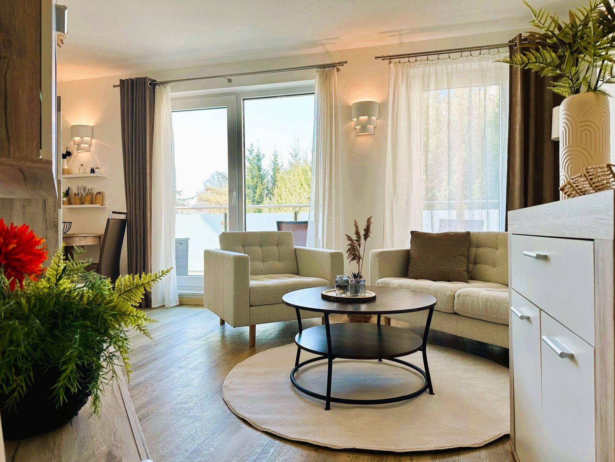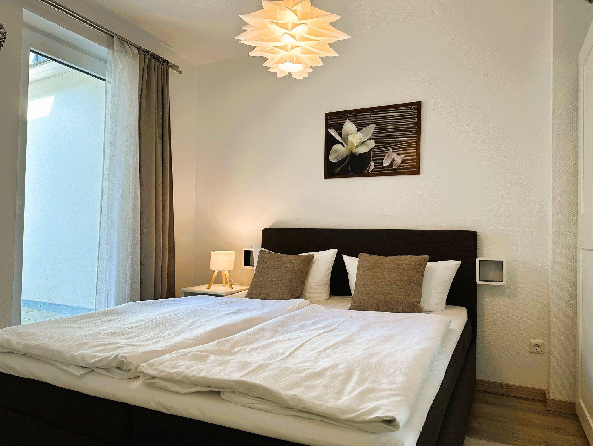 Das Appartement 10 in der Villa Bettina im 2. Obergeschoss ist ein idealer Ort für Entspannung und Regeneration. Die 46 Quadratmeter große Wohnung bietet viel Platz und modernen Wohnkomfort. Das Wohn-Esszimmer ist offen gestaltet und sorgt für eine entspannte Atmosphäre. Große Fenster lassen viel Licht herein und führen zu einem sonnigen Südwest-Balkon. Hier können Mahlzeiten am Esstisch oder auf der gemütlichen Sitzgruppe vor dem Flat-TV eingenommen werden. Die offene Küchenzeile ist stilvoll eingerichtet und verfügt über moderne Geräte und ausreichend Geschirr. Im gemütlichen Schlafzimmer befindet sich ein bequemes Boxspringdoppelbett und ausreichend Stauraum. Auch hier gibt es einen Flat-TV und einen eigenen Balkon mit Sonnenliege. Das Badezimmer verfügt über einen Waschtisch, WC und eine großzügige Regendusche. Ein Parkplatz für das Auto befindet sich direkt am Haus. Bei der Ankunft sind die Betten bereits bezogen und Handtücher liegen bereit, um Ihnen den Aufenthalt so angenehm wie möglich zu machen.